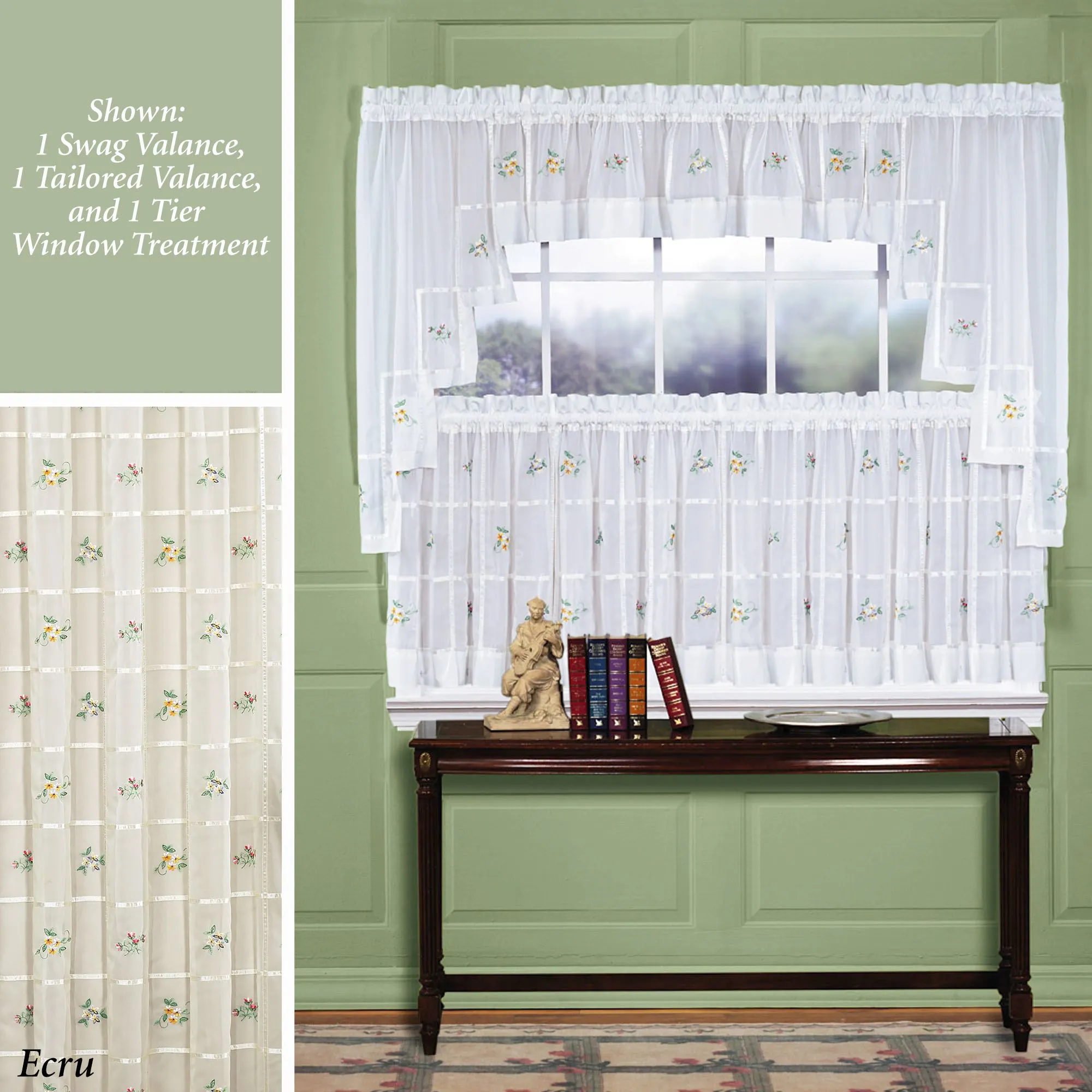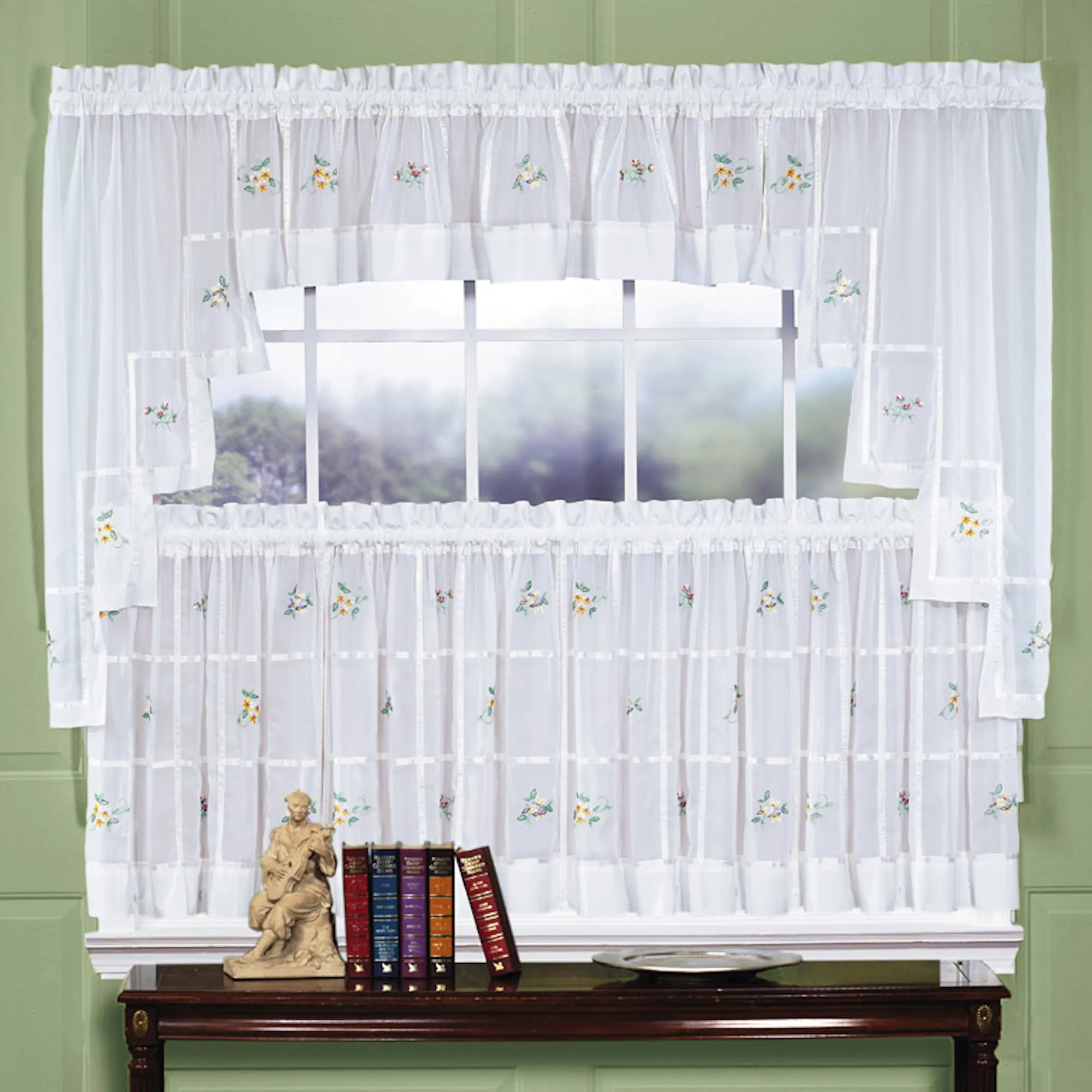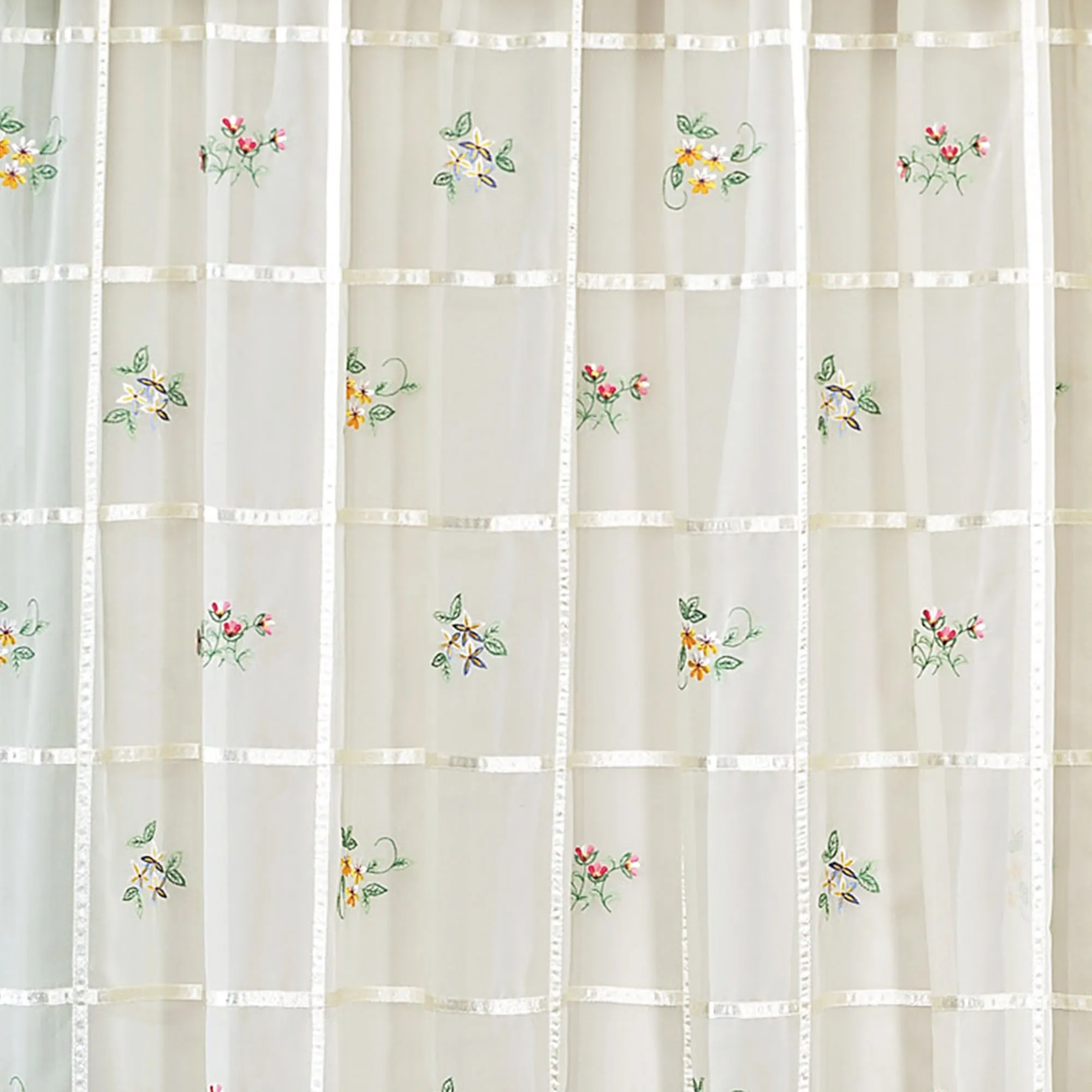 Satin ribbons in a square pattern create an elegant look for the embroidered Mini Florals. Sheer polyester tier window treatment includes colors of white, yellow, blue, green, rosewood, and pink. Bottom edges have solid color trim. Rod pocket is 1.5". Tier Pair is still available. Washable. Imported.