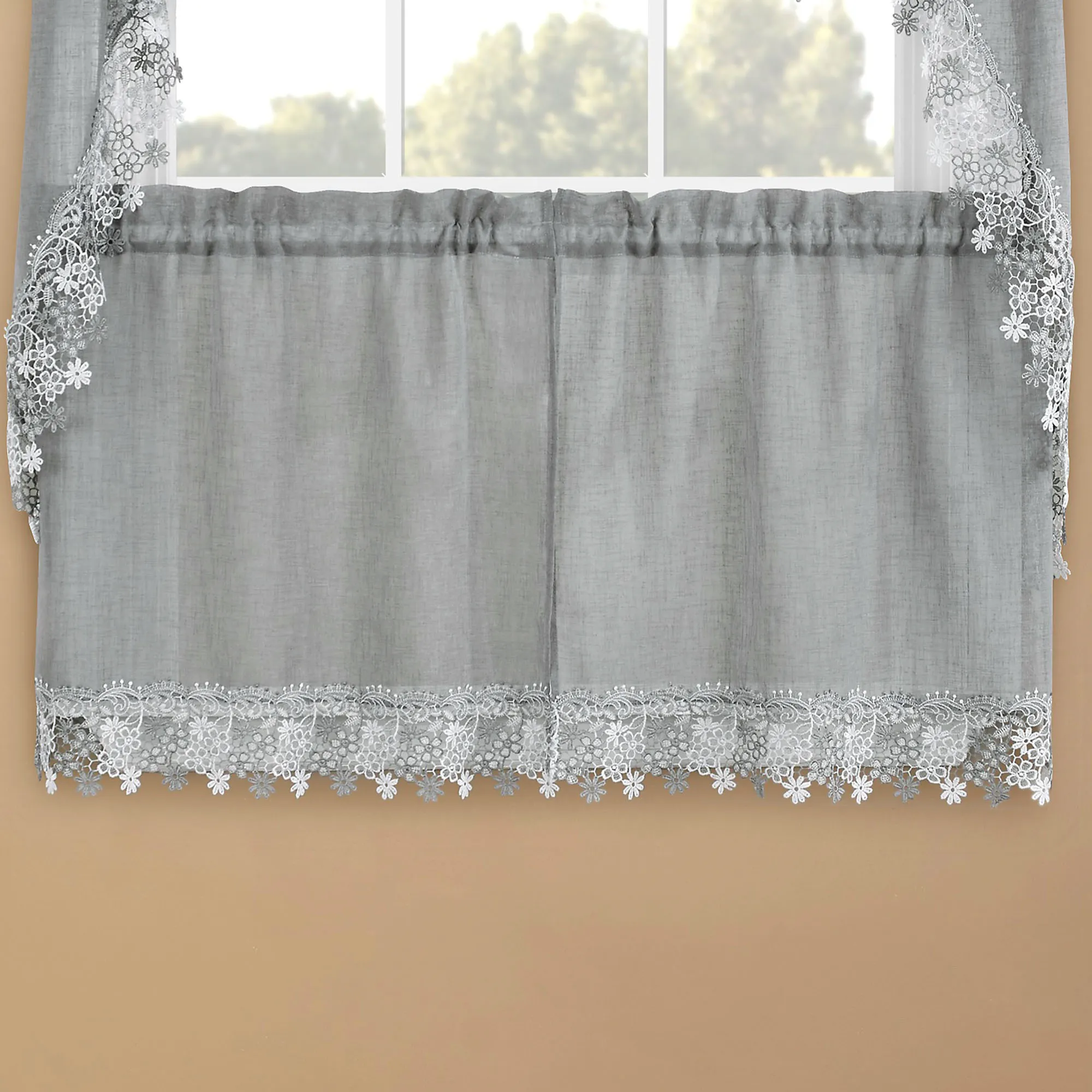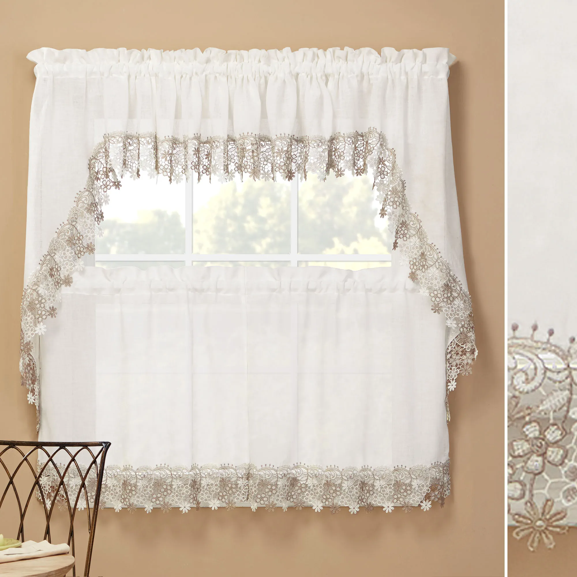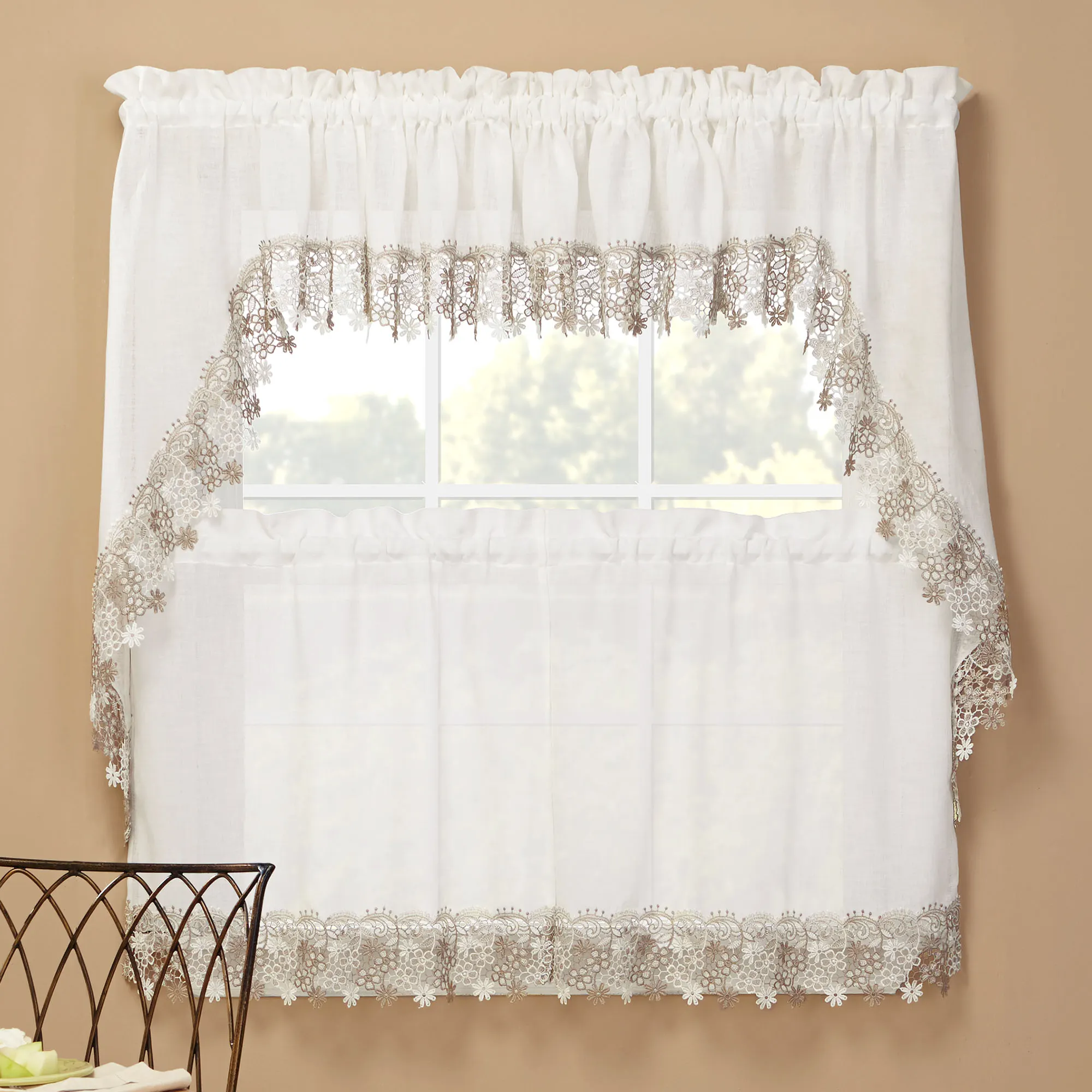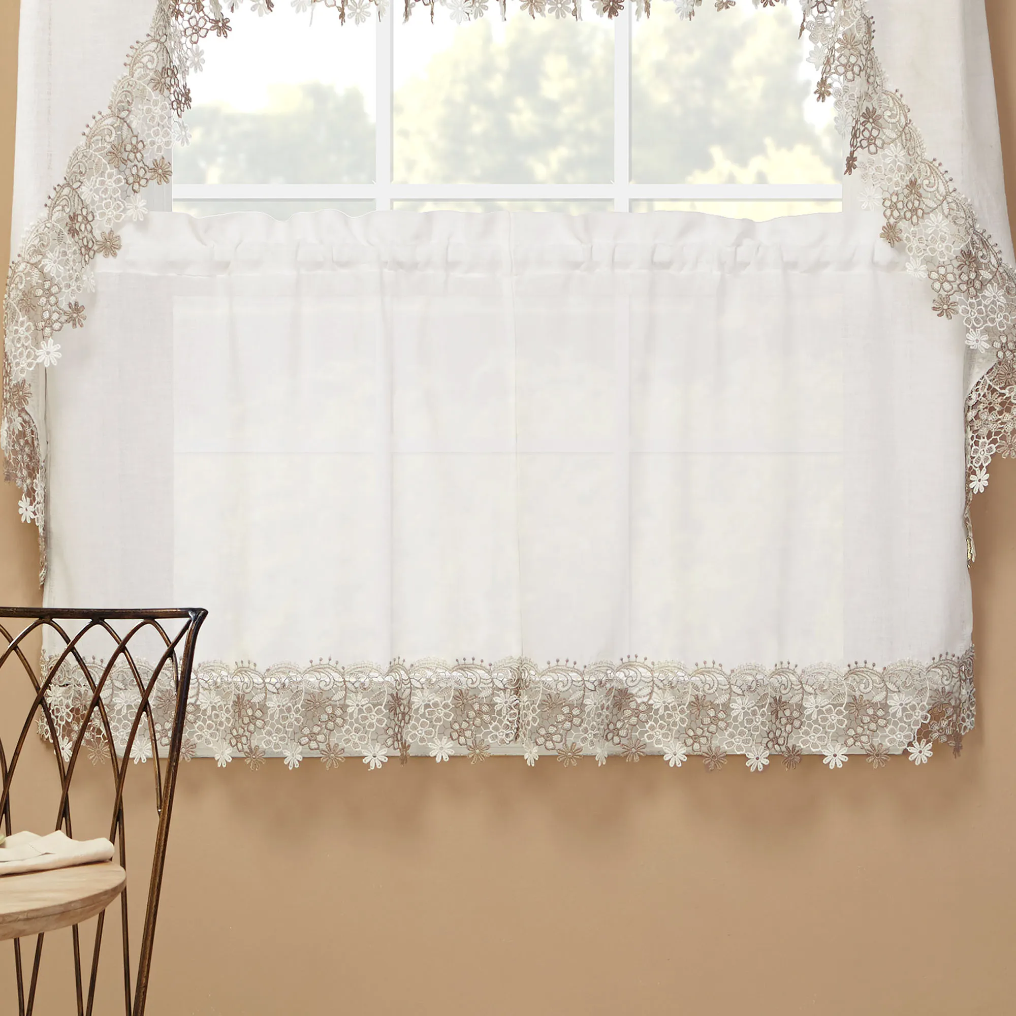 Darling floral macrame trims the Misha Tier Window Treatment for a sweet and dainty appeal. Each semi-sheer, solid color faux linen polyester accent features a scrolling floral lace edge. Rod pockets measure 1.5". Specify Tier Pair, 56"W; Swag Valance Pair, 56"Wx38"L; or Insert Valance, 58"Wx12"L. Machine washable. Imported.