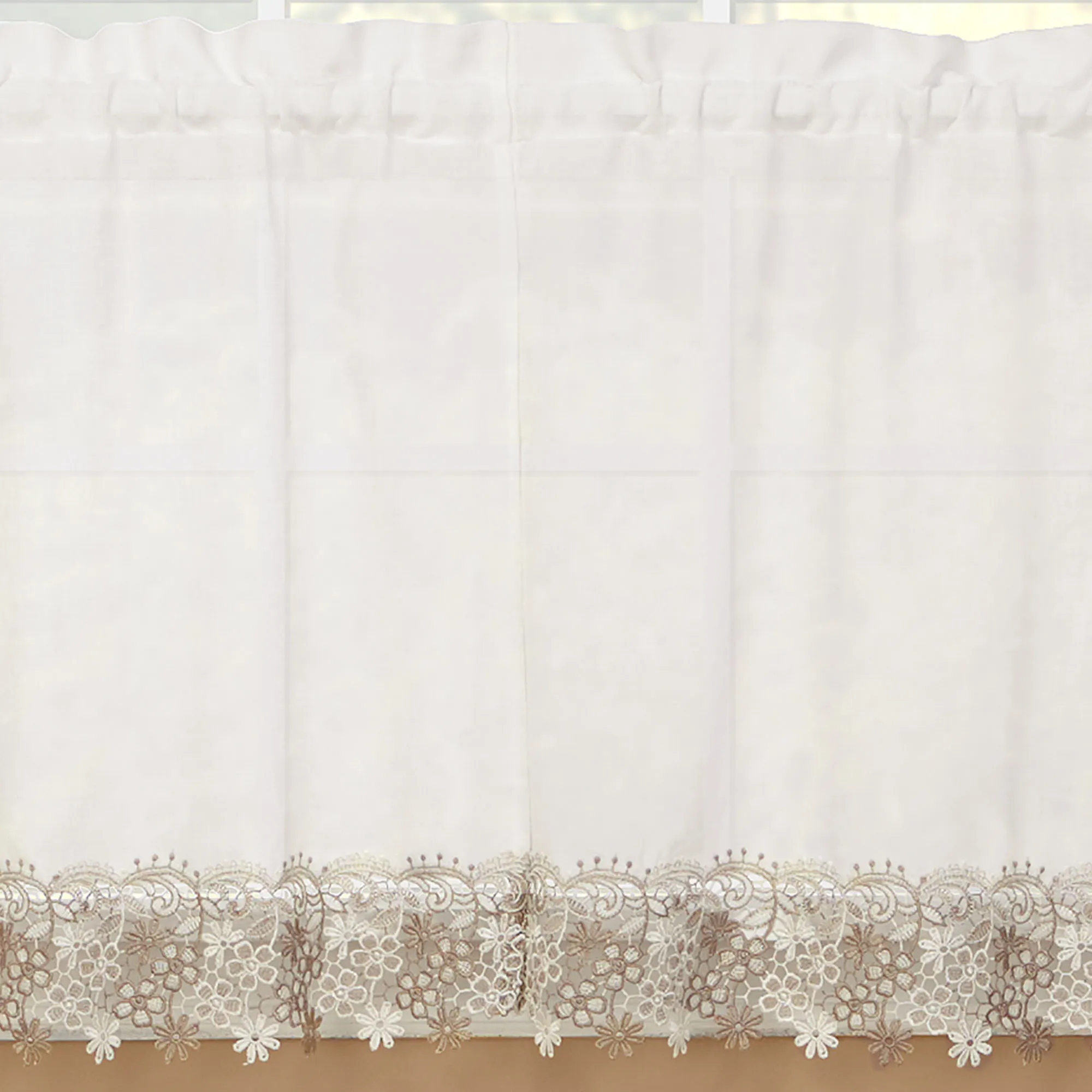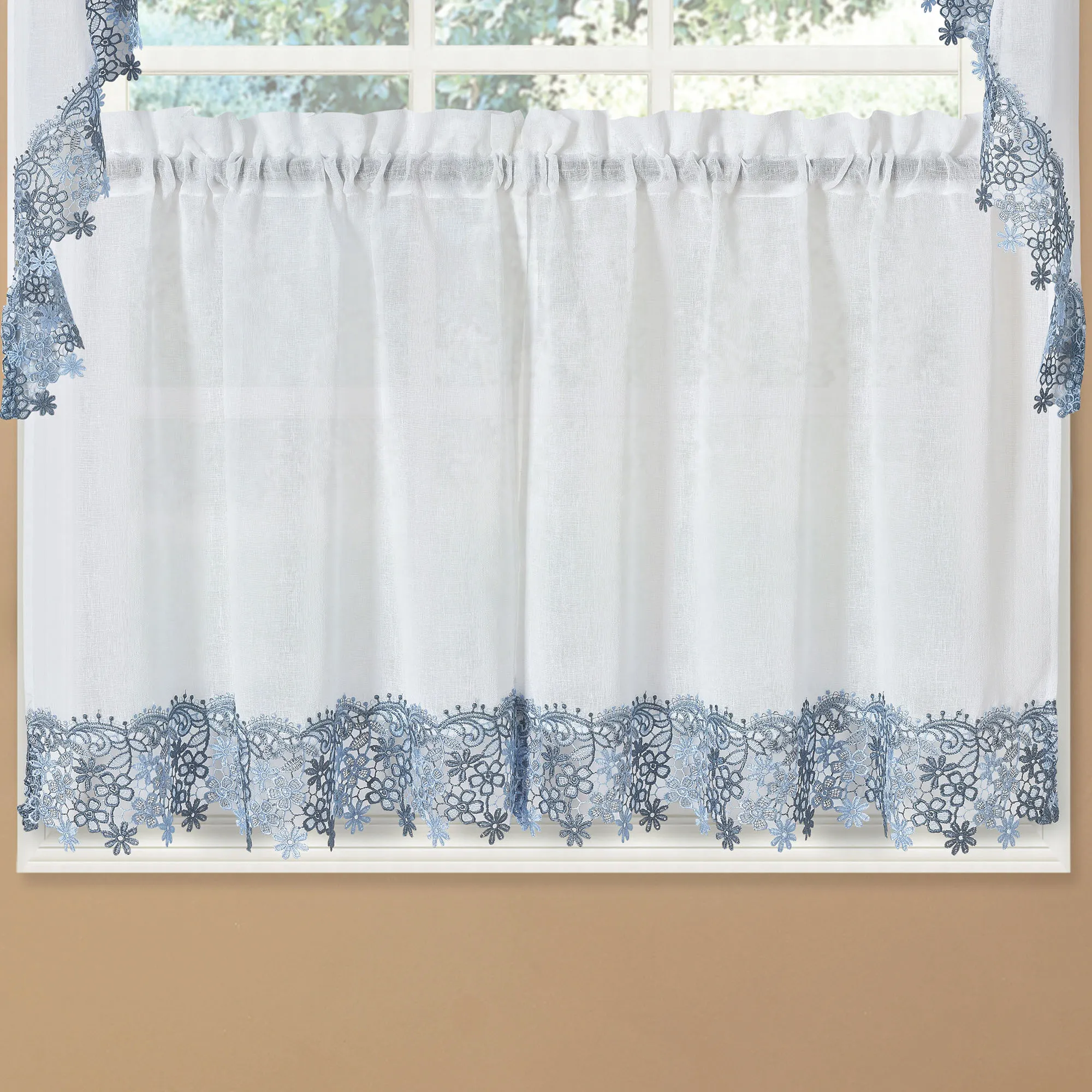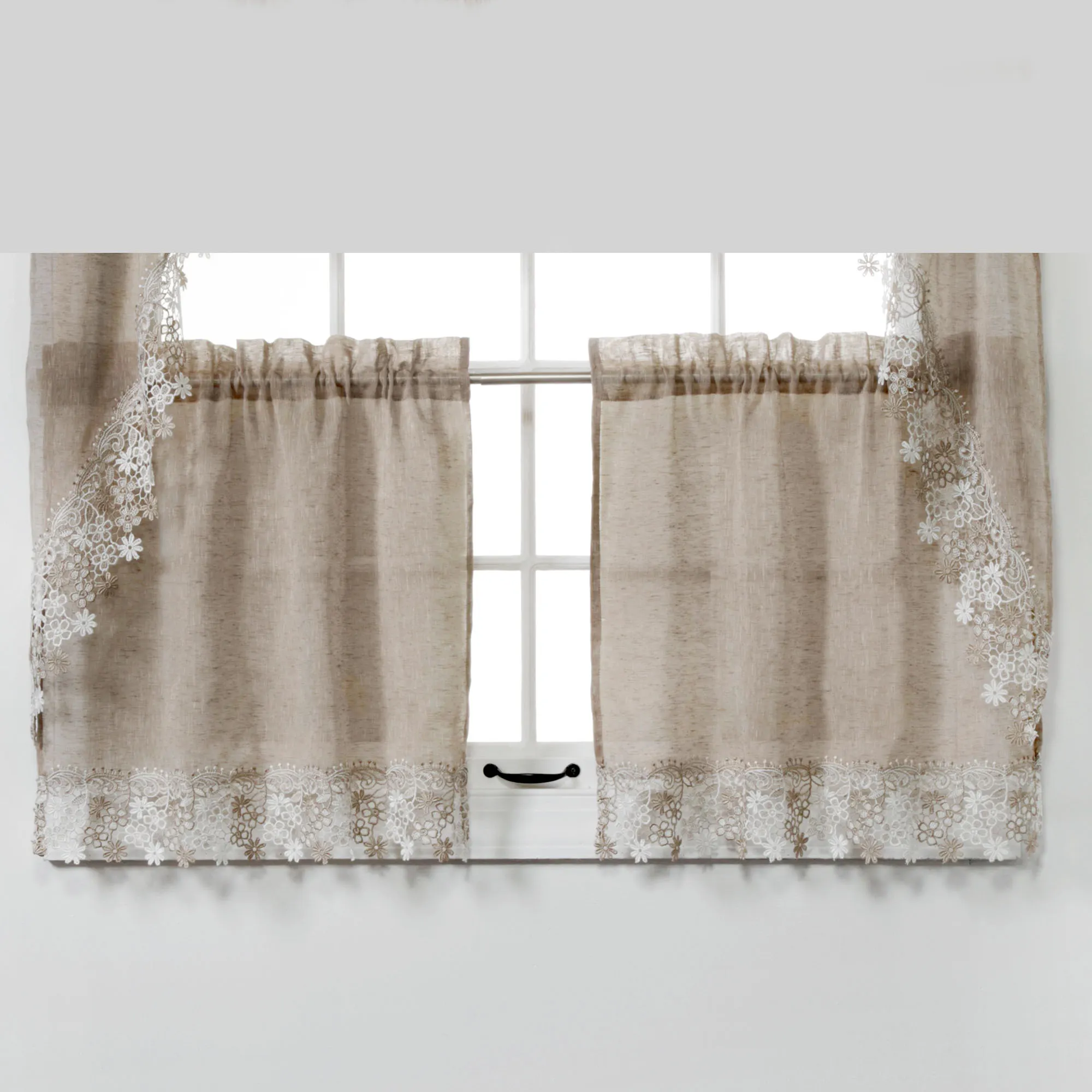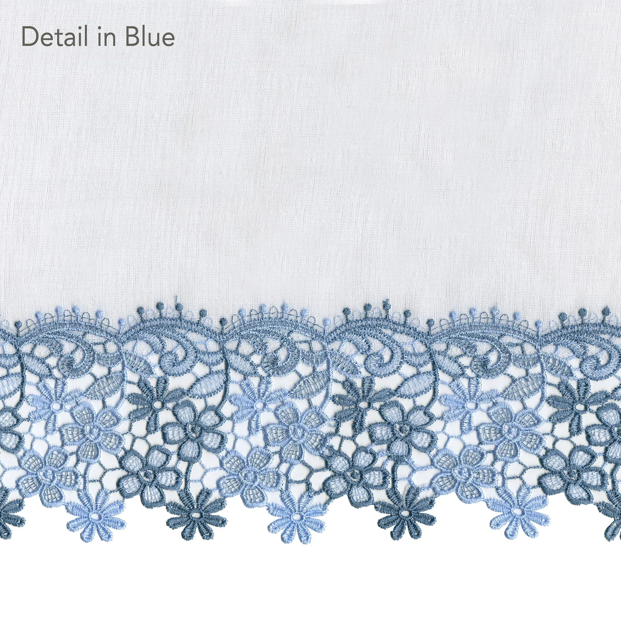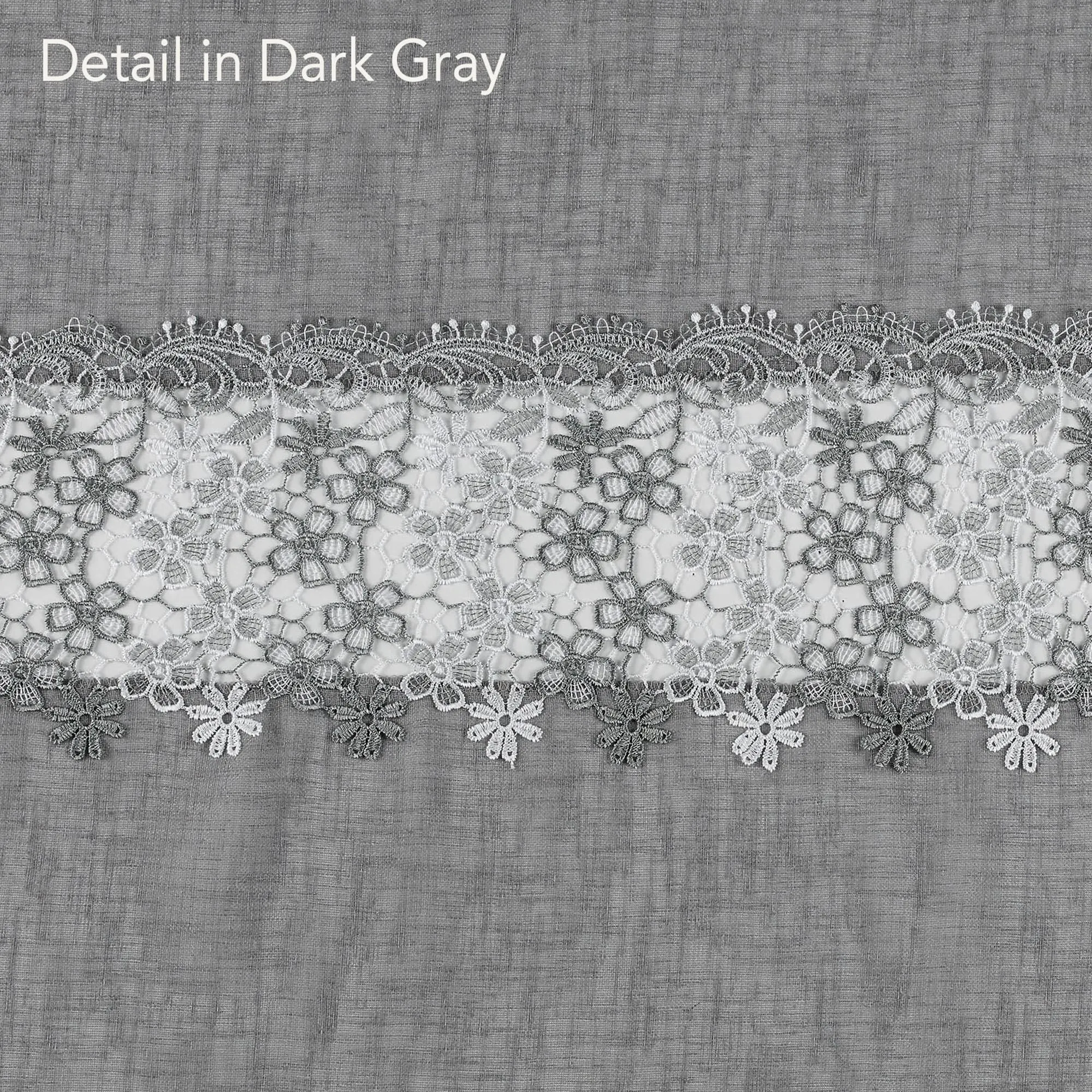 Darling floral macrame trims the Misha Tier Window Treatment for a sweet and dainty appeal. Each semi-sheer, solid color faux linen polyester accent features a scrolling floral lace edge. Rod pockets measure 1.5". Specify Tier Pair, 56"W; Swag Valance Pair, 56"Wx38"L; or Insert Valance, 58"Wx12"L. Machine washable. Imported.