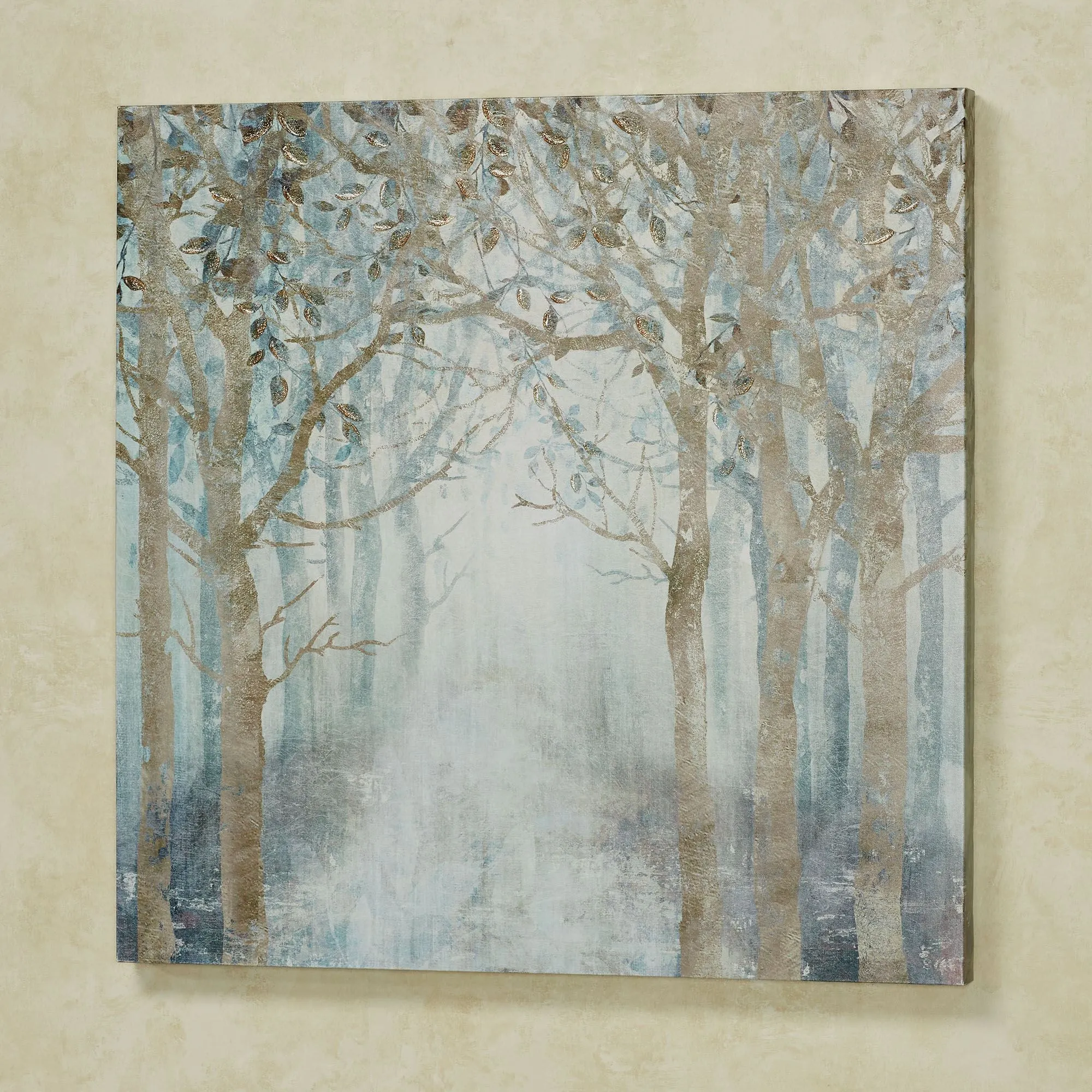 Sunlight filters through these tall trees for an early morning Misty Sunrise. This giclee on canvas wall art features a stunning nature scene in the muted colors of blue green, light teal, seafoam, aqua mist, and tan. Some leaves have clear gel and glitter embellishments. Canvas is gallery-wrapped around a wood frame. Tree wall art measures 32"sq.x2"D.