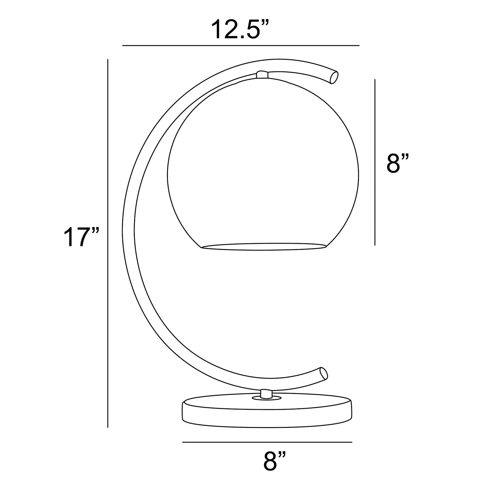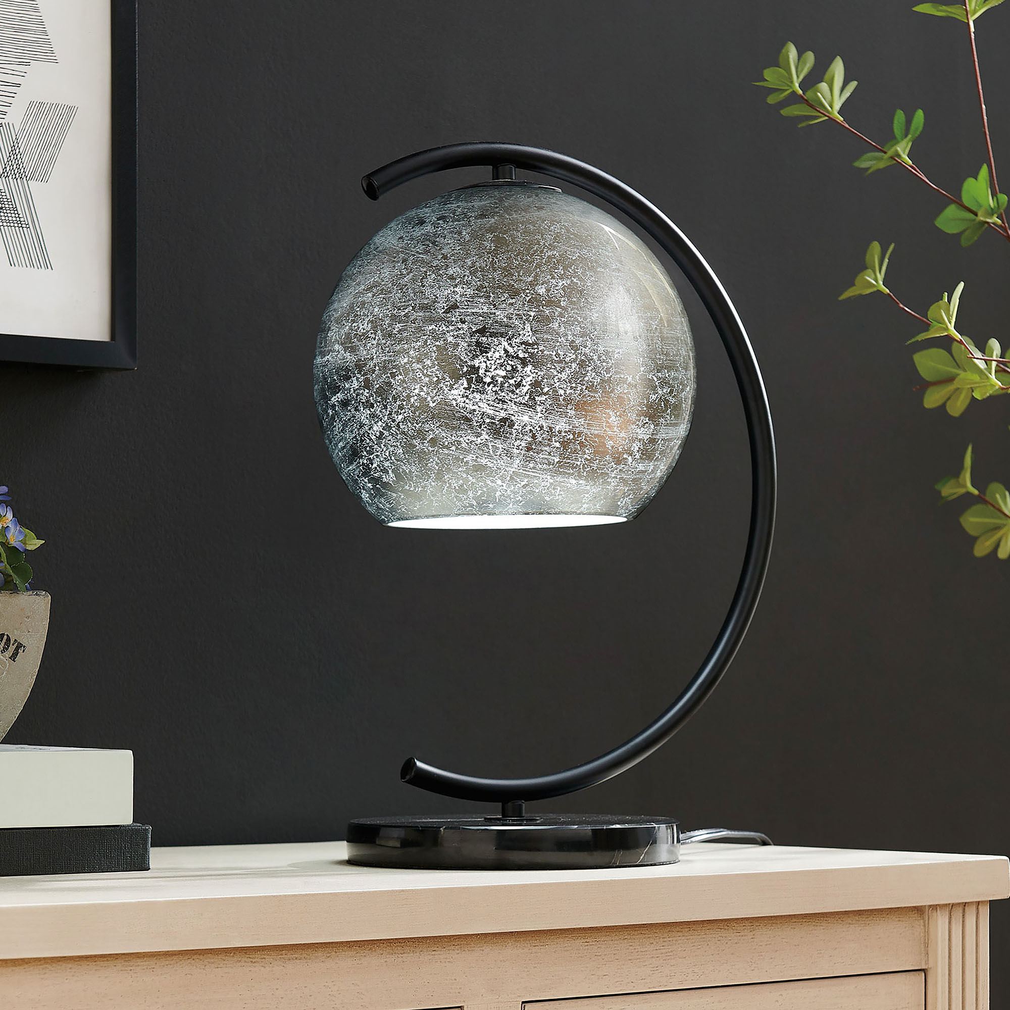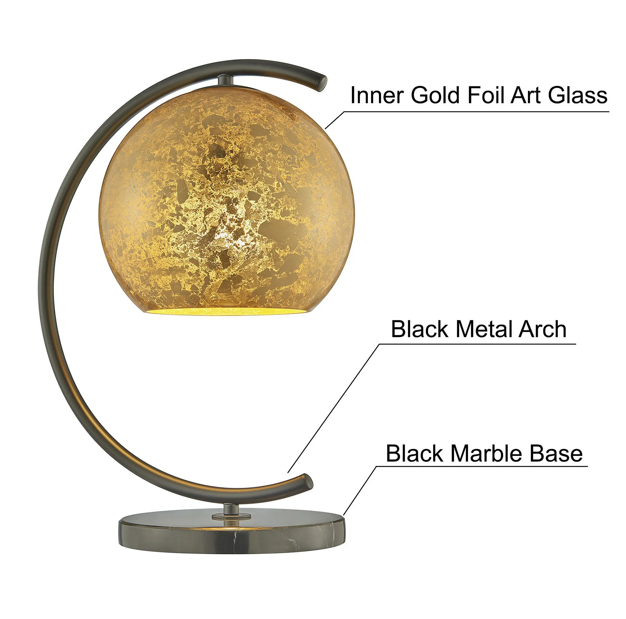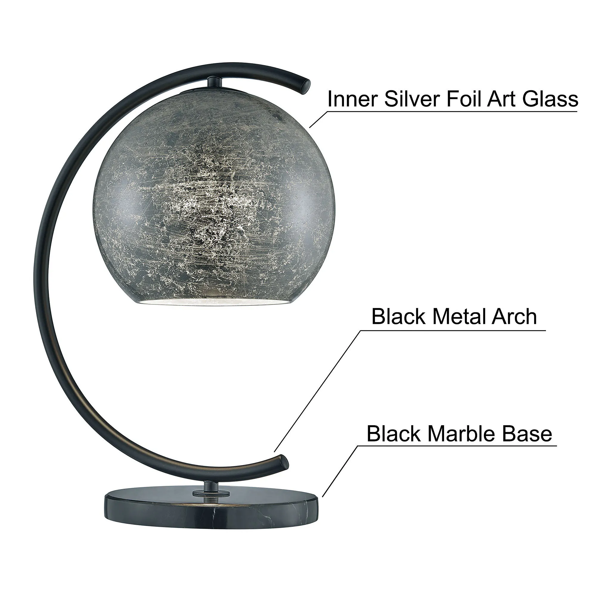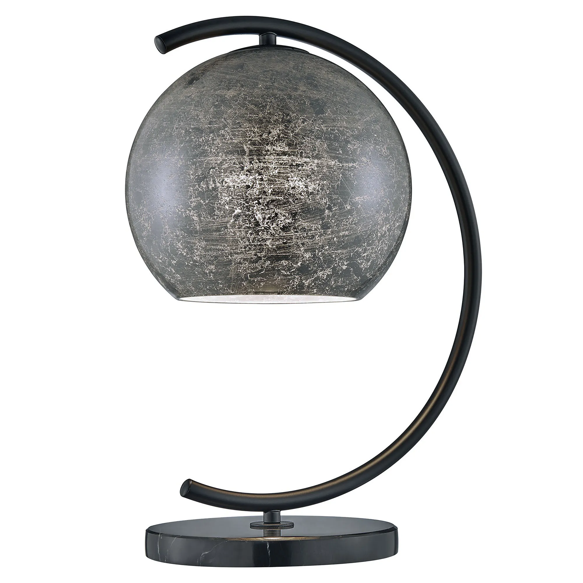 Metallic splendor shines from the Molina Table Lamp. With a high-class abstract design, the lamp features a round black marble base that supports the openwork curving black metal font. With inner metallic foil, the art glass globe shade strikes a bold metallic note with a variegated, gleaming appearance. UL listed. Requires one 60W bulb. Overall, the unique lamp measures 12.5"Wx9"Dx17"H.