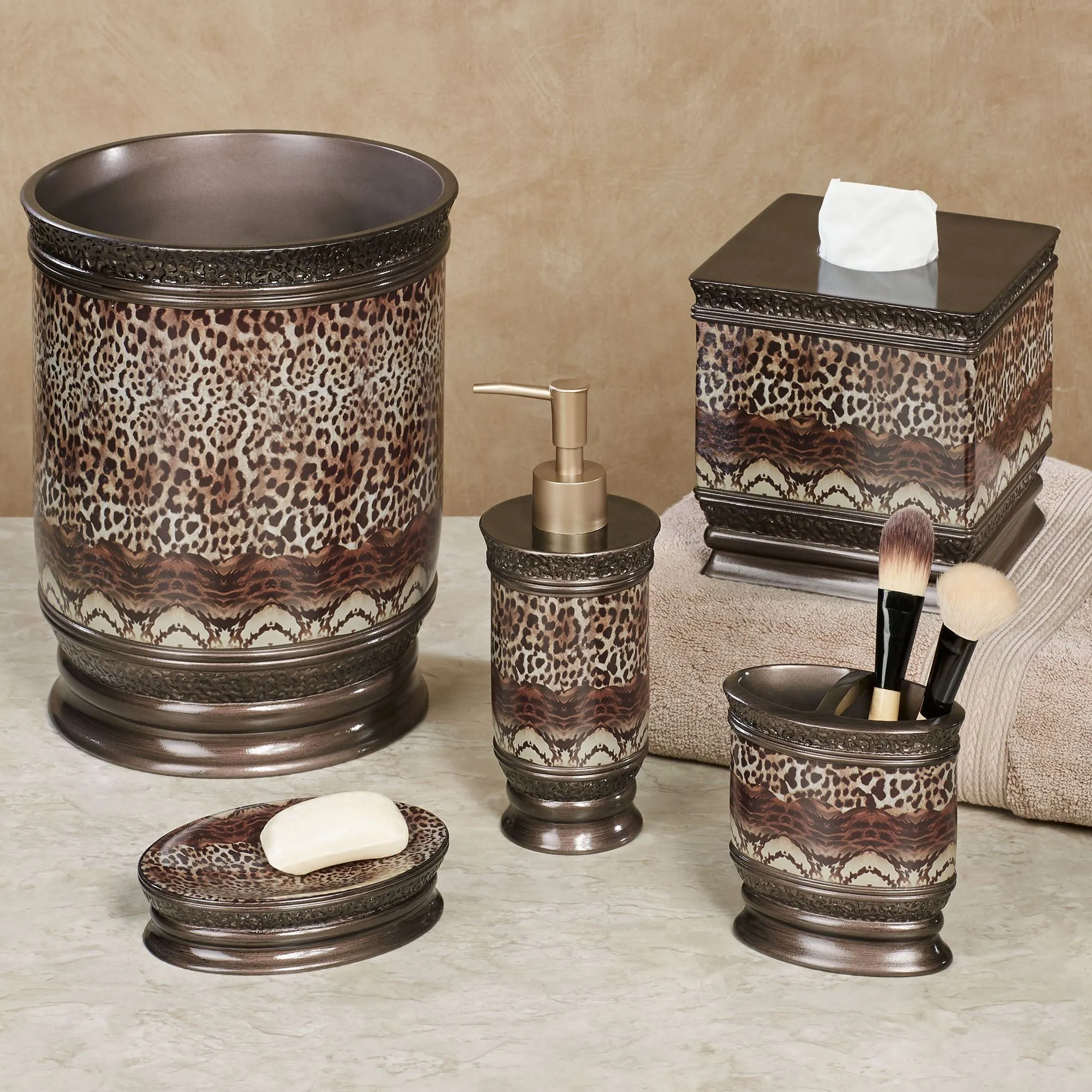 The Mombasa Bath Accessories add a touch of the wild to your daily routine. Each resin accent features a safari animal print decal center in light cream, mocha, auburn, and dark chocolate hues. Hand-sprayed dark chocolate finishes the top and bottom along the beveled and leopard print textures. The brush holder can be used to hold your toothbrushes or makeup brushes. Specify Soap Dish, Tissue Cover, Brush Holder, or Wastebasket.
