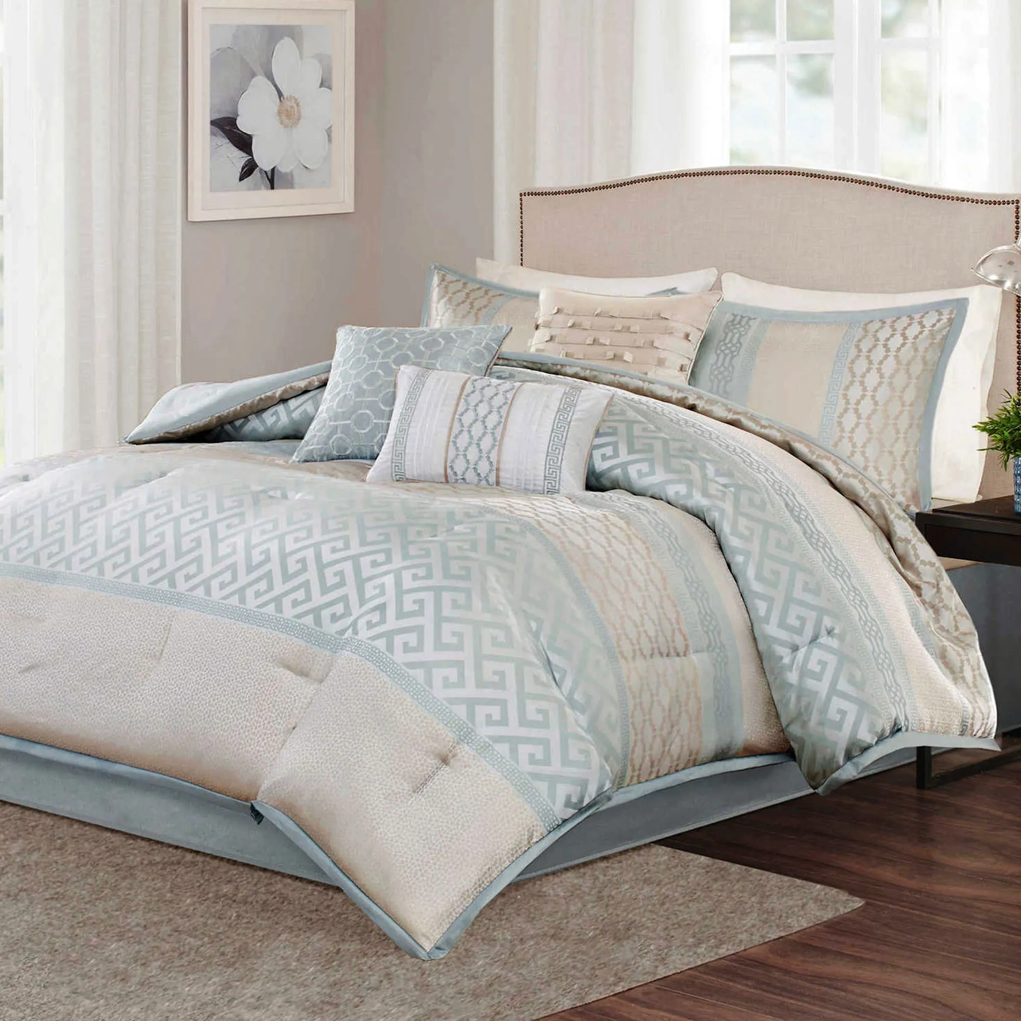 Sections of fretwork, trellis, Greek key motifs, and other geometric prints work together to create a soothing Montage for your sleeping space. Polyester bedding ensemble includes the peaceful shades of pale aqua mist, soft mint, light taupe, and natural.