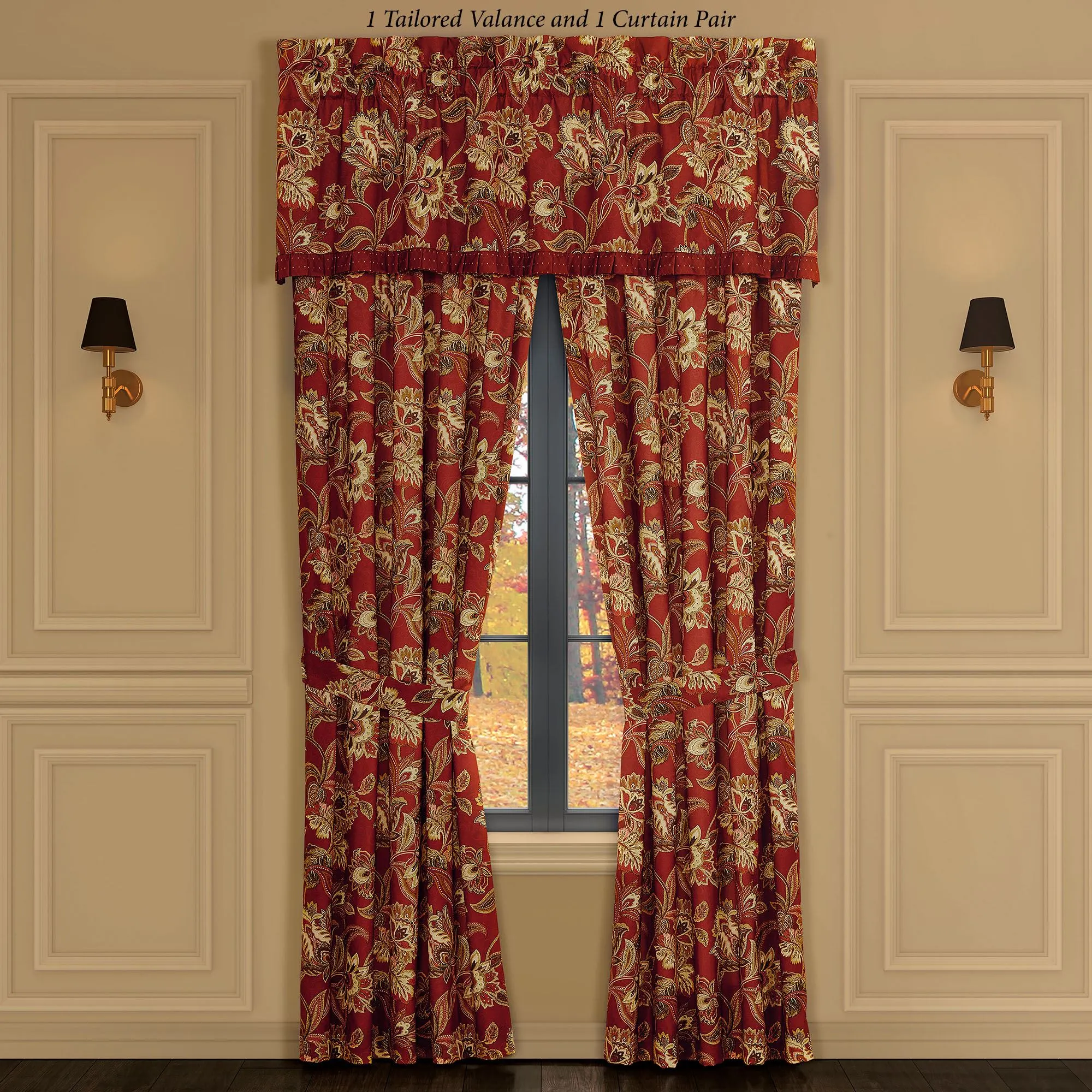 Tailored, lined Window Treatment has Jacobean motifs and 3" rod pockets. Curtains include tiebacks. Valance has a pleated flange with diamond dot designs.