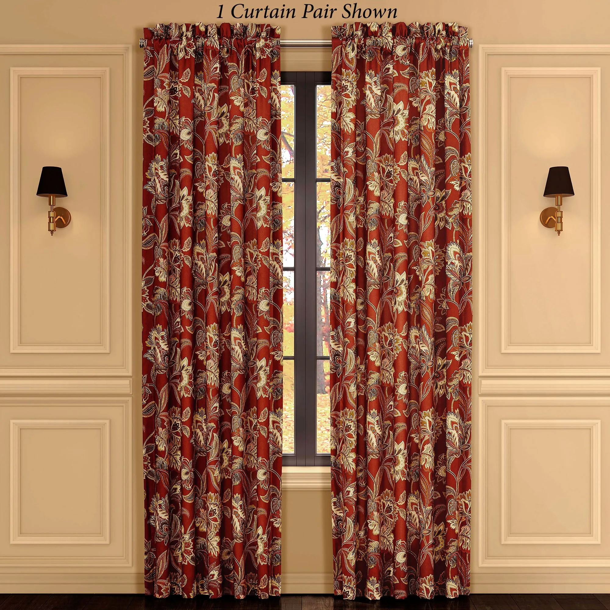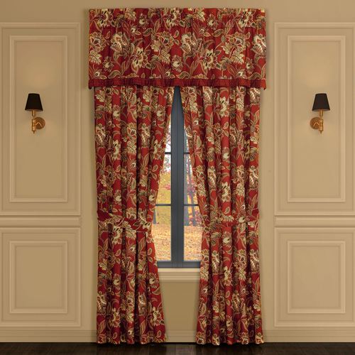 The luxurious Jacobean floral design on the Montecito II Window Treatment flourishes with supreme elegance. This polyester window treatment, from Royal Court, features printed motifs and includes colors of lemongrass, pale yellow, gold, pale gold, brick, taupe, and merlot. Tailored, lined window treatment has 3" rod pockets. Specify Curtain Pair or Valance. Curtains include tiebacks. Valance has a pleated flange with diamond dot designs. Dry clean. Imported. The curtain pair width is the total width of two panels together.