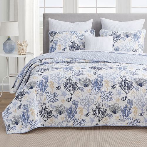 Sink beneath the surface of Montego Bay to find yourself among an underwater paradise. The Mini Quilt Set includes a quilt and sham(s). With a pre-washed and preshrunk cotton design, the printed coastal bedding features coral reef sights upon a white quilted ground with bound edges. Shades of blue and sand color the coral, seaweed, starfish, seashells, seahorses, and sand dollars. Quilt reverses to a blue and white basket weave print; fill is cotton/polyester. Sham(s) has a French back closure. Machine washable. Imported. Sorry, the white European shams and square pillow shown are not available.