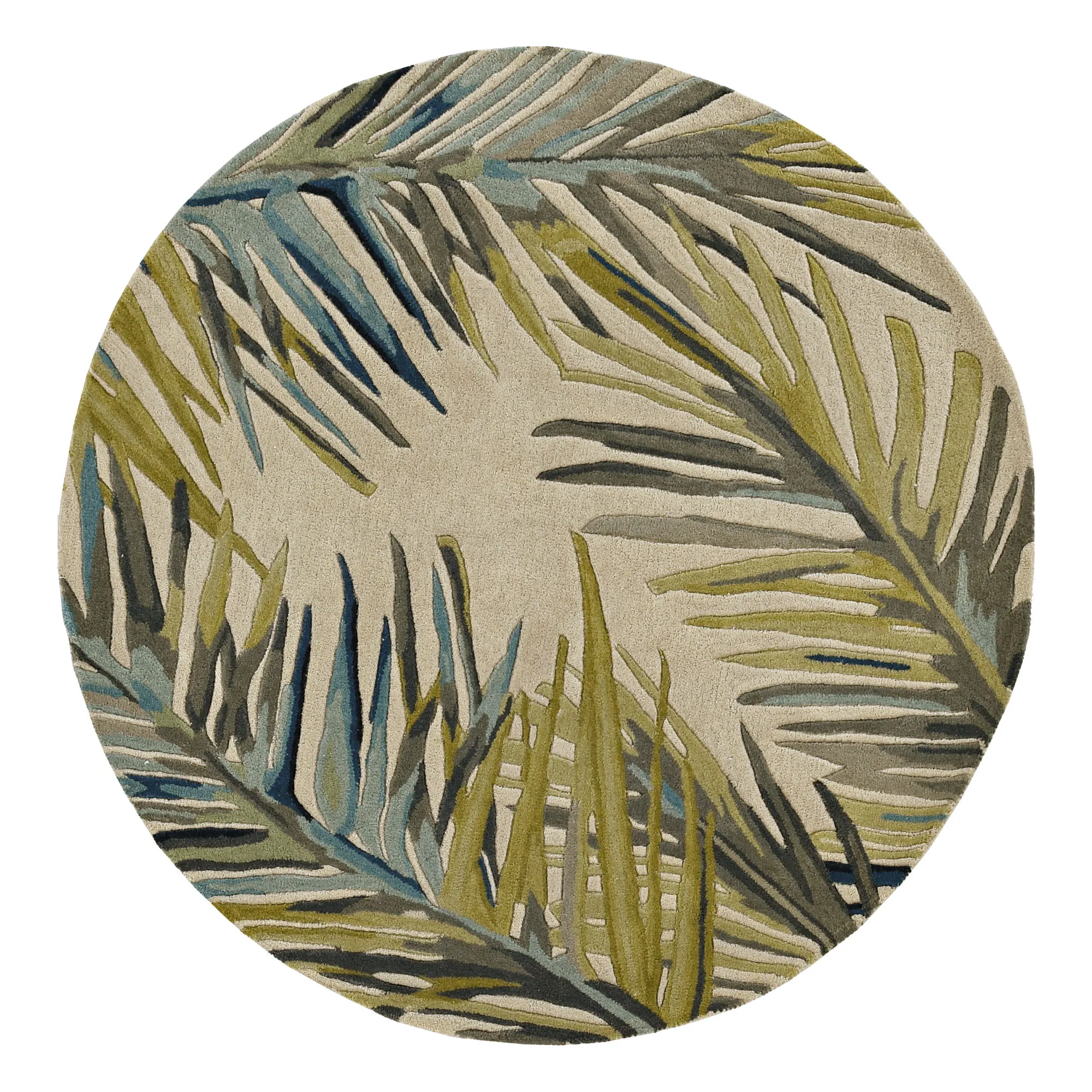 The Montego Tropical Area Rug depicts classic palm leaves swaying in the breeze. Hand-tufted in India, the .5" thick, pure wool rug features beautiful fern, pale green, gray, slate blue, and glacier palms against an ivory background. Backing is cloth-covered latex. We recommend professional cleaning by a rug cleaner.