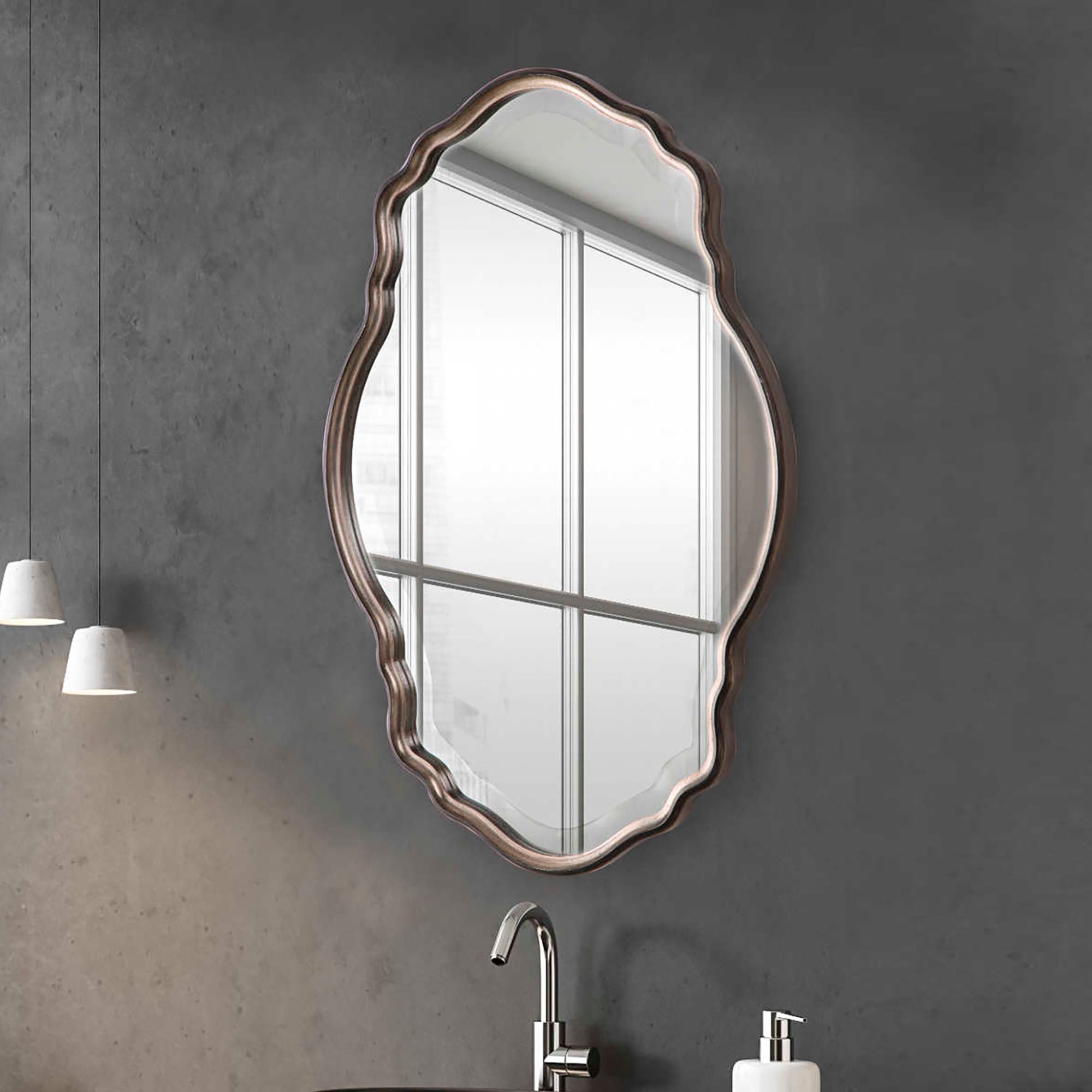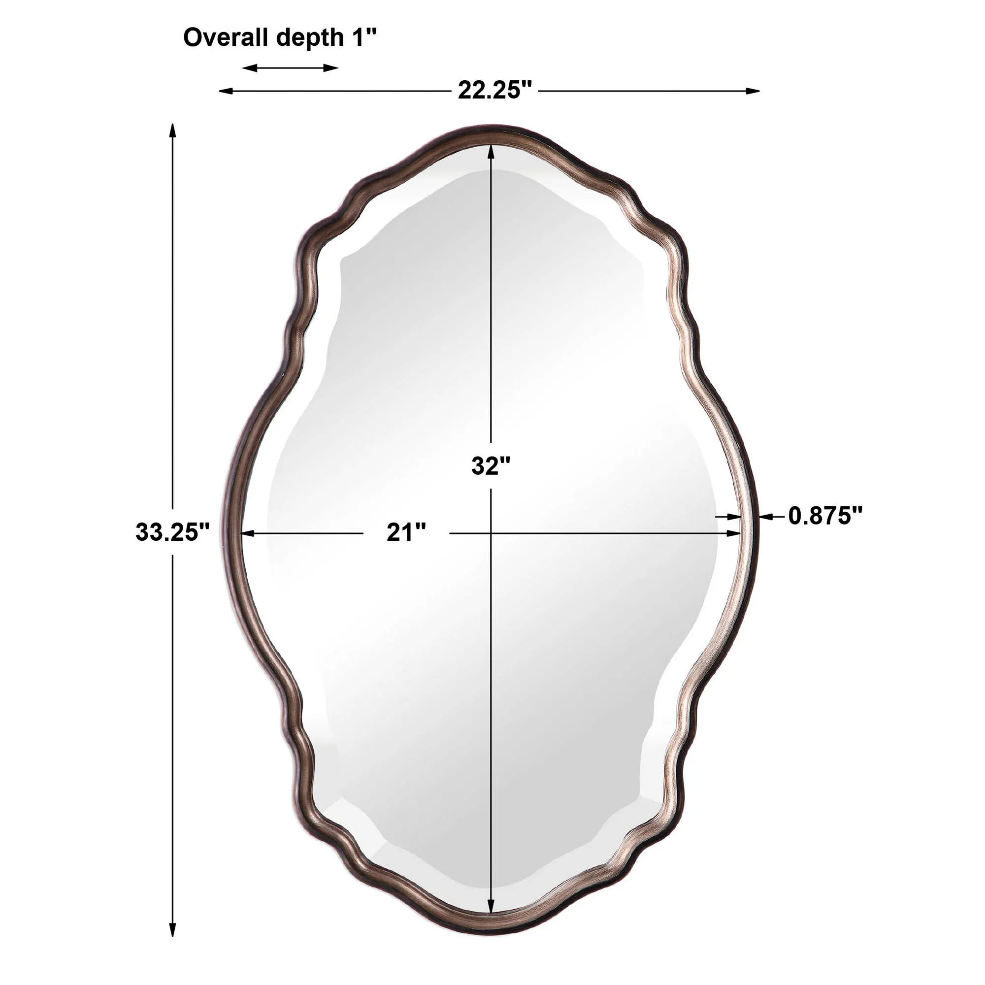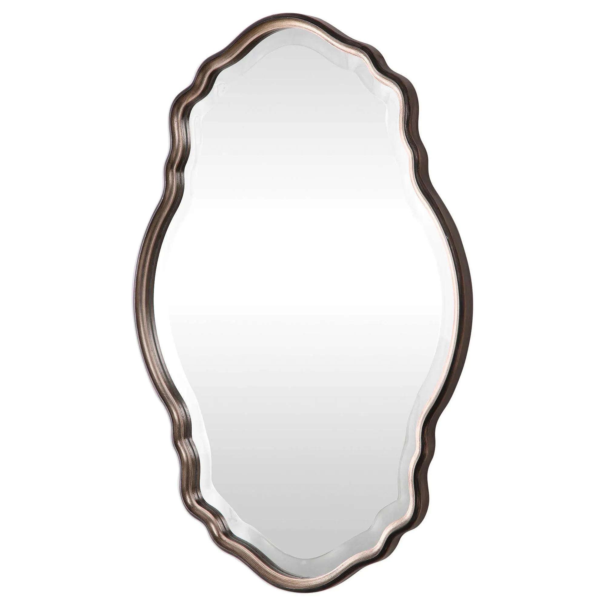 Graceful curves add elegance to the Montgomery Wall Mirror. This wall mirror, from Uttermost, has a wooden frame with an antique silver champagne finish and a dark bronze outer edge along with a central beveled glass mirror. Mirror may be hung vertically or horizontally. Measures 22"Wx1"Dx33"H.