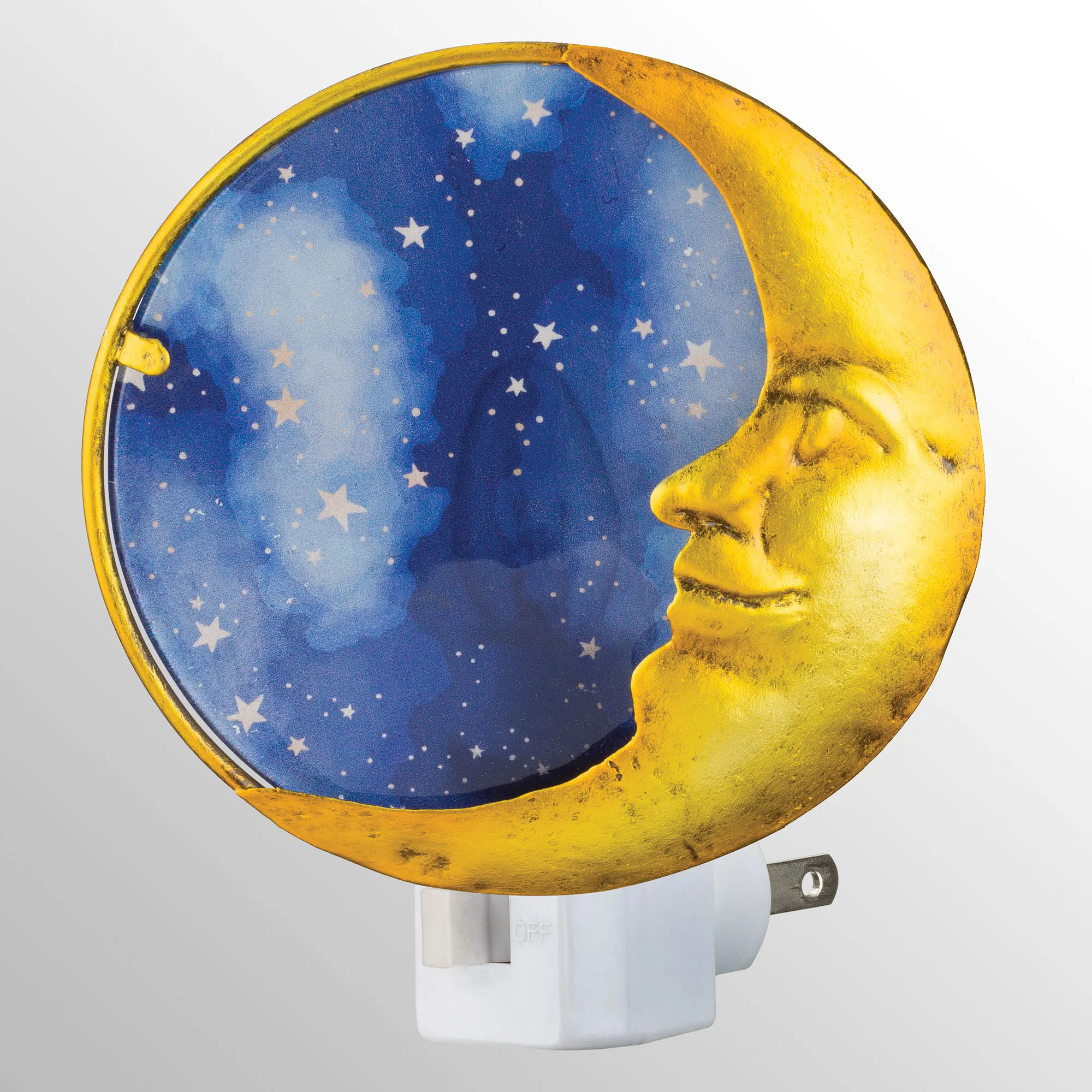 Allow the Moon Nightlight to illuminate the darkness inside your home. Finished in gold, the round metal design features a crescent moon shape detailed with a smiling face. The stained glass inset features a blue sky dotted with white stars. UL approved. With an on/off switch on the base, the moon nightlight has a rotating plug and includes a 7W bulb. Overall, measures 4.5"Wx3"Dx5"H.