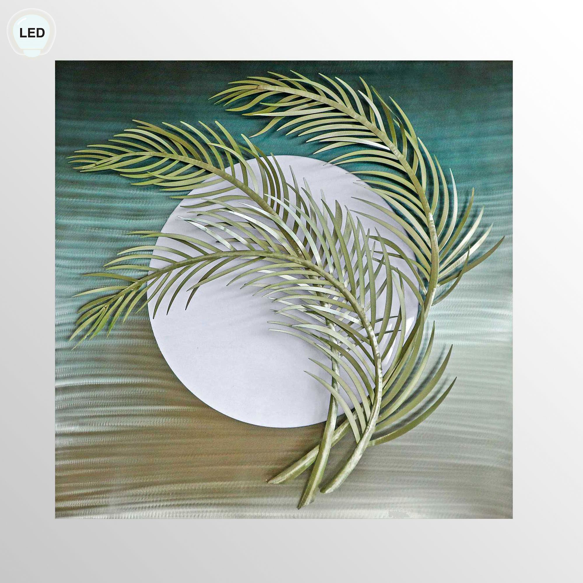 The Moonlight Palms sway in the darkness. Handcrafted of stainless steel, the hand-finished and hand-grinded wall art, by artist M. Malizia, features a silver moon with green palm fronds on a hand-dyed background. Colors include shades of turquoise, sage, and bronze variegated tones. A string of LED lights on the back accents the art. UL listed. Inline on/off switch with dimmer; AC adapter is included. Due to the handcrafted nature of this item, minor variations in size and color may occur. Measures 36"sq.x4"D.