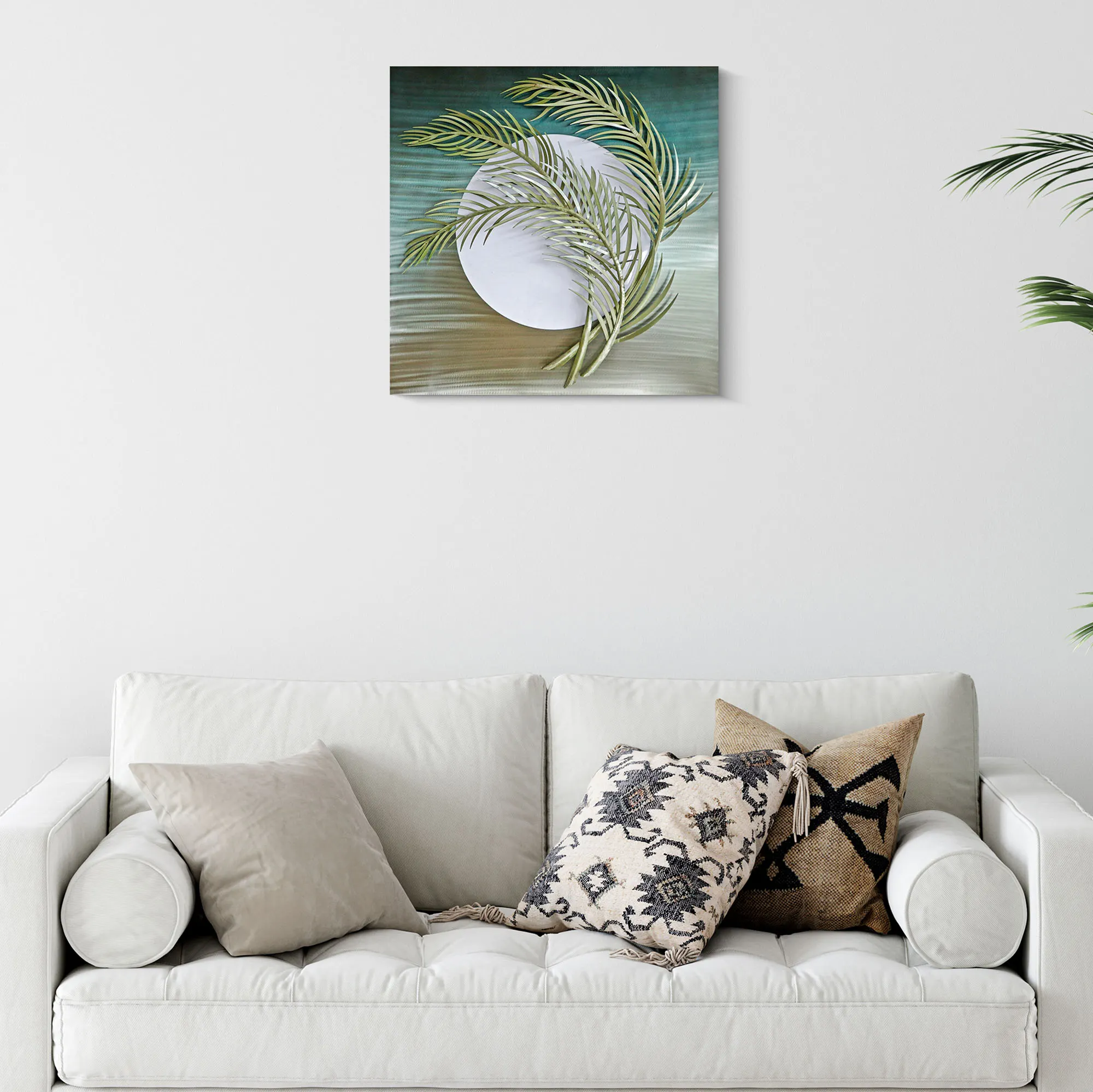 • Features a silver moon with green palm fronds