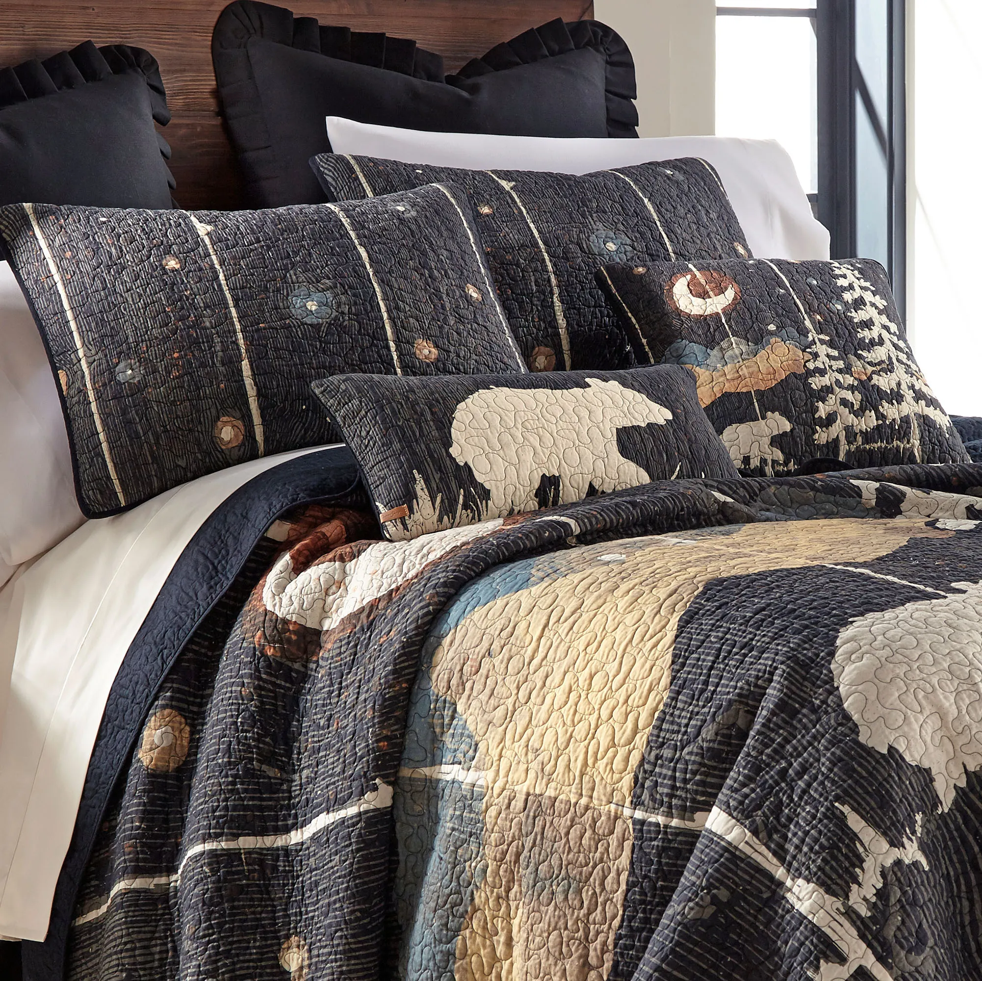 Evoke rustic tranquility in your bedroom with the Moonlit Bear Quilt. A Kentucky Original(TM) by Donna Sharp(R), the cotton quilt features a printed wilderness scene of a bear, pine trees, mountains, and beautiful starry sky. The scene is in hues of light cream, dark beige, chestnut, rust, light orange, pale blue, and cerulean on a striated dark gray and black ground. Vermicelli quilting completes the design. Quilt is backed in black; fill is cotton/polyester. Machine washable. Imported. Sorry, the European sham and bedskirt shown are not available.