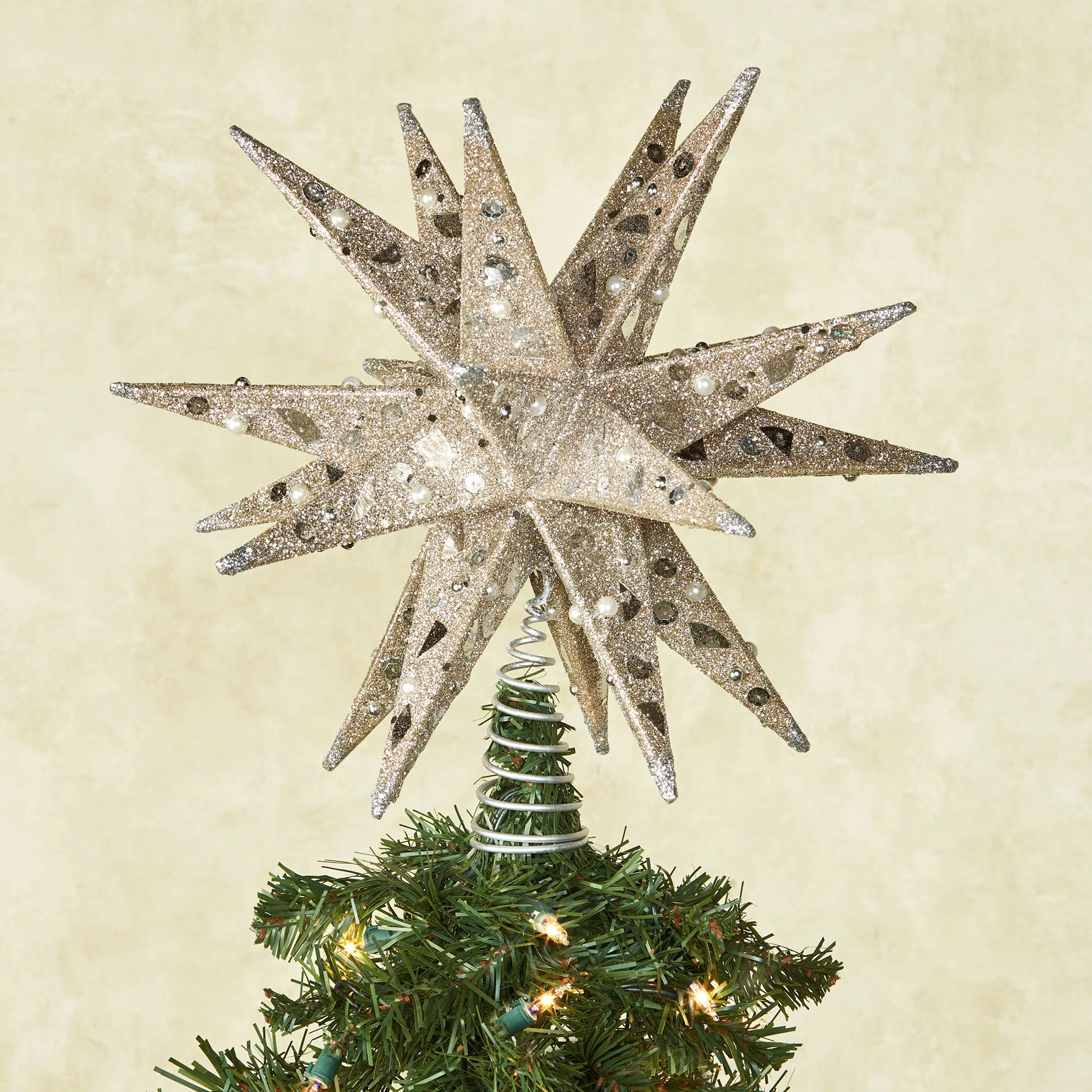 Top your tree with the glimmering Moravian Star. This paper mache star tree topper, by Kurt S. Adler, has a glittery champagne finish and silver glittery tips along with bead and sequin accents. Attach to your tree with the coil metal base. Please handle carefully due to the glitter accents; some glitter fall may occur. Measures approx. 12"dia.x11.5"H.