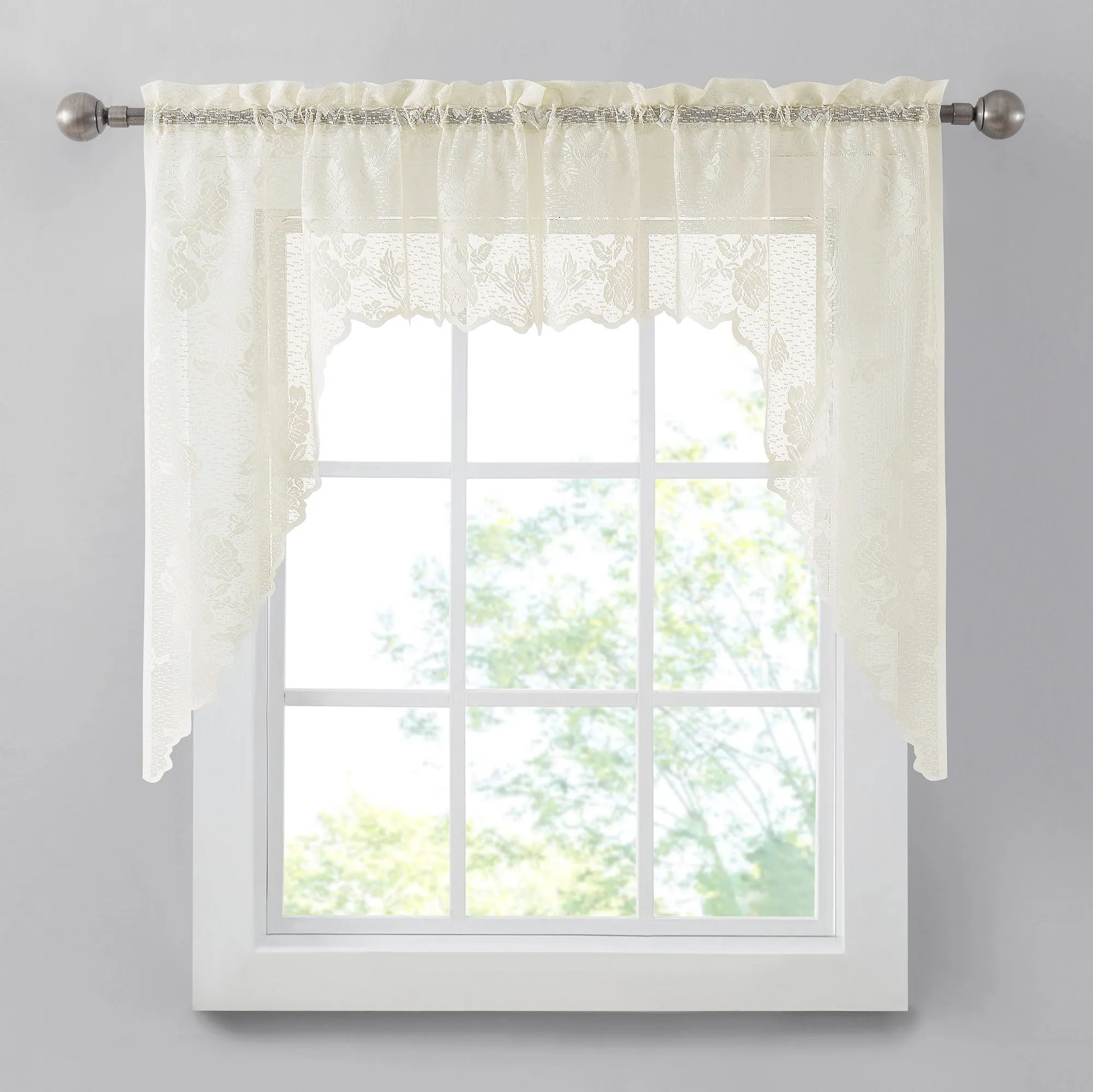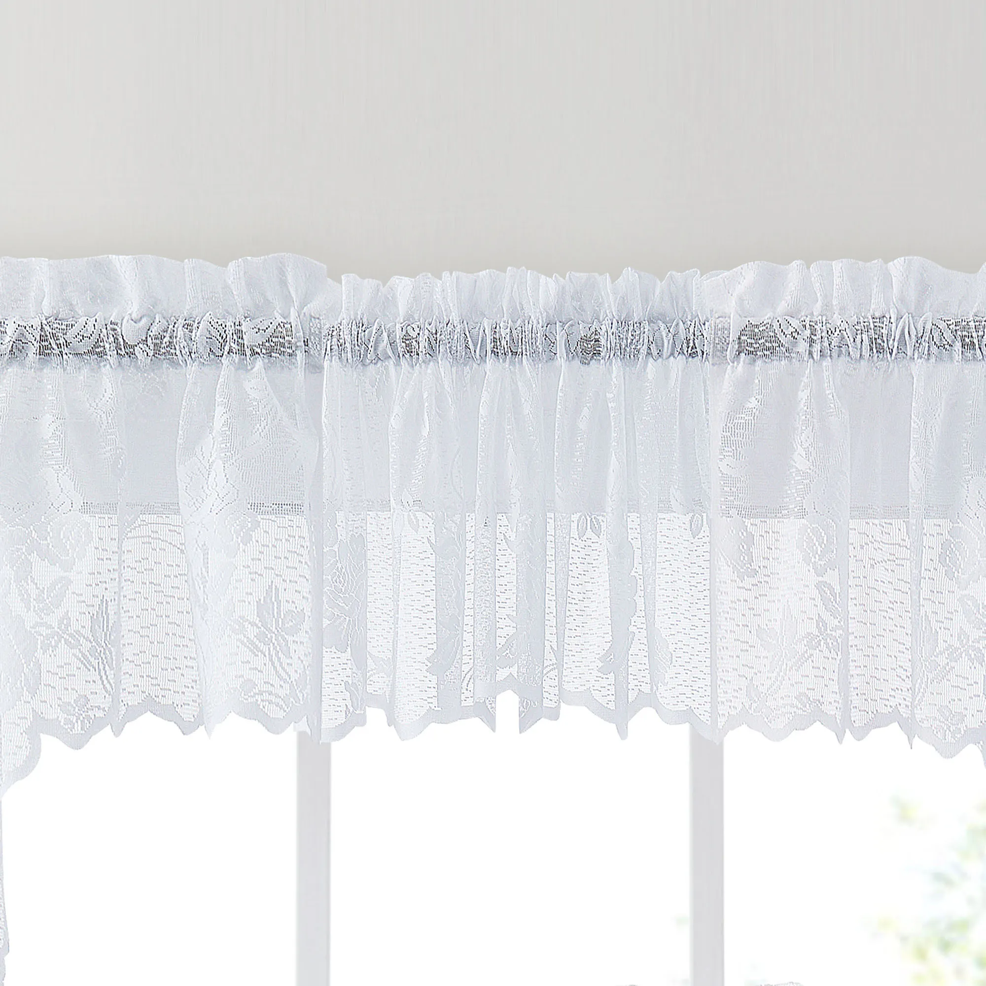 The Moray Lace Window Treatment blossoms with sweet grace. Finished with scalloped edges, each solid color polyester lace design features lovely trailing rose vines with leafy accents and visiting butterflies. Rod pockets measure 2". The Tier/Valance Set includes one swag valance pair, 56"Wx38"L; one tailored valance, 58"Wx12"L; and one tier pair, 56"W. The Swag Valance Pair and Tailored Valance are also available separately. Machine washable. Imported.