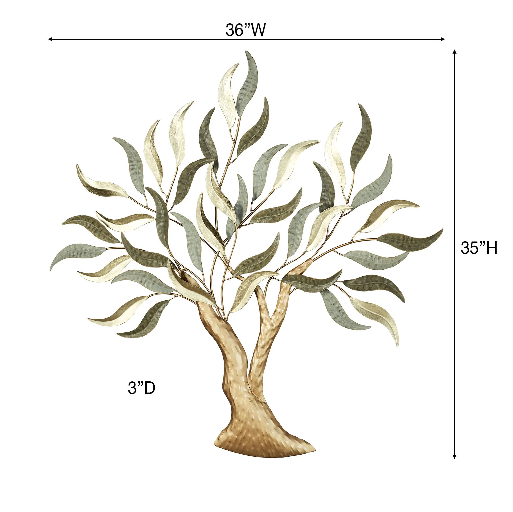 Flowing leaves in various shades of sage and gold appear to sway gently on the Morning Mist Tree Wall Art. This hand-finished, textured metal wall art depicts a tree with a gold trunk. Measures 36"Wx3"Dx35"H.
