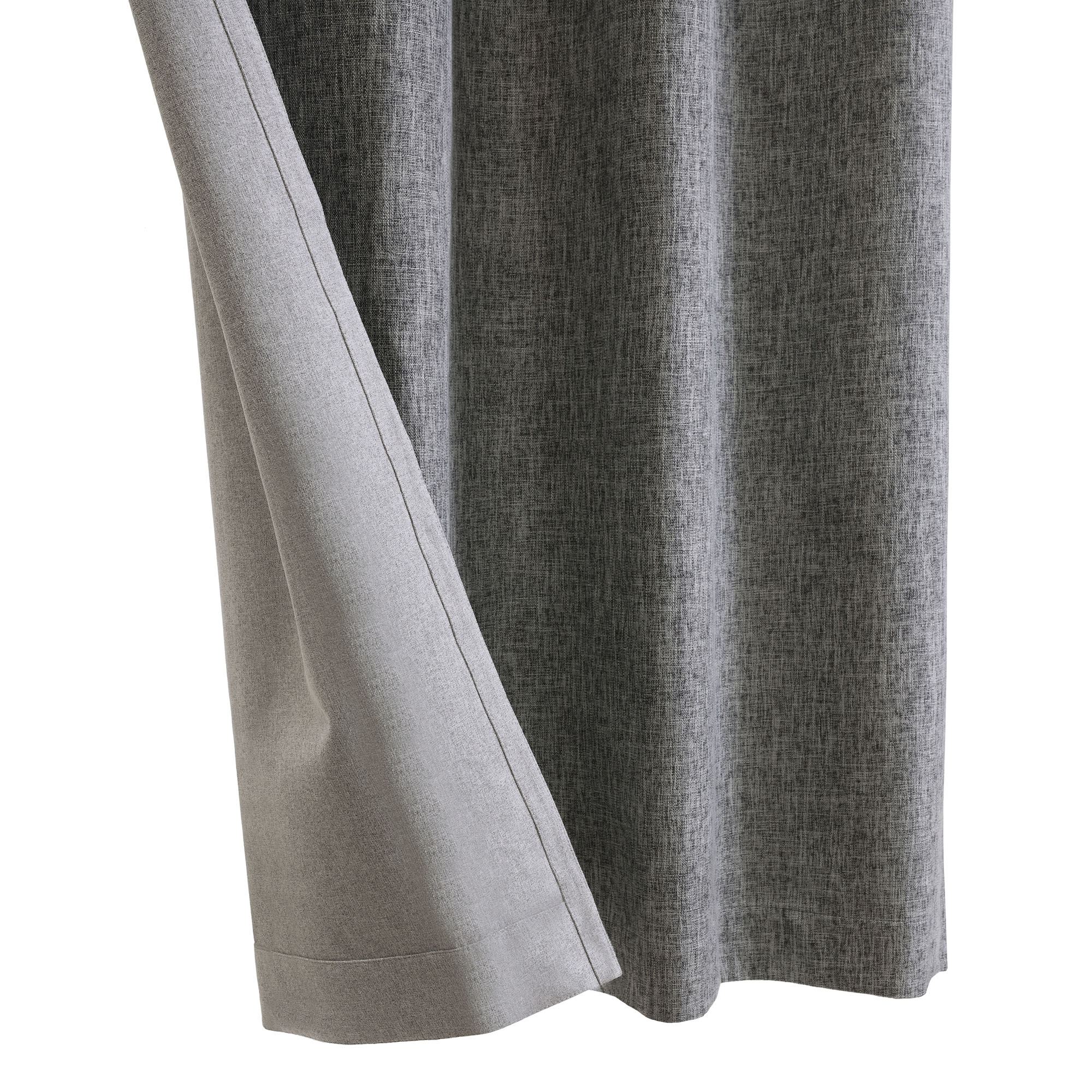 The Morrill Grommet Curtain Panel frames your view with an effortless appeal. Capable of reversing to fit your mood or changing decor, the polyester faux linen window panel features two neutral shades sandwiched around a polyurethane center. Black reverses to light gray. Dark Gray reverses to dark beige. From Thermaplus(TM), the hotel-quality blackout curtain panel blocks out light, boosts energy efficiency, and reduces noise pollution. Sold individually, each 52"W panel hangs via 1.5" dia. brushed silver metal grommets. Machine washable. Imported.