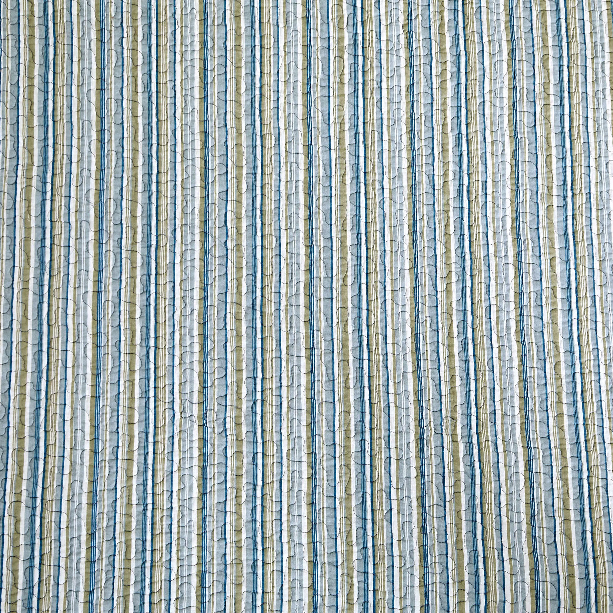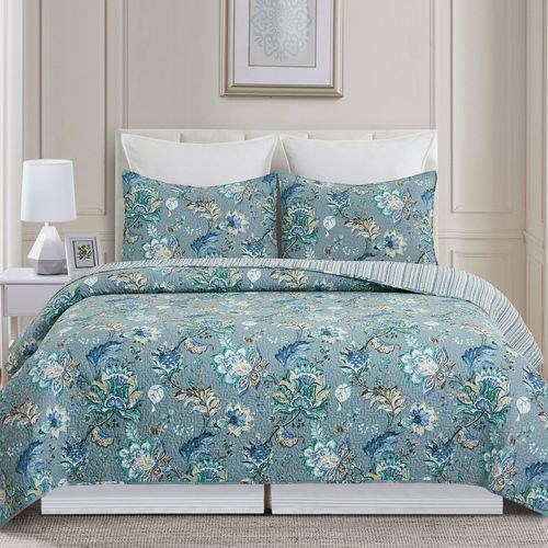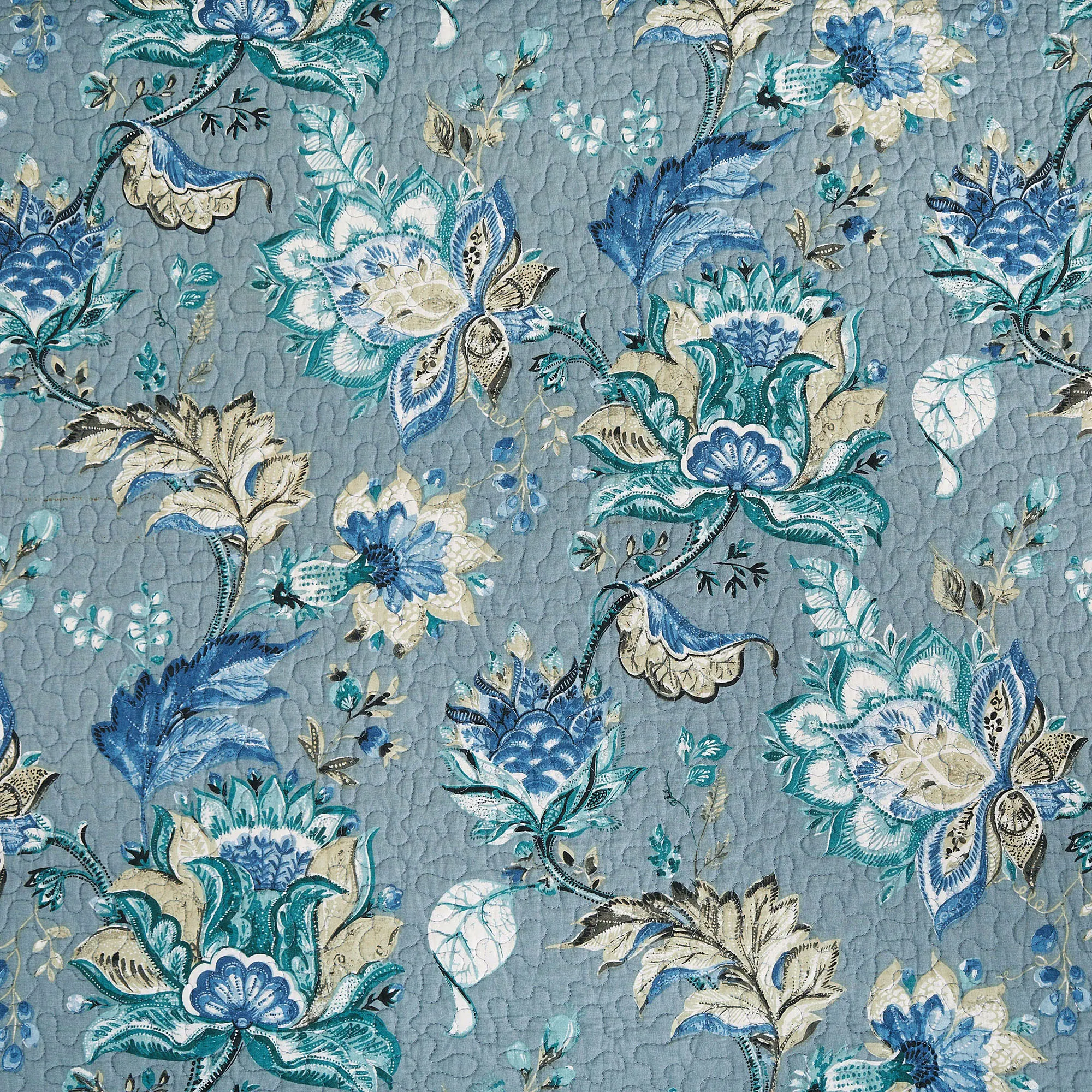 Refresh any sleeping space with the flirty Jacobean floral design on the Morrison Bedding. The Mini Quilt Set includes a quilt and two shams. This cotton ensemble features a printed floral and leaf pattern. Colors include shades of blue, khaki, black, white, teal, and slate blue. Quilt has vermicelli quilting, bound ends, and a reverse with printed stripes in khaki, white, and blue. Fill is cotton/polyester. Shams mimic the quilt and have bound ends and French back closures. Machine washable. Imported. Sorry, the European shams shown are not available.