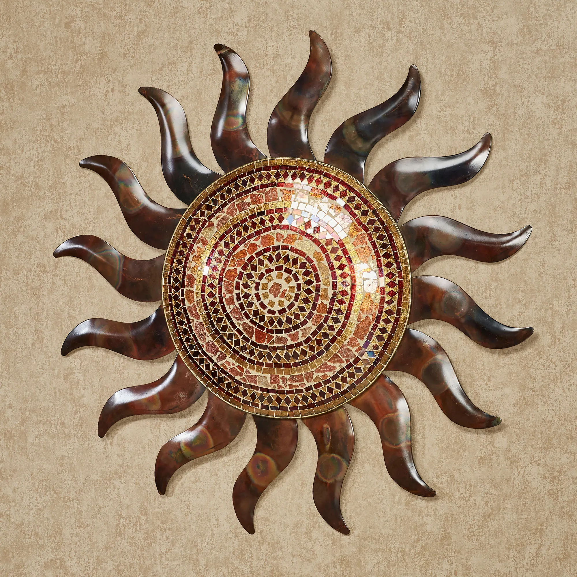 Sparkling radiance bursts from the Mosaic Sun Indoor/Outdoor Wall Art. Follow the flamed copper metal rays to the intricate mosaic glass pattern in the domed center. Beautifully handcrafted and handpainted with clear lacquer for protection, each glass piece creates the mesmerizing concentric design. Weather-resistant wall art may be used indoors or outdoors year round. Due to the handcrafted nature of this product, slight variations may occur. Sun wall art measures 29"dia.x2"D.