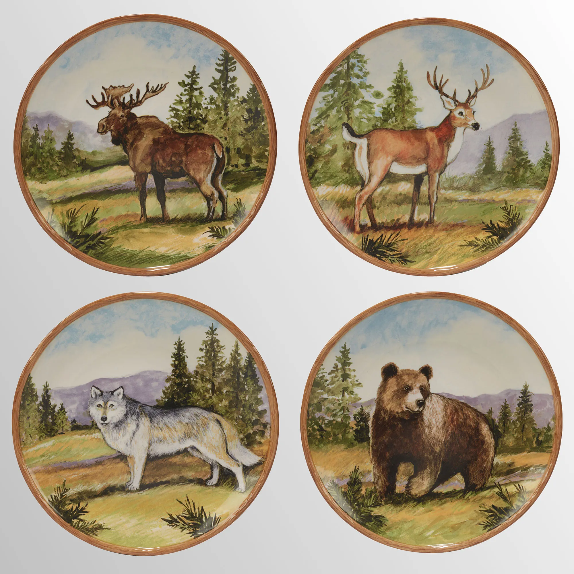 One may see a bear, elk, wolf, or moose on a trek to the Mountain Summit. These ceramic dinner plates, by artist (C)Susan Winget, show different animals in mountain scenes, are handpainted with decal accents, and have a glossy finish. Colors include shades of brown, green, white, gray, and blue. Each dinner plate in the four-piece set is approx. 11" dia. Food-, dishwasher-, and microwave-safe.