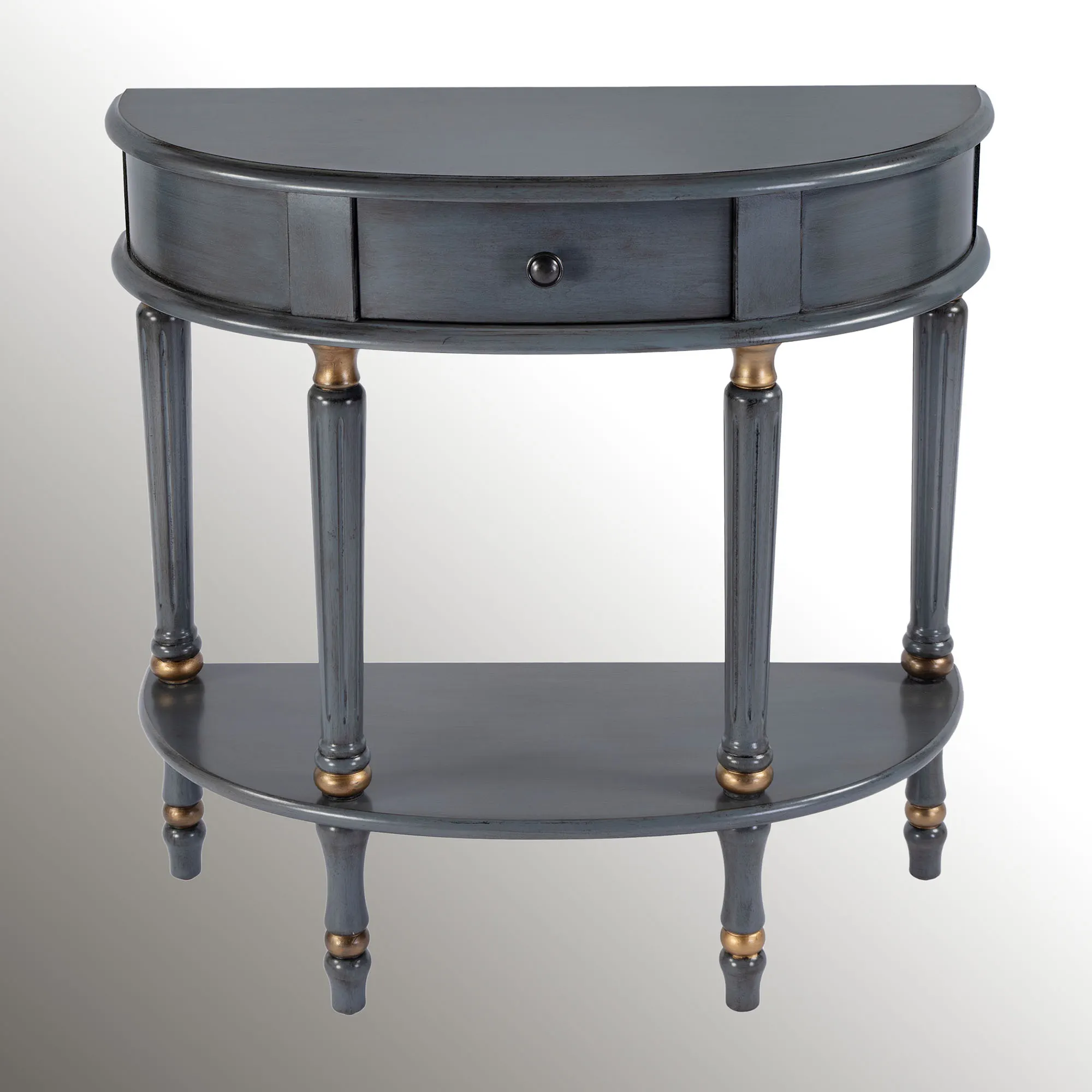 The Mozart Dark Blue Console Table from Butler Specialty combines classic charm and intriguing color. Handpainted in a deep, dark blue tone, the cherry veneer and wooden table features a demilune shape, wide display top, convenient storage drawer, lower display shelf, and delightfully shaped legs with fluted accents and antique gold detailing. With a round metal drawer pull, the drawer storage space measures 9.5"Wx9"Dx2.5"H. Maximum recommended weight is 100 lbs. Overall, the console table measures 31.5"Wx13"Dx30"H and weighs approx. 34 lbs.