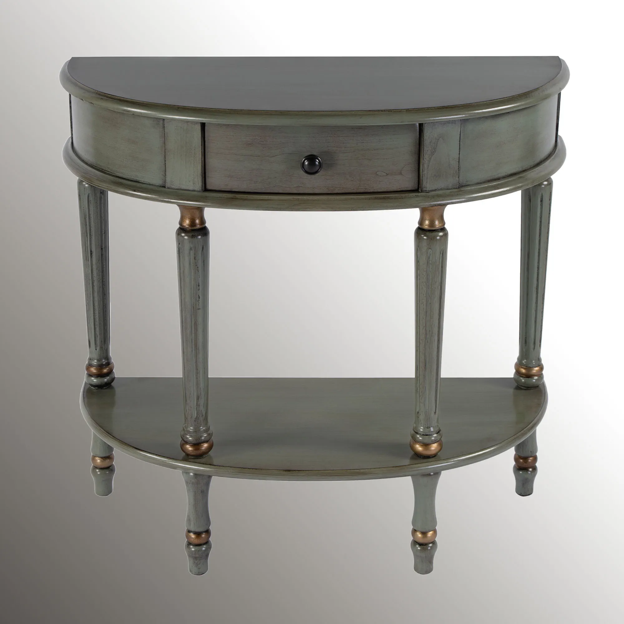 The Mozart Console Table from Butler Specialty combines classic charm and intriguing color. Handpainted in a deep cool tone, the cherry veneer and wooden table features a demilune shape, wide display top, convenient storage drawer, lower display shelf, and delightfully shaped legs with fluted accents and antique gold detailing. With a round metal drawer pull, the drawer storage space measures 9.5"Wx9"Dx2.5"H. Maximum recommended weight is 100 lbs. Overall, the console table measures 31.5"Wx13"Dx30"H and weighs approx. 34 lbs.