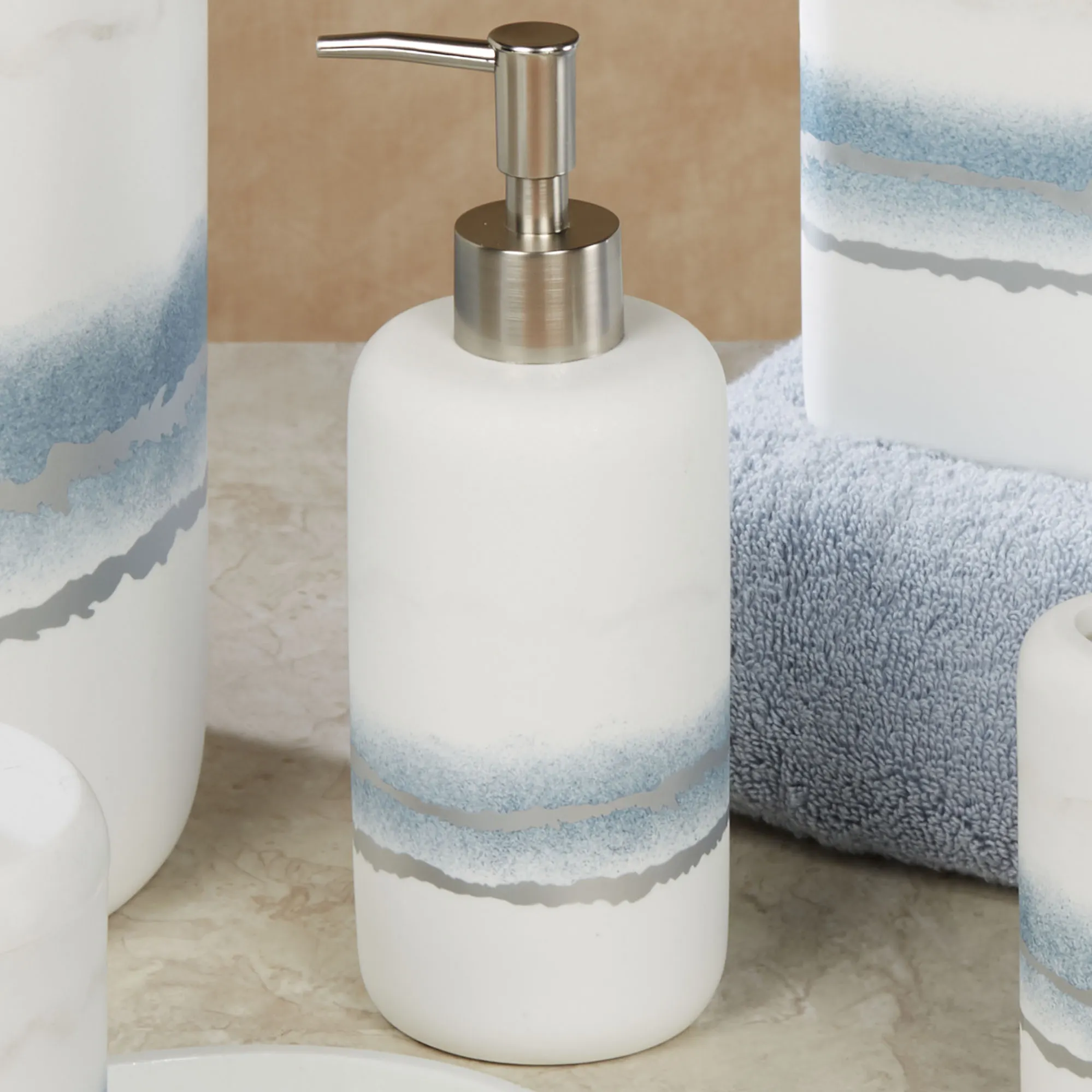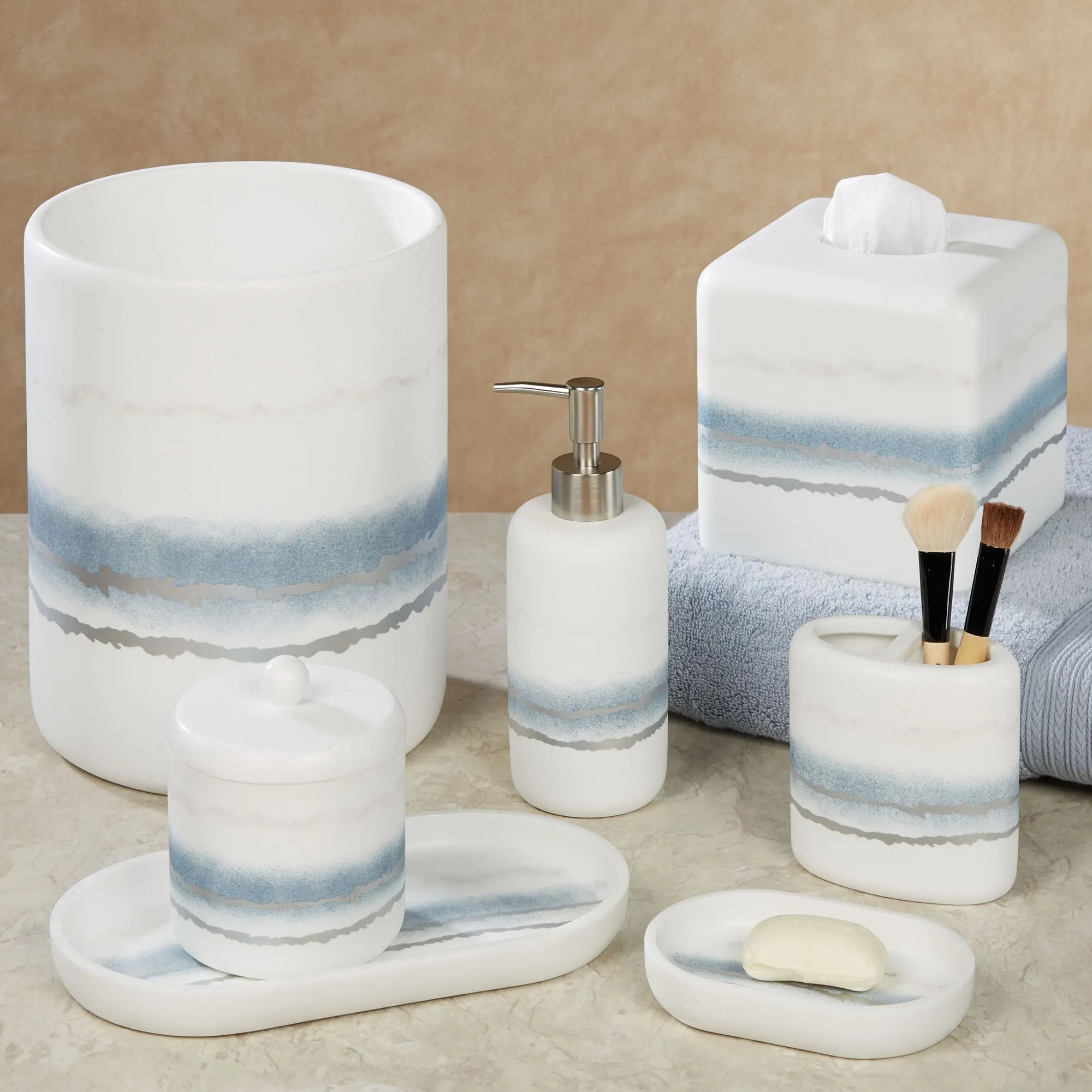 Cool hues converge with modern style upon the Murano Bath Accessories. The smooth matte ivory resin designs feature handpainted pale gray and blue hazy bands and shimmering silver band decals. The Brush Holder can be used to hold your toothbrushes or makeup brushes. Specify Brush Holder, Covered Jar, Lotion/Soap Dispenser, Soap Dish, Tissue Cover, Tray, or Wastebasket.