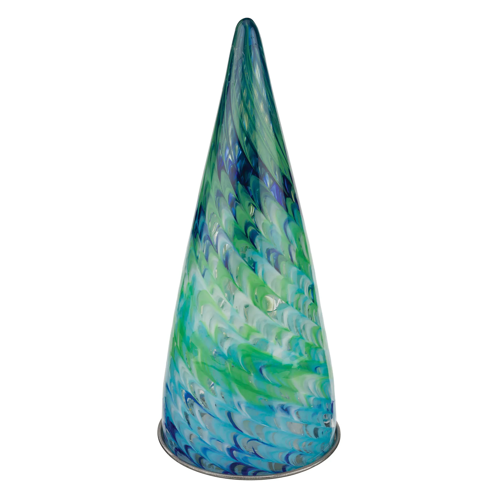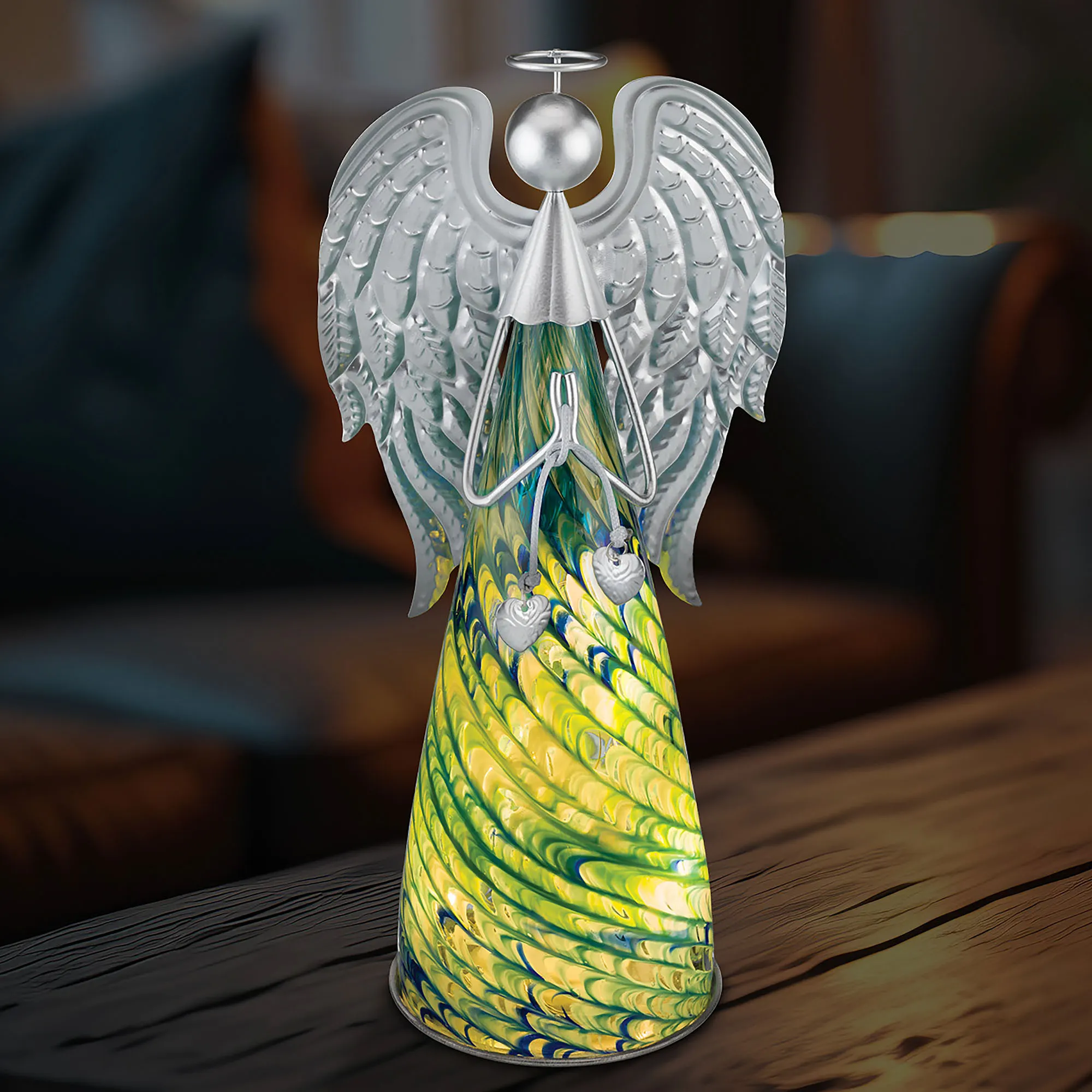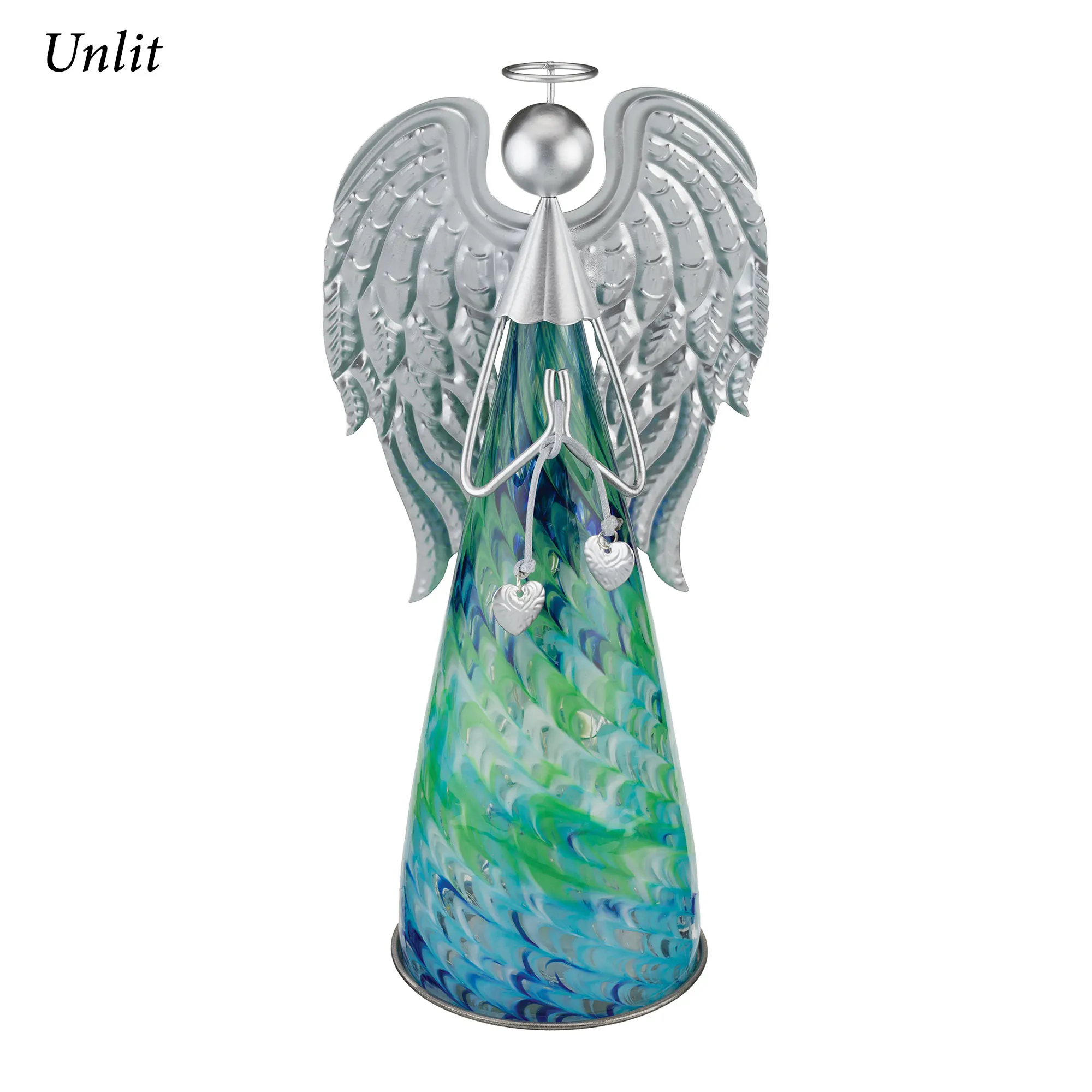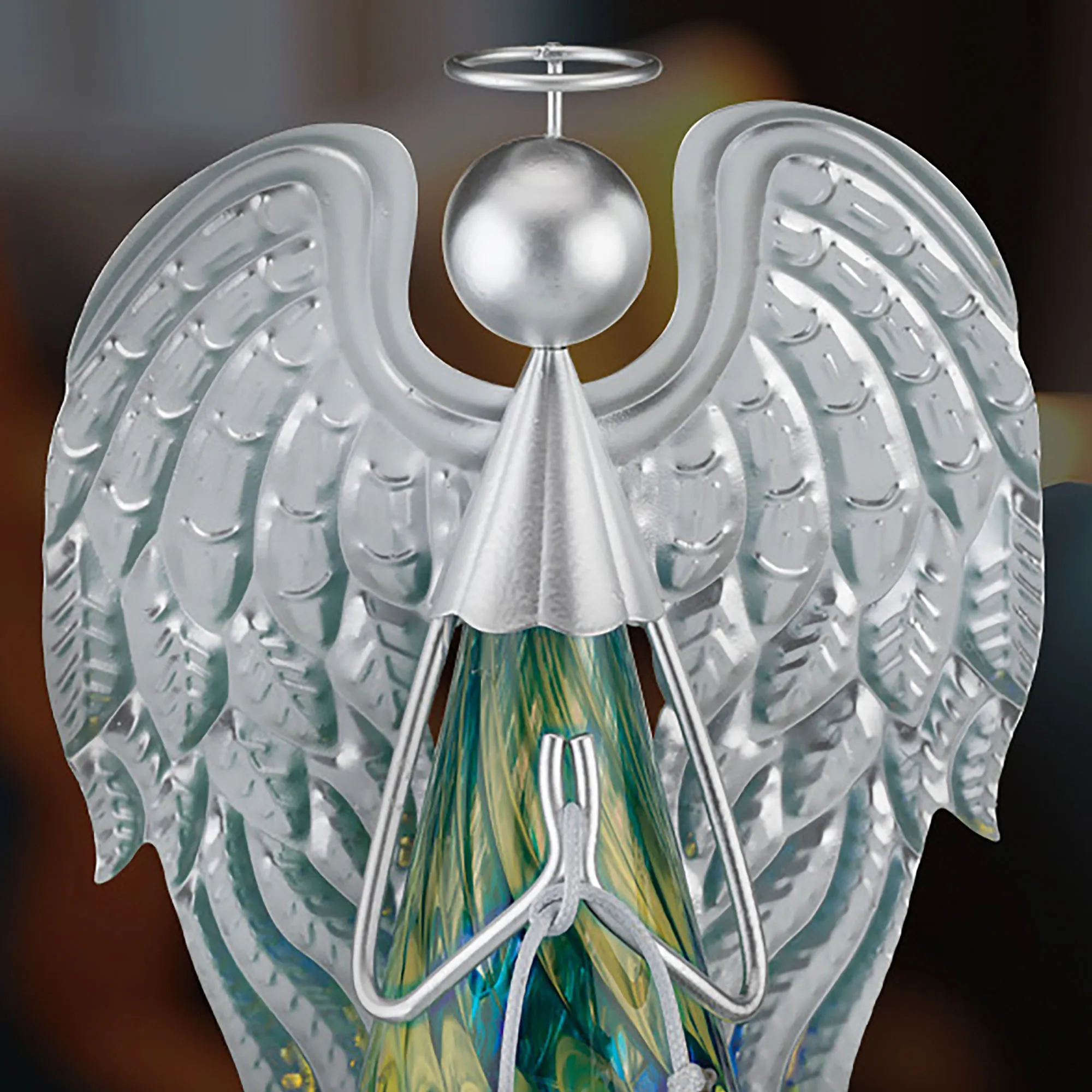 The Murano LED Angel Figurine radiates graceful color. Hand-blown with vibrant swirled hues, each Murano-style glass lantern creates a flaring dress for the metal angel topper. The detailed wings spread behind the angel's clasped hands, charming halo, and dangling heart accents. The glass lantern glows with LED string lights for a constant or twinkling light; requires three of your AAA batteries and operates from a switch on the bottom. The Blue coloration has a silver metal angel body. Overall, the lighted angel figurine measures 6"Wx4.5"Dx12.5"H.