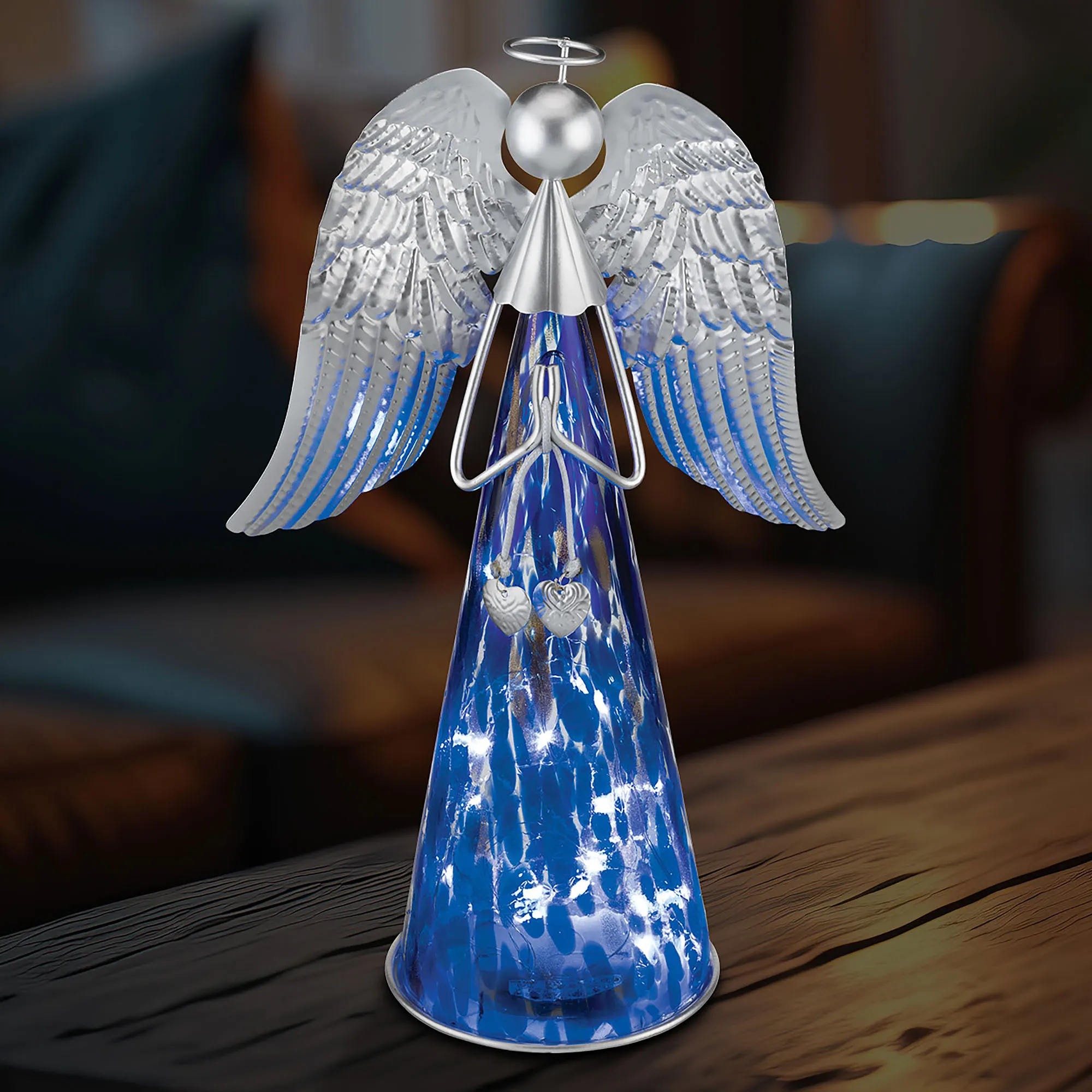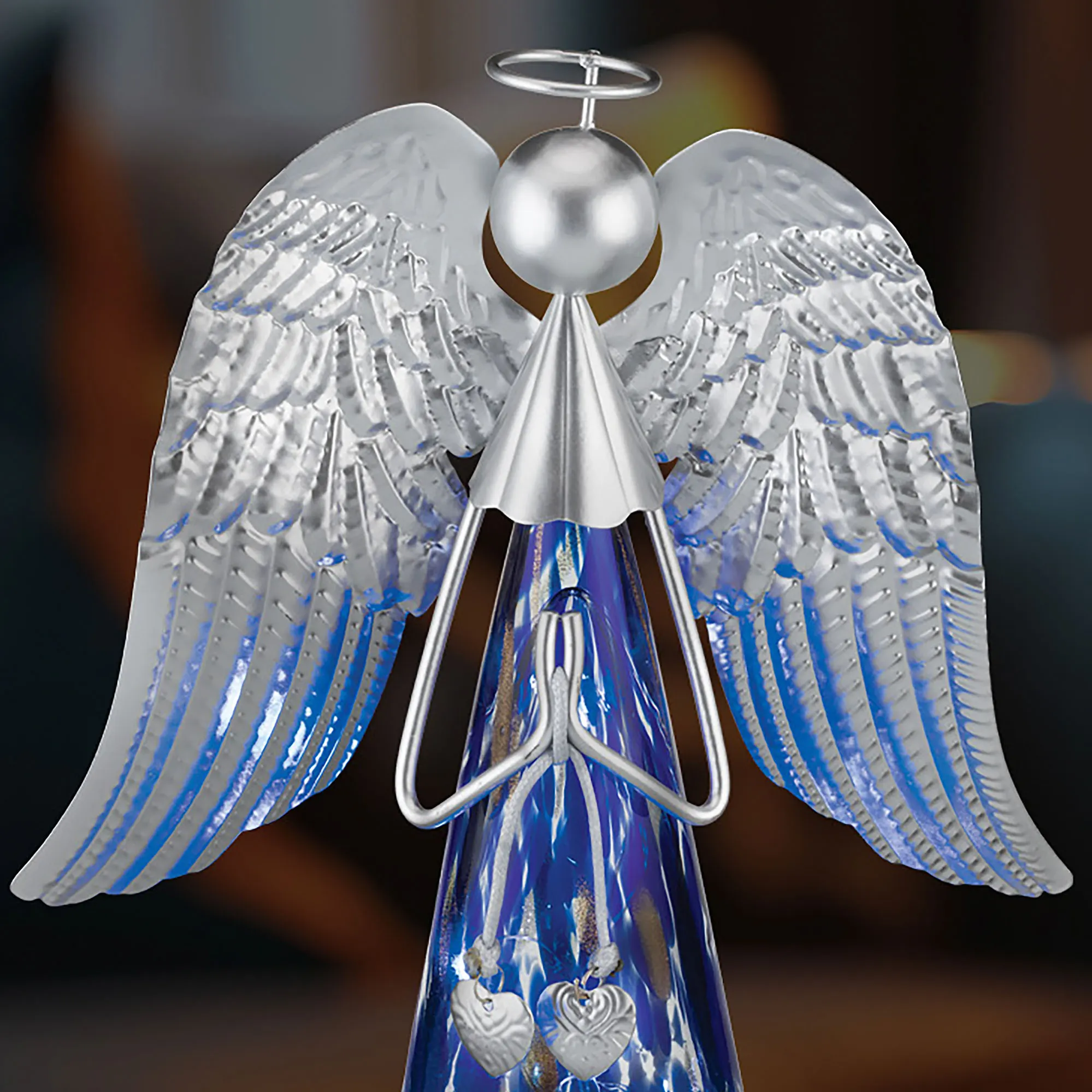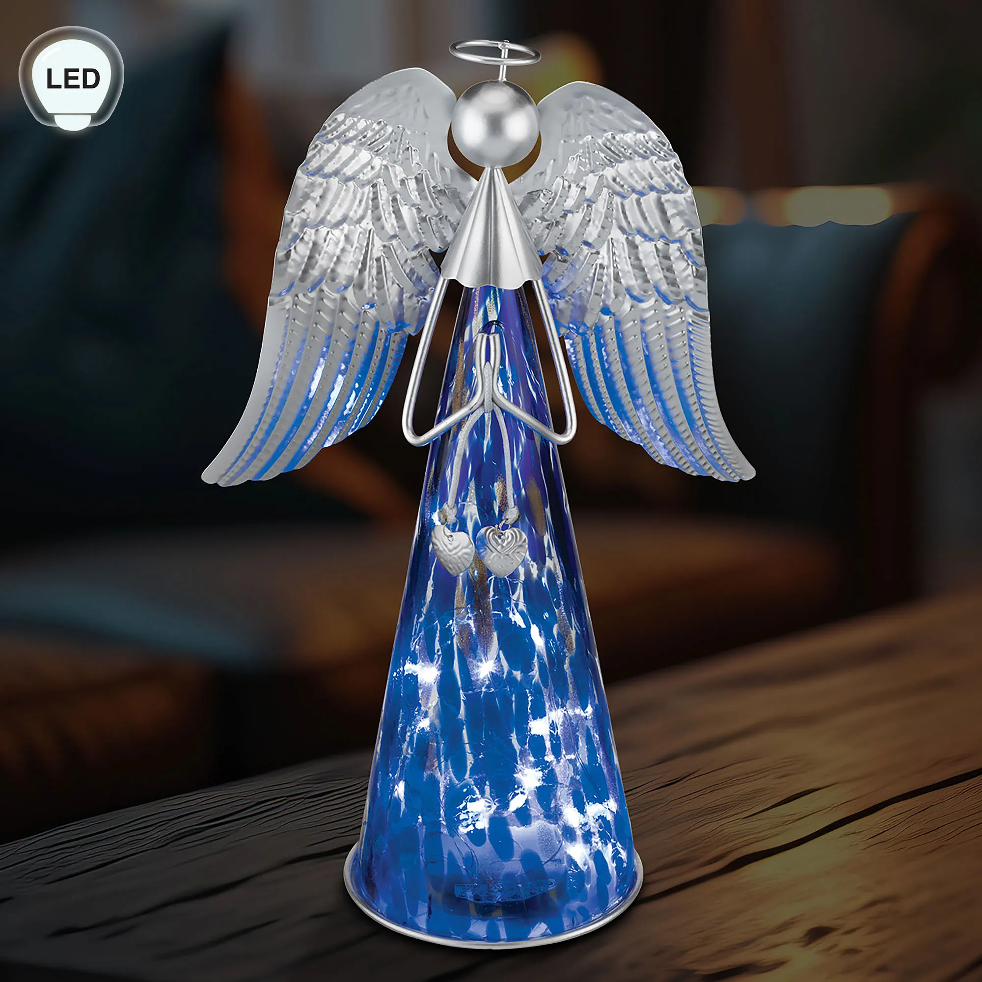 The Murano LED Angel Figurine radiates graceful color. Hand-blown with vibrant swirled hues, each Murano-style glass lantern creates a flaring dress for the metal angel topper. The detailed wings spread behind the angel's clasped hands, charming halo, and dangling heart accents. The glass lantern glows with LED string lights for a constant or twinkling light; requires three of your AAA batteries and operates from a switch on the bottom. The Indigo coloration has a silver metal angel body. Overall, the lighted angel figurine measures 6"Wx4.5"Dx12.5"H.