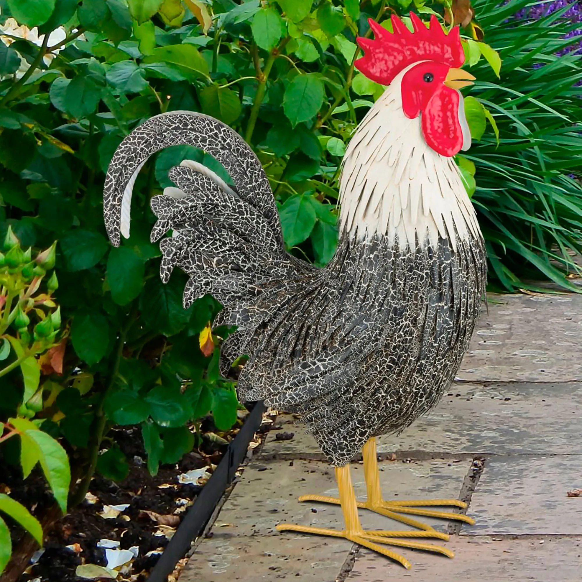Place the Murray Rooster in any space to capture the elegance of barnyard beauty. This metal rooster sculpture showcases extraordinary detailing with a brilliantly painted red comb, wattle, and golden beak along with hundreds of striking black and white crackle painted feathers. This exotic Murray rooster is weather- and fade-resistant and is built to withstand the elements. Indoor or outdoor year-round use. Measures 15"Wx7.5"Dx20.5"H.