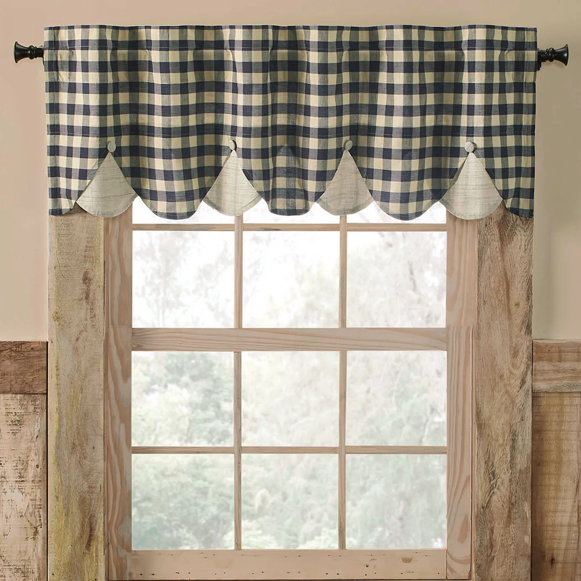 Lined Window Treatments have plaid motifs and a 3.25" rod pocket. Curtain Pair has a scalloped bottom edge and includes tiebacks. The attached valance has a plaid design with a natural underlay with accent buttons. Curtains are available in two sizes. Scalloped Valance has a natural underlay with accent buttons.
