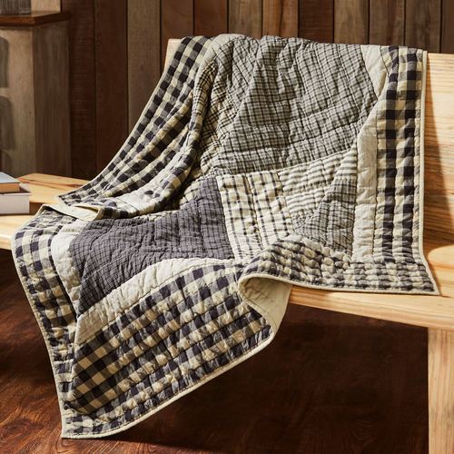 The My Country Plaid Patchwork Throw Blanket is a true testament to cozy farmhouse style. This cotton throw has a true patchwork pattern with plaid and stripe designs. Colors include shades of midnight blue, black, and natural. The pre-washed and preshrunk throw has channel quilting, bound ends, and a solid natural backing. Throw has a 2.75" rod pocket on the back for hanging. Measures 50"x60". Fill is cotton. Machine washable. Imported.