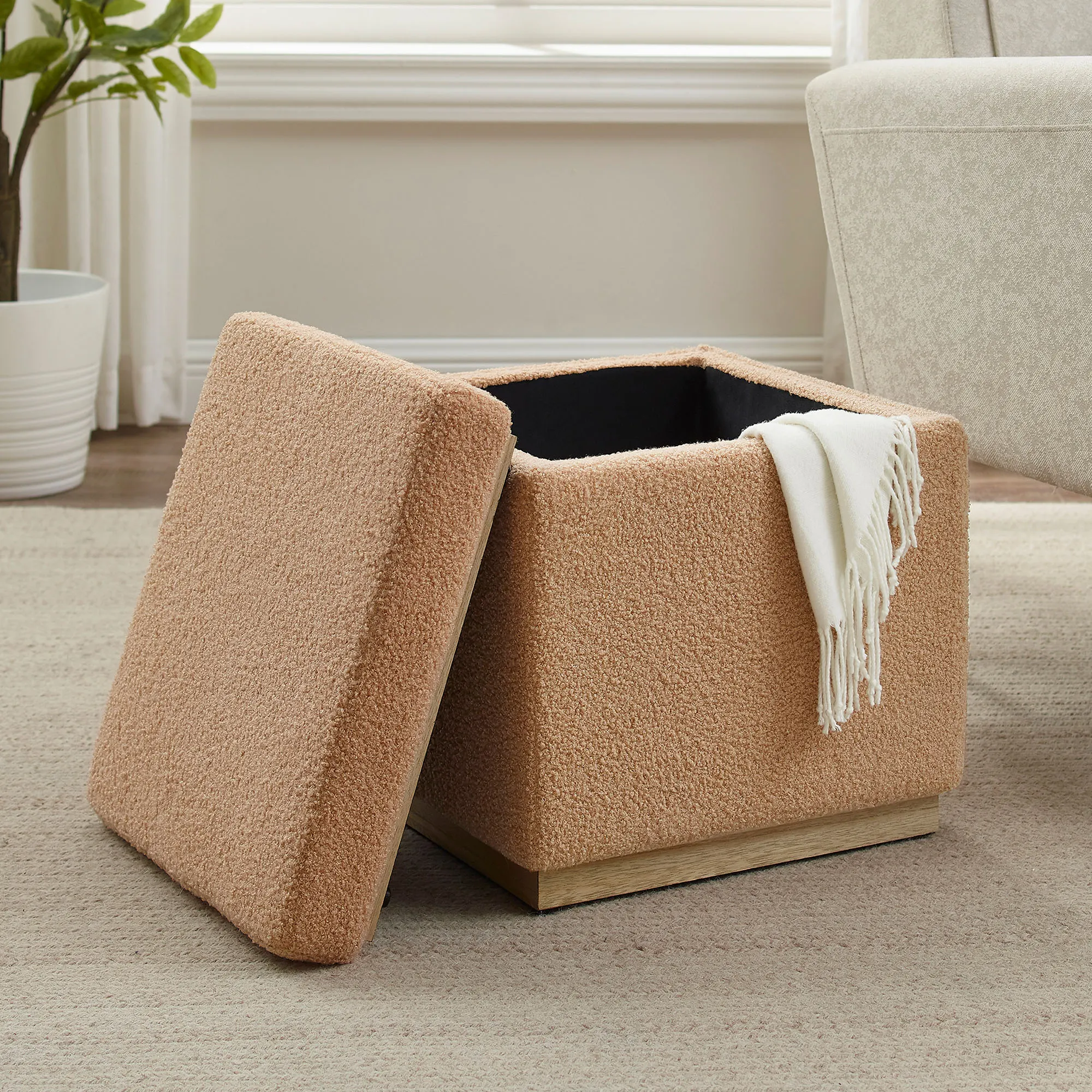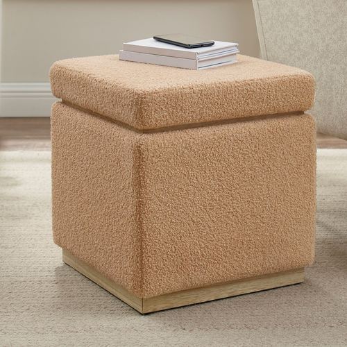 The Mya Square Storage Ottoman has a boucle fabric covering, pinewood trim, a felt lining, and foam fill.