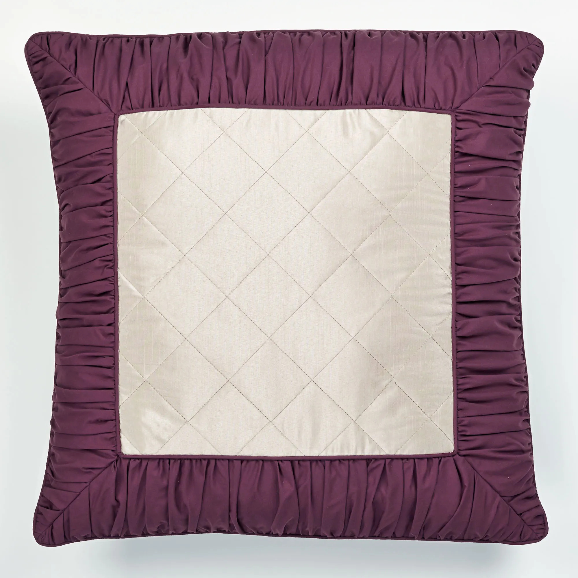 CLOSEOUT PRICES! Rest with the sweetest of dreams with the polyester Mystic Garden Bedding Accessories. Piped European Sham has a center of fawn poly silk with a pintuck design bordered by shirred plum; French back closure. Piped Square Pillow, 18", has embroidered florals in plum, mulberry, aqua mist, and golden yellow on fawn poly silk bordered by shirred plum. Round Pillow, 15", has plum ruffles. Tailored Rectangle Pillow, 14"x21", has bands of shirred plum and poly silk fawn with a pintucked lattice design. Pillow fill is polyester. Machine wash the European sham. Spot clean the pillows. Imported.