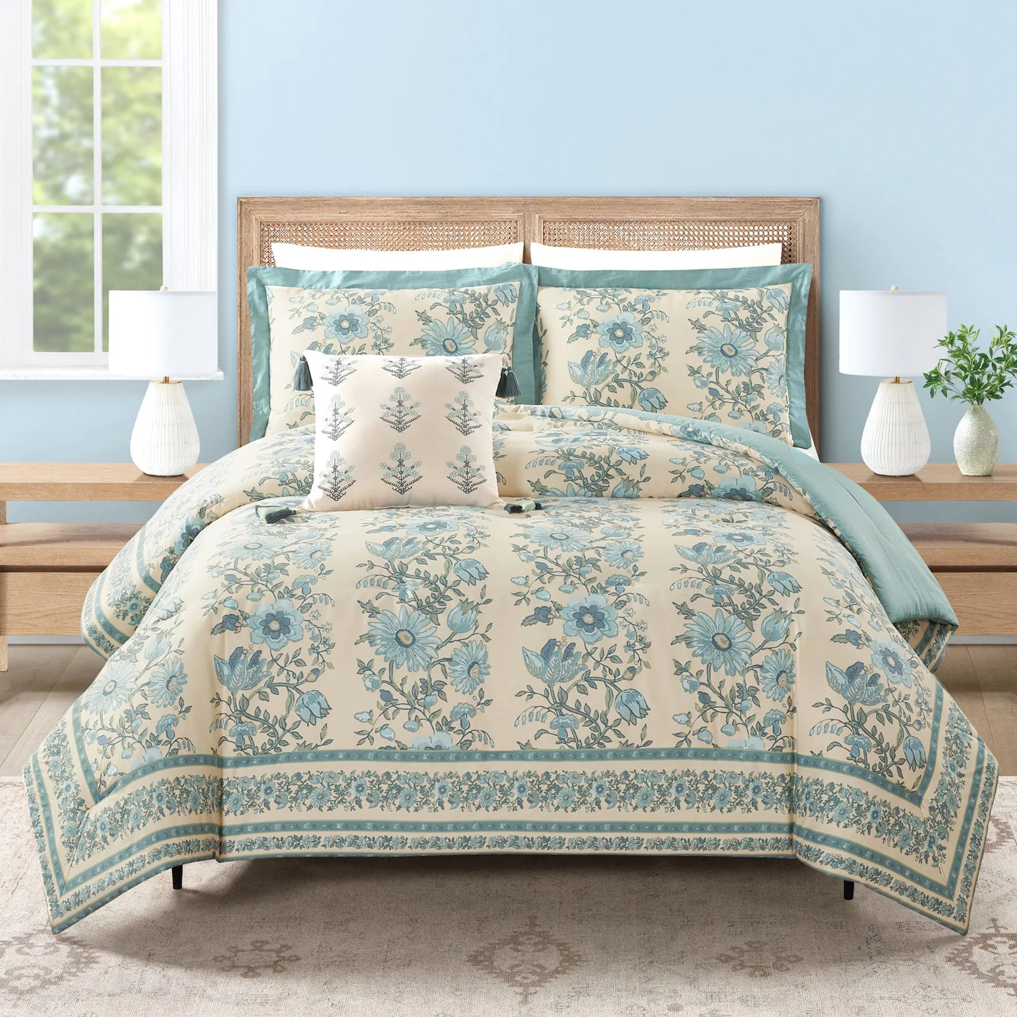Mystic Moss Blue Green and Ecru Floral Mini Comforter Set Bedding by Spartina 449