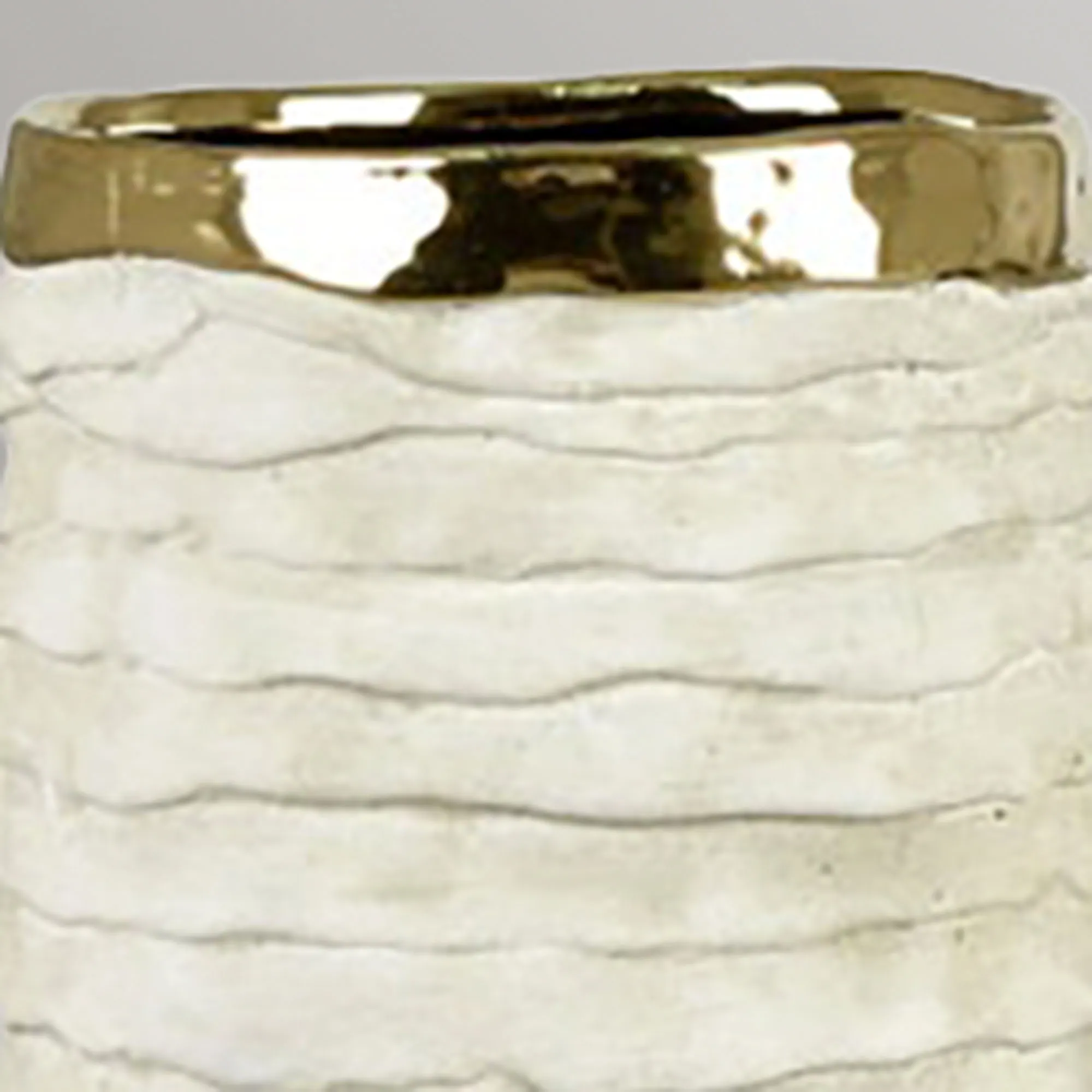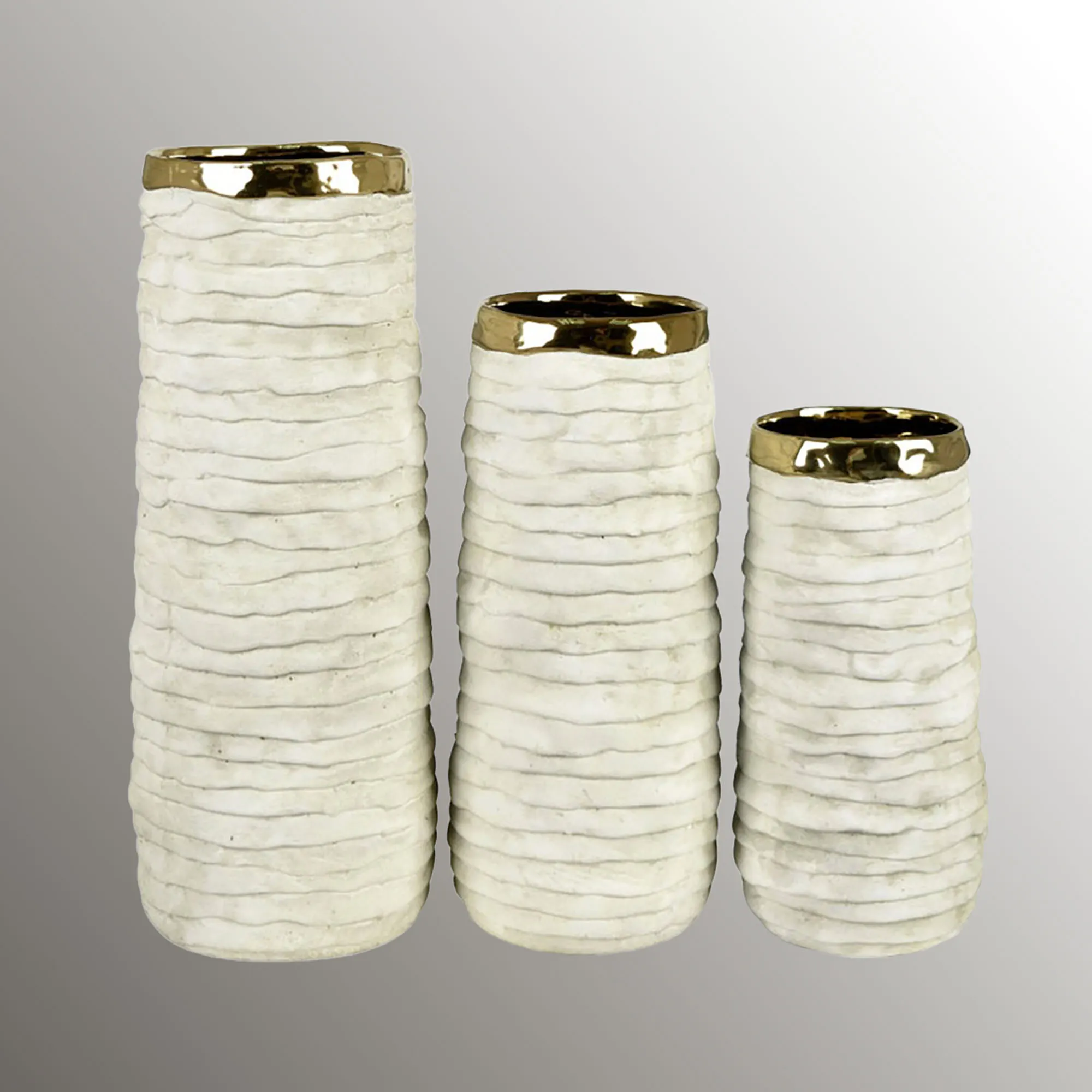 Textured, horizontal designs add intrigue to the Nadia Vase Set. These ceramic vases have an antique ivory finish, wavy stripes, and shiny gold tops. For decorative use only. Small is 4"dia.x10"H, medium is 4"dia.x12.5"H, and large is 5"dia.x15.5"H. Set weighs 11 lbs.