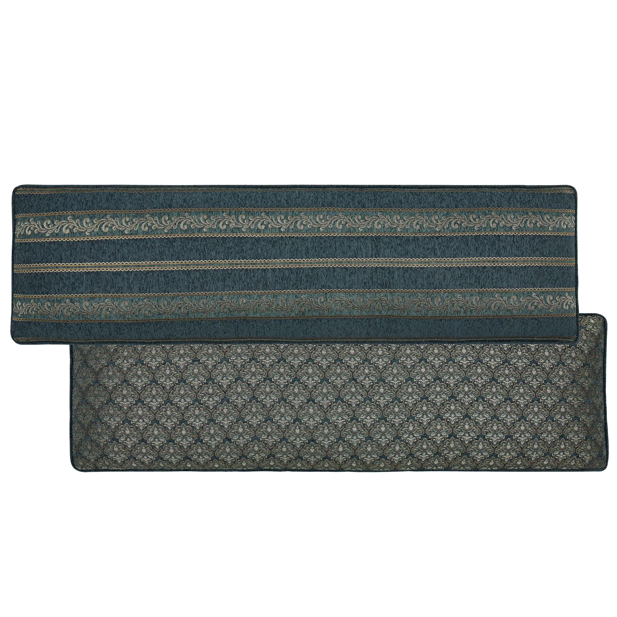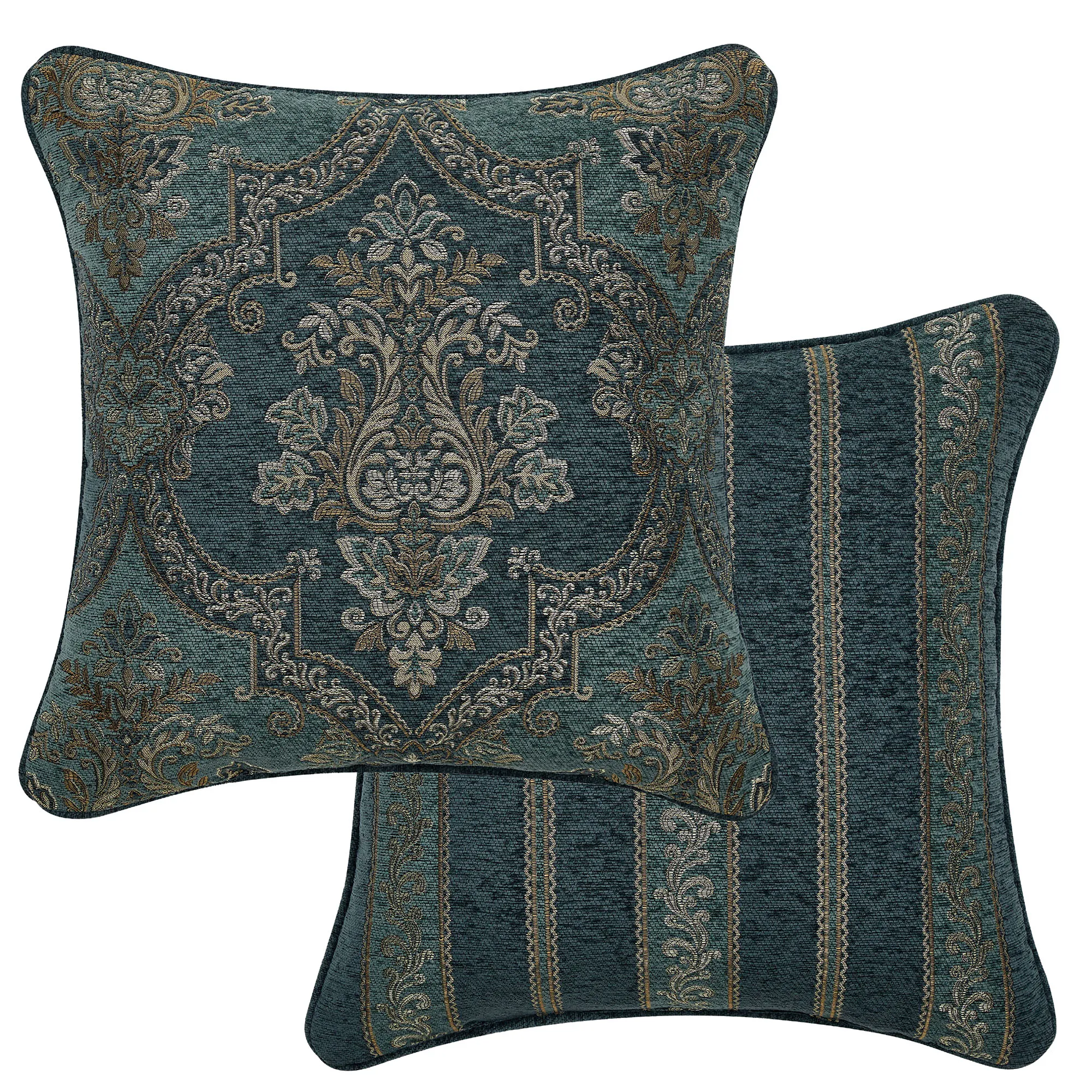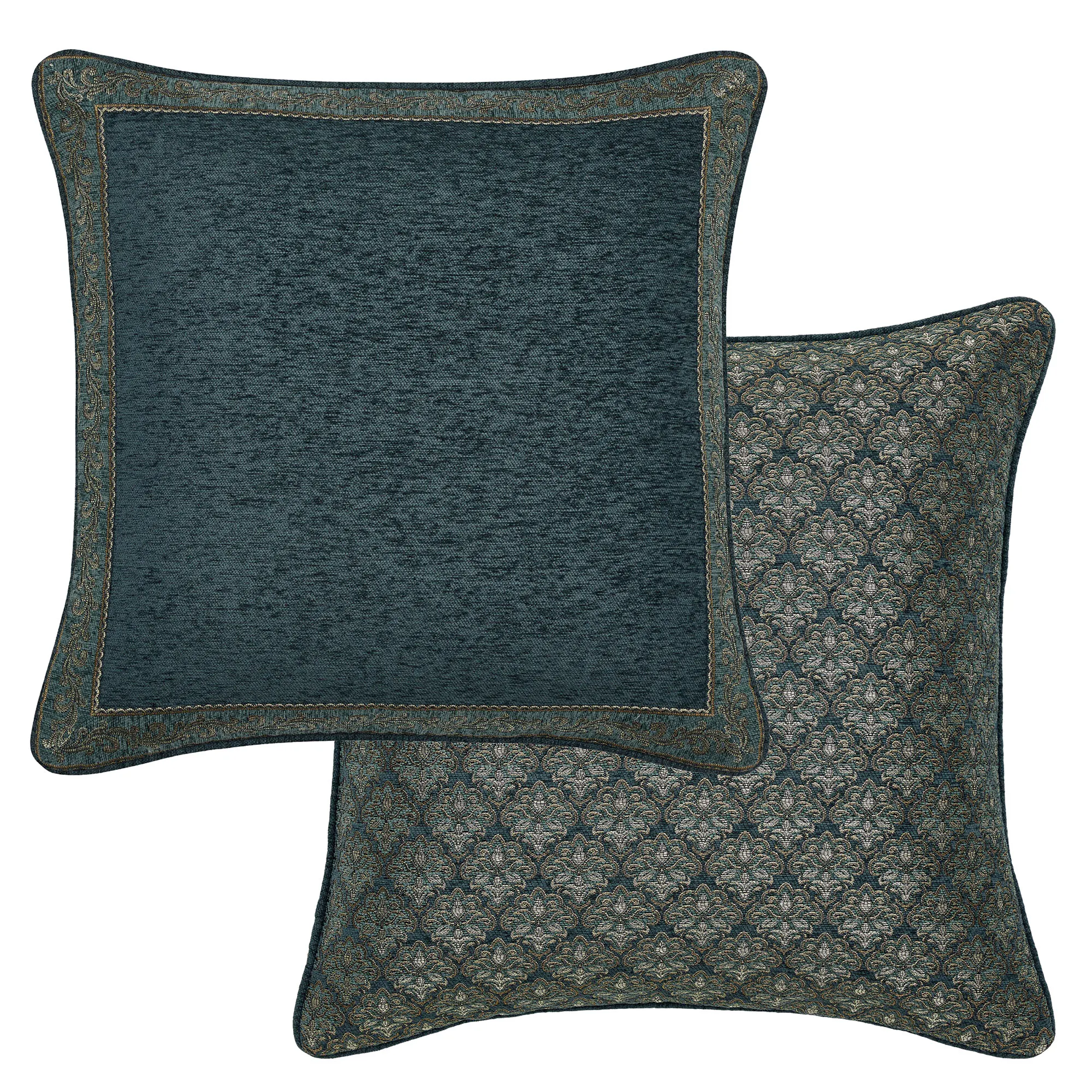 The piped European Sham is dark teal chenille with a woven leafy scroll frame and reverses to woven mini damask designs; zipper closure.
