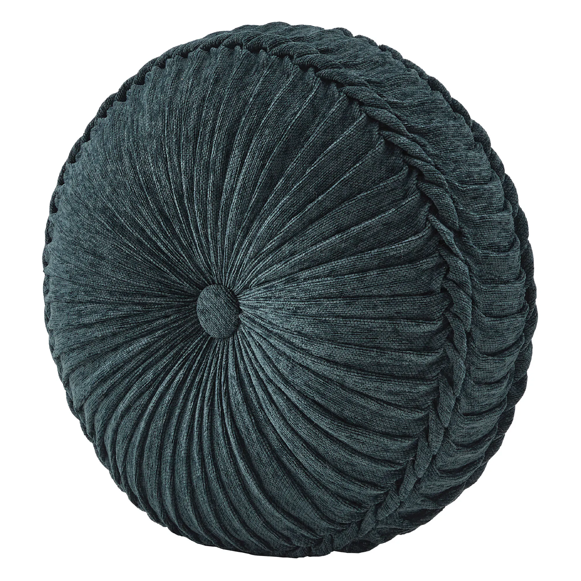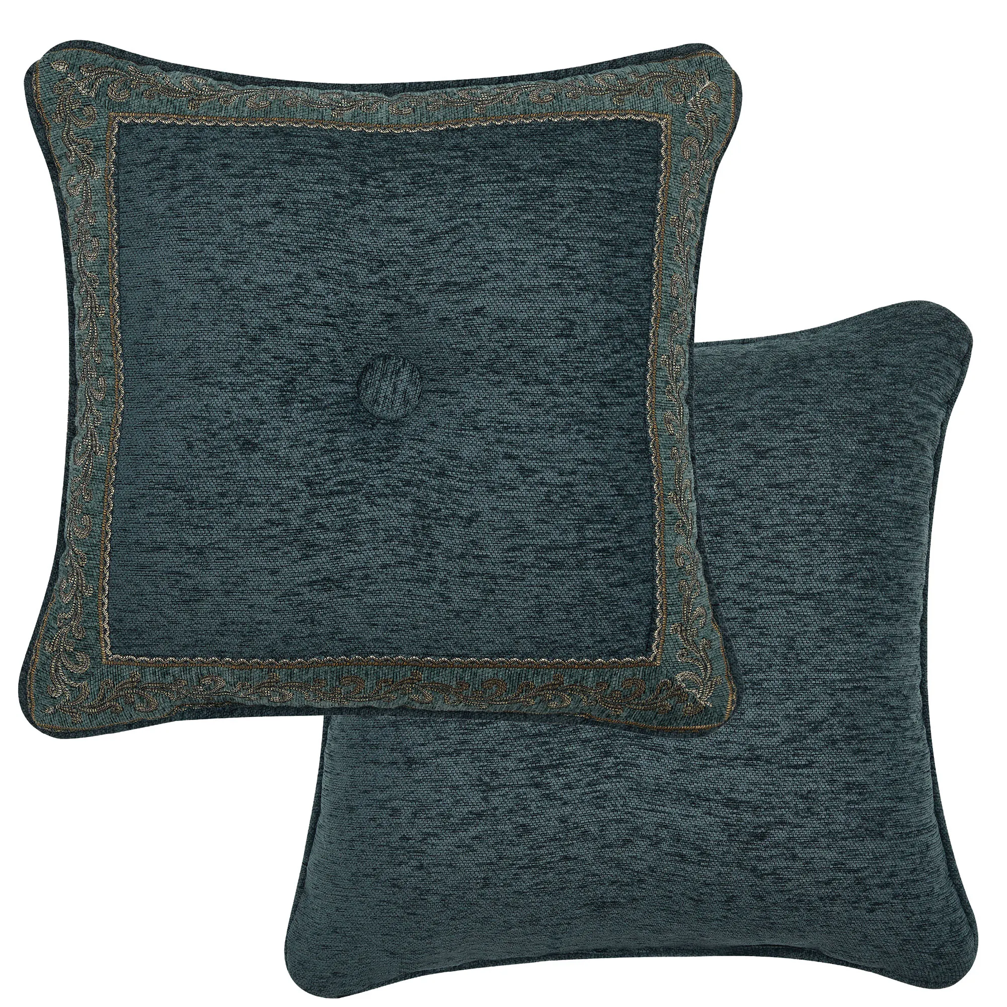 Pillows: Spot clean. The reversible, handmade Round is dark teal chenille with pleats, a button tuft in the center, and a 3" side gusset. The piped Tasseled Rectangle has woven mini damask designs on dark teal chenille and a tassel on each corner; reverses to dark teal chenille. The piped 20" Square has woven and chenille motifs and reverses to woven stripes and leafy scrolls on dark teal chenille. The piped 18" Square is dark teal chenille with a center button tuft and a woven leafy scroll frame; reverses to dark teal chenille. The piped Jumbo Rectangle has woven stripes and leafy scrolls on dark teal chenille and a 2.5" side gusset; reverses to woven mini damask designs on dark teal chenille.