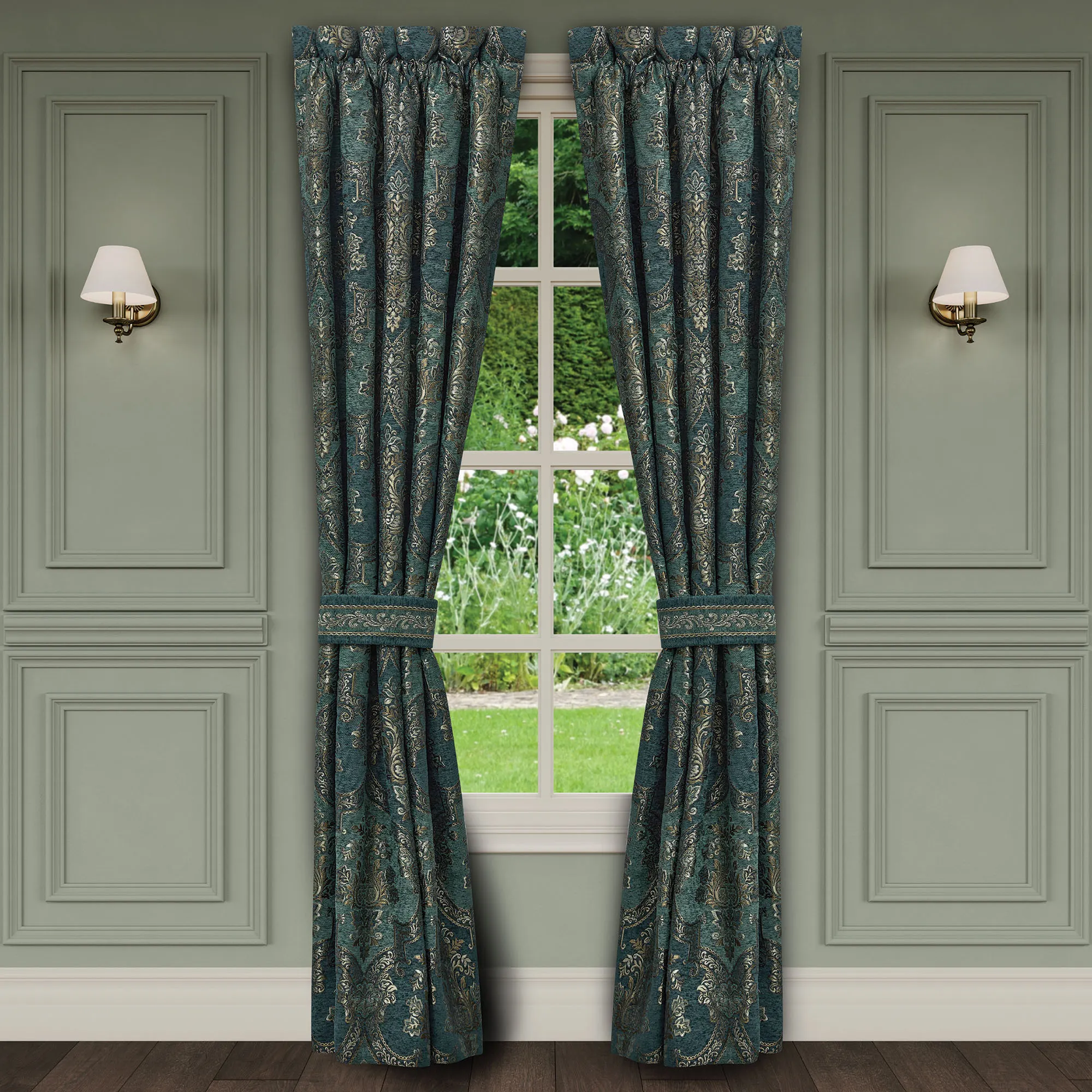 The lavish allure of the Nancy Bedding displays a rich and elegant look. This polyester ensemble, from J. Queen New York, features woven-jacquard and chenille damask and leafy scroll designs. Colors include shades of jade, dark teal, and gold.
