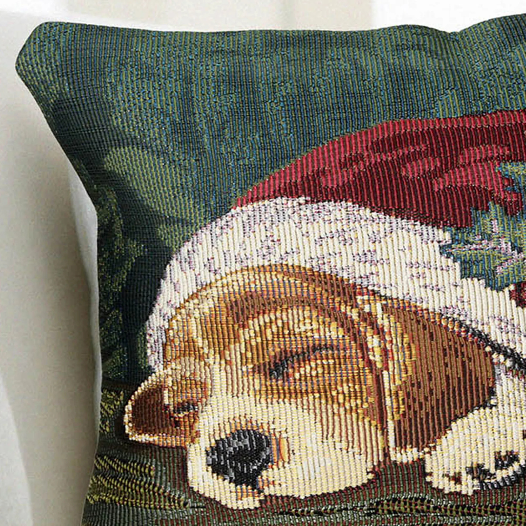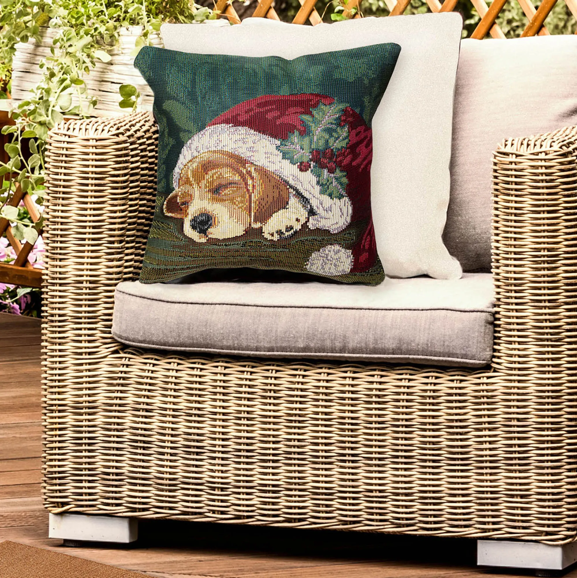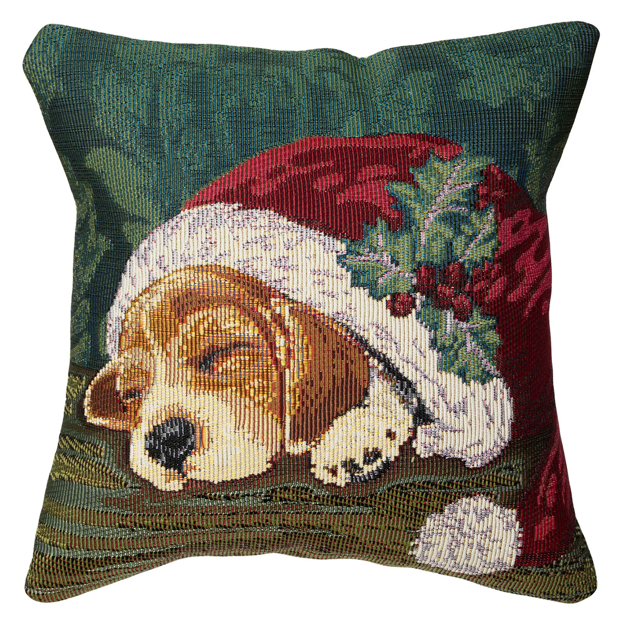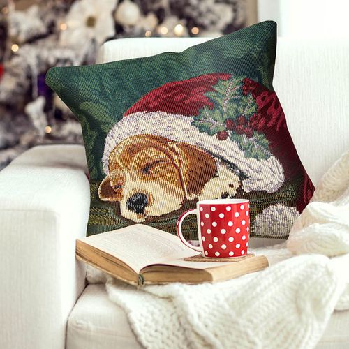 After all of the Christmas morning excitement, a Nap in a Cap is exactly what this beagle pup needs. From artist Liora Manne's Everywear(TM) Collection, the holiday decorative pillow features a weather- and fade-resistant, power-loomed polypropylene/polyester-blend design of an adorable puppy sleeping in Santa's classic red and white hat with holly accents. UV-stabilized hues of green, ivory, burgundy, crimson, tan, and beige complete the darling scene. Tailored cover has a beige polyester back, hidden zipper closure, and polyester fiber fill. Indoor or outdoor seasonal use. Square pillow is 18". Hand wash the cover; spot clean the insert. Imported.