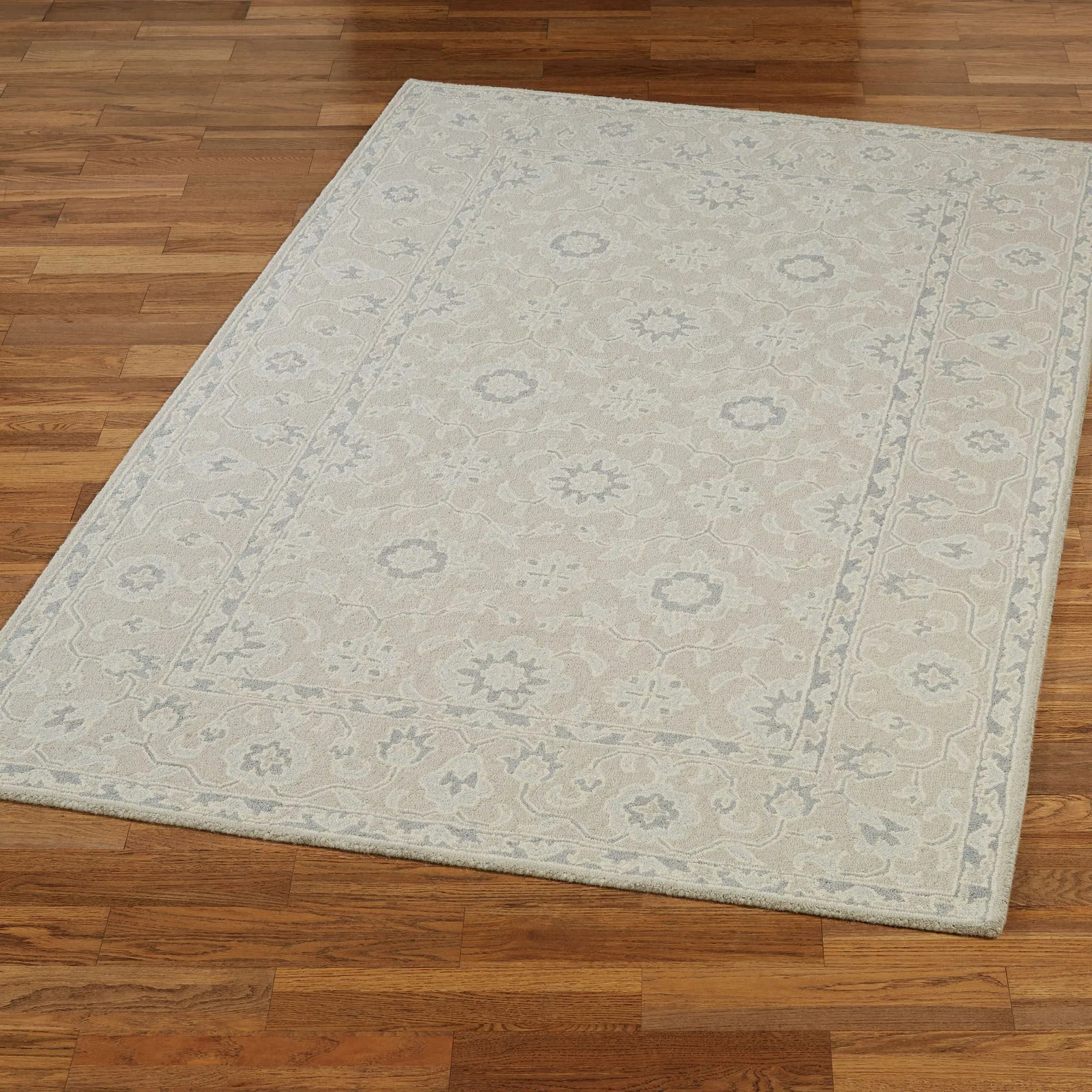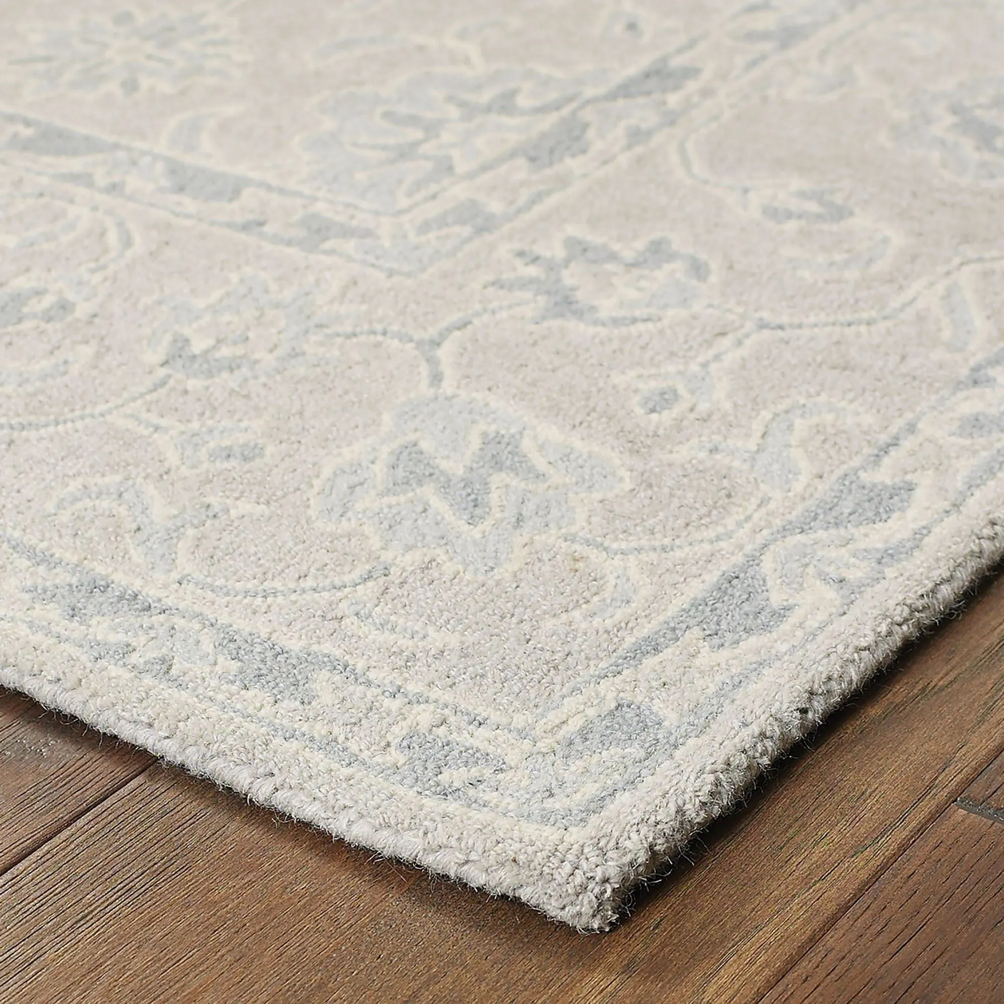 Neutral gray and blue shades add subtle beauty to the Narsis Rug. Hand-tufted of wool, this area rug, .09" thick, features traditional designs and has cloth-covered latex backing. Rug is 5'x8'. We recommend professional cleaning by a rug cleaner. Imported.