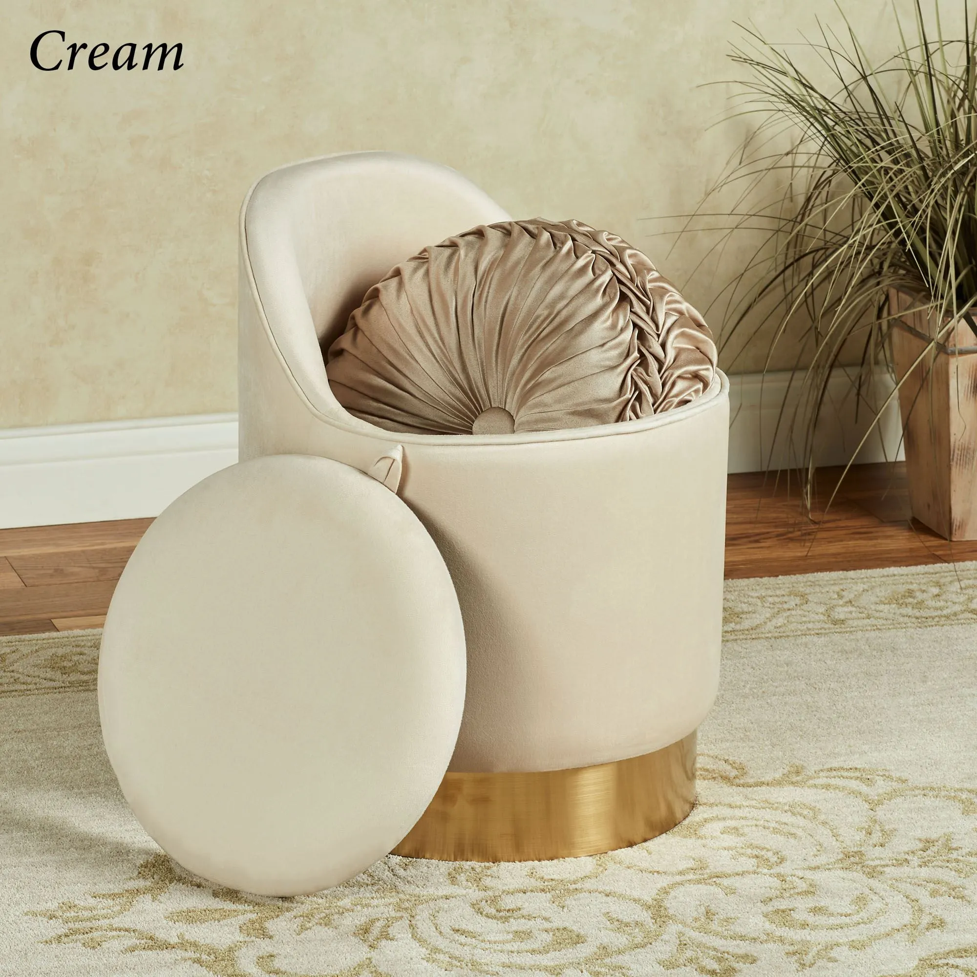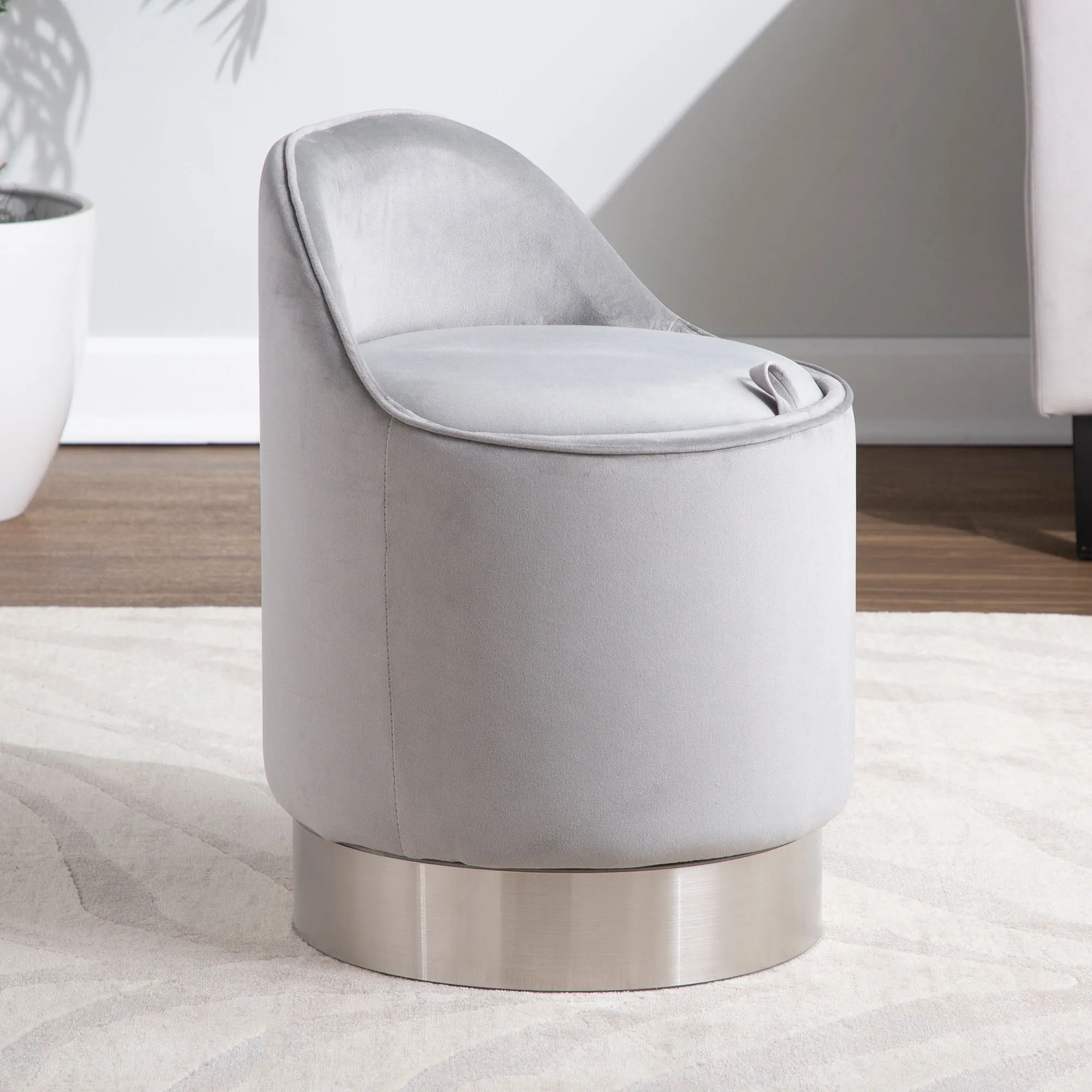 You are sure to love the fashion-forward style of the Natalia Upholstered Vanity Chair. This luxurious swiveling vanity chair has soft velvet upholstery and piping. The bottom base has metal trim. Cream has a gold band, and Gray has a silver band. Seat opens to reveal hidden storage, 13.75"dia.x12"H. Seat-to-floor height is 18.5". Overall, measures 16.5"dia.x23.5"H; weighs 14 lbs. Spot clean. Imported.