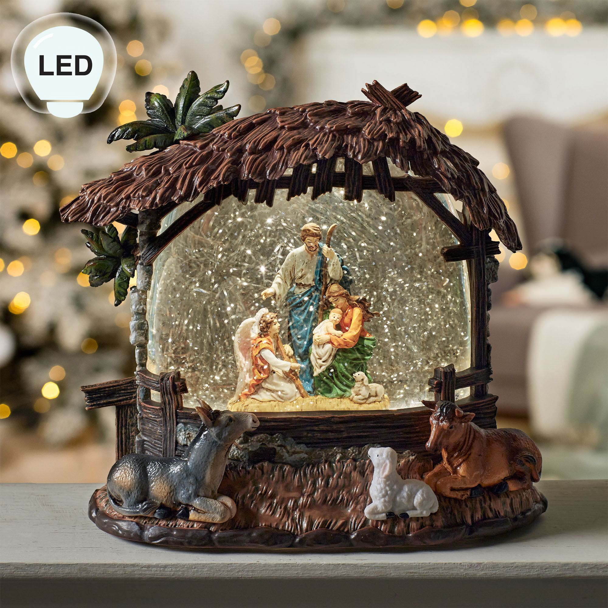 The Nativity Scene LED Lighted Water Globe captures a beautiful scene. Crafted from molded polymer, the glitter globe accent resembles the outside of a manger with brown thatched accents, two green palm trees, a donkey, a lamb, and a cow. Glitter shimmers and swirls around the Holy Family, kneeling angel, and lamb in the liquid-filled interior, which also glows from the built-in LED light. Requires three of your AA batteries or your adapter for use with the included USB cord. Operates via an off/six-hour timer switch on the bottom. Overall, the heartfelt decorative nativity accent measures 8.5"Wx4.5"Dx8"H.