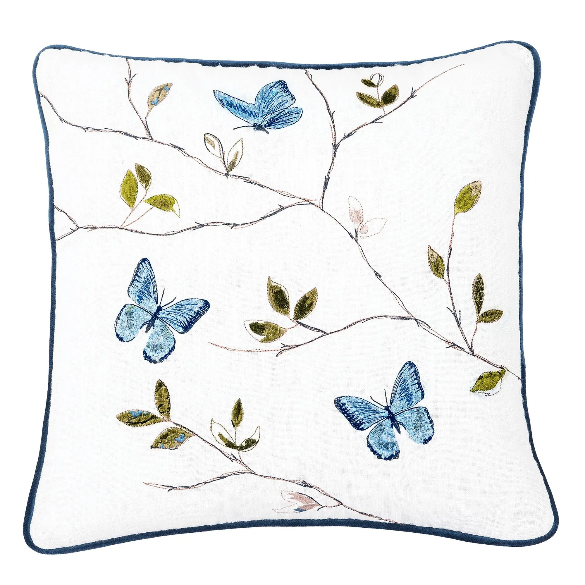 Pillows have piped edges. Fill/insert is polyester. Spot clean. Imported/USA. Velveteen Square has accent stitches. Embroidered Rectangle is velveteen with three birds on a branch in silver. Embroidered Square is an ivory woven linen/cotton blend with color-coordinating butterflies and a reaching branch; zipper closure.