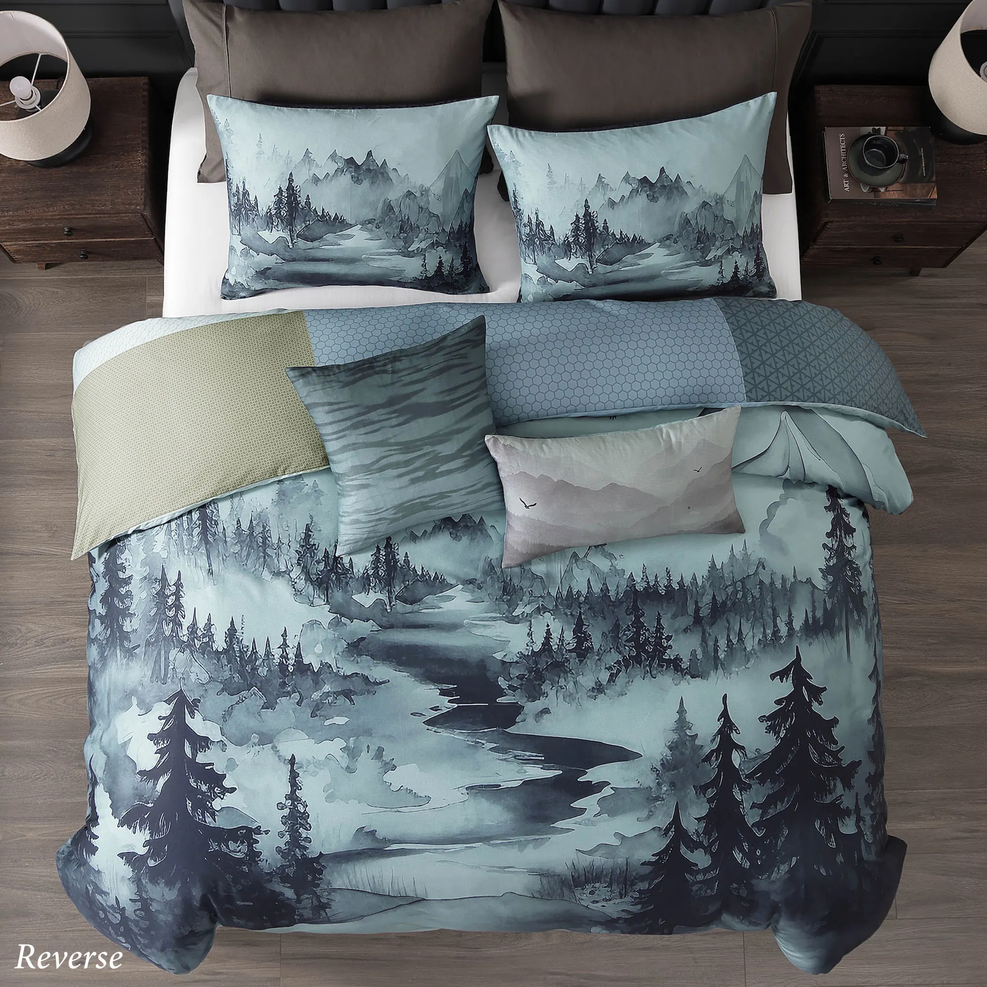 With an artistic flair, the comforter reverse features a watercolor-inspired depiction of misty mountains, a trailing stream, and lush pine trees in tonal dusty teal. Shams mimic the comforter's reversible design; zipper closure.