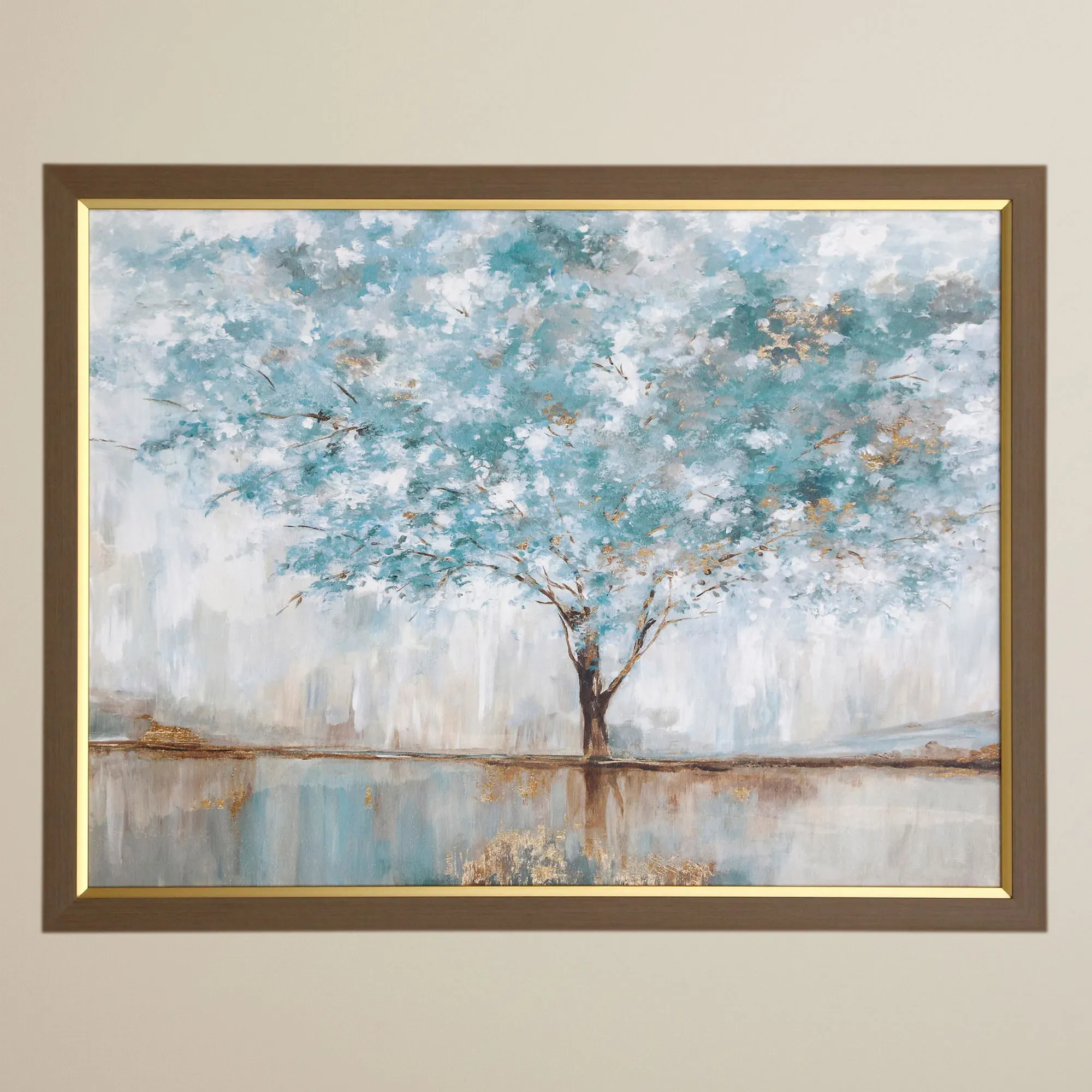 The Nature Reflections Framed Wall Art showcases natural beauty. This picturesque scene is a textured print with a gel coating and features a tree with leaves reflecting on the water. Colors include blue, aqua, and gold. The polystyrene frame is brown and gold. Measures 40"Wx2"Dx31"H.