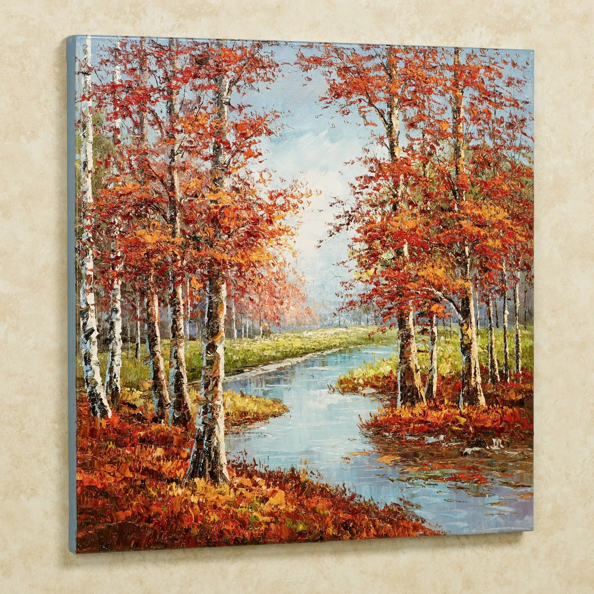 Sometimes Nature's Retreat offers just as much breathtaking beauty and relaxation as a trip to the spa. A handpainted oil on canvas, this autumn wall art features a brilliant view of nature, including birch trees losing their vermillion leaves, a winding trickling stream, and a clear blue sky dotted with white clouds. Due to the handpainted nature of this item, minor variations may occur. Gallery-wrapped over a wood frame, the canvas measures 30"sq.x1.5"D.