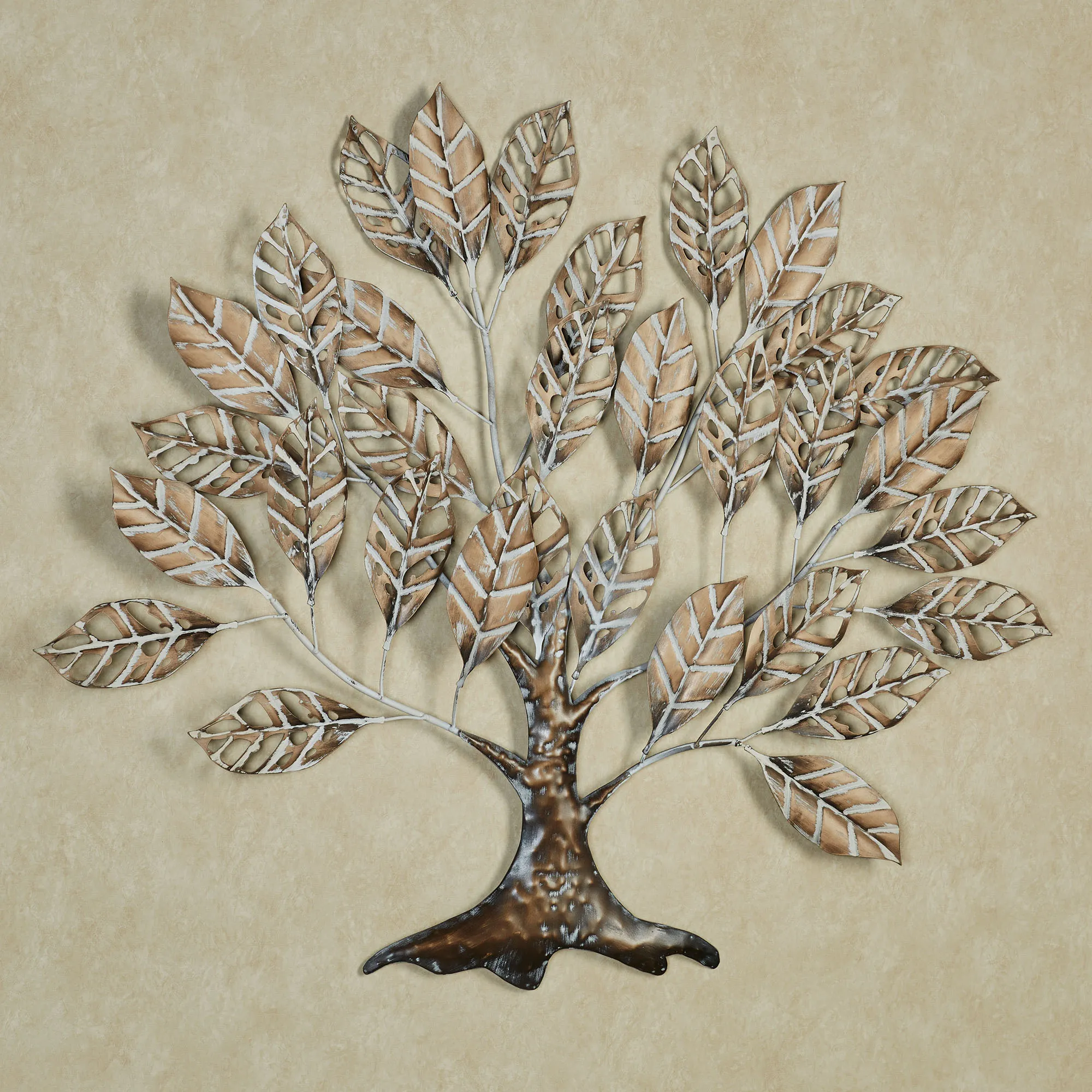 Enjoy the stillness of Nature's Solitude. This metal wall art features a majestic tree with openwork and lined leaves finished in burnished gold and a brown trunk. The leaves and branches have whitewashed accents. Tree wall sculpture measures 35.5"Wx1.5"Dx31.5"H.