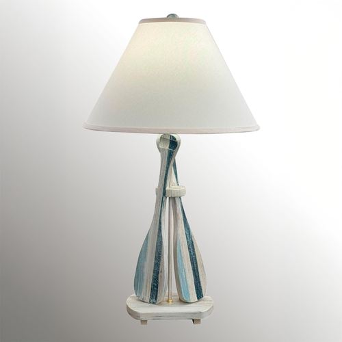 Navigate your coastal style with the Nautical Stripe Paddle Table Lamp. The solid poplar wood table lamp features two paddles painted by hand in nautical light blue, dark blue, and antique white with distressing. The fabric shade is ivory. UL listed. Requires one 100W max. 3-way bulb, not included. Measures 18"dia.x31"H, including the 1.5" dia. finial; weighs 10 lbs.