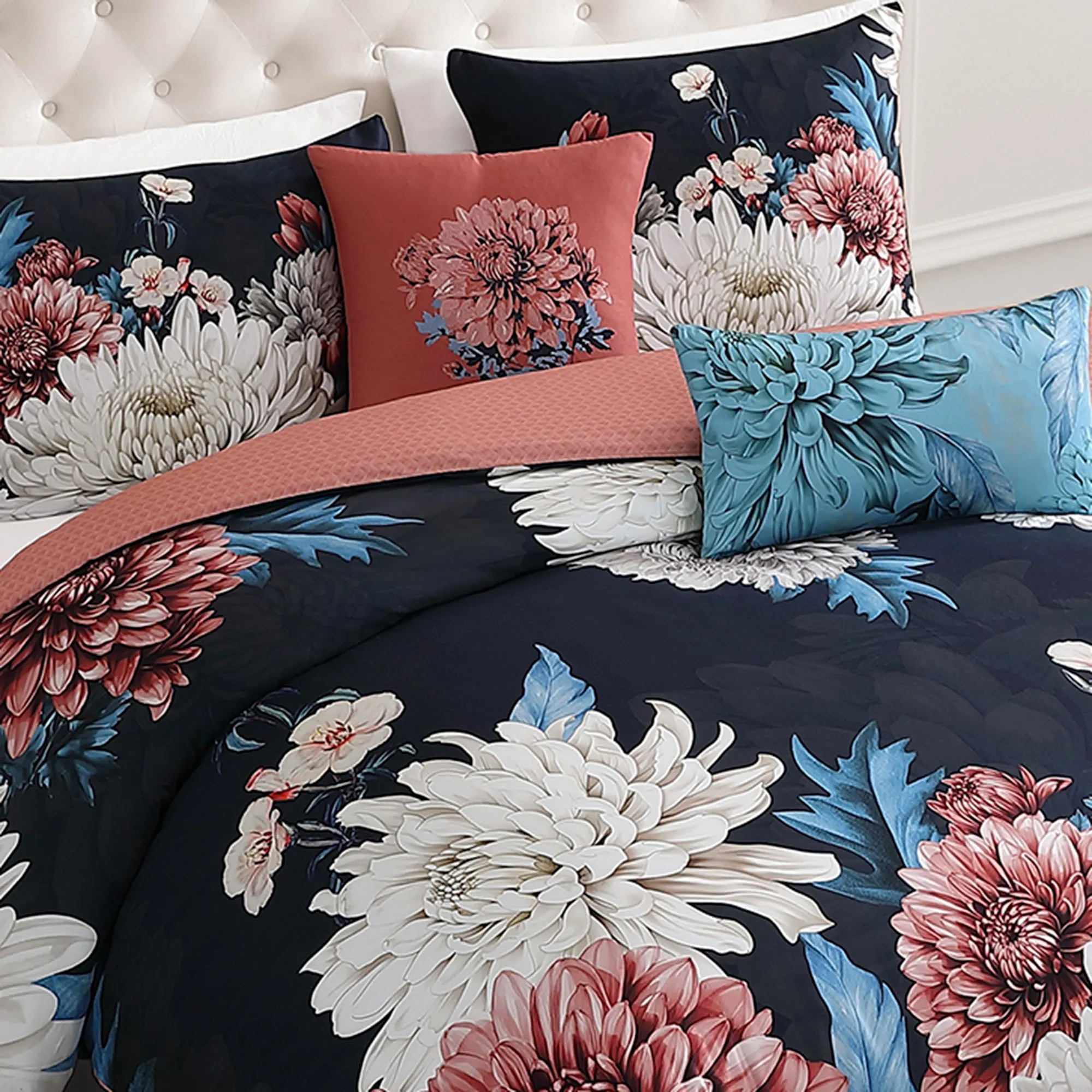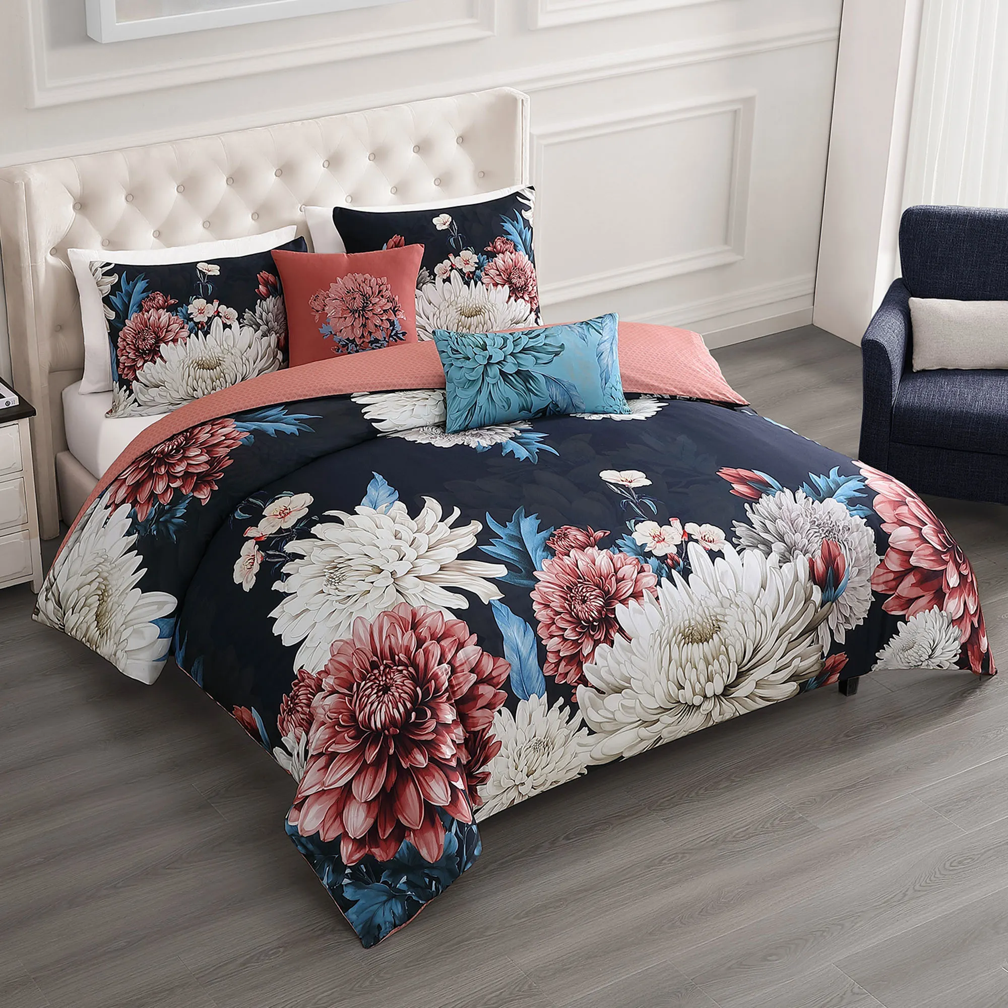 Navy Mums Reversible Floral 5 pc Comforter Bed Set