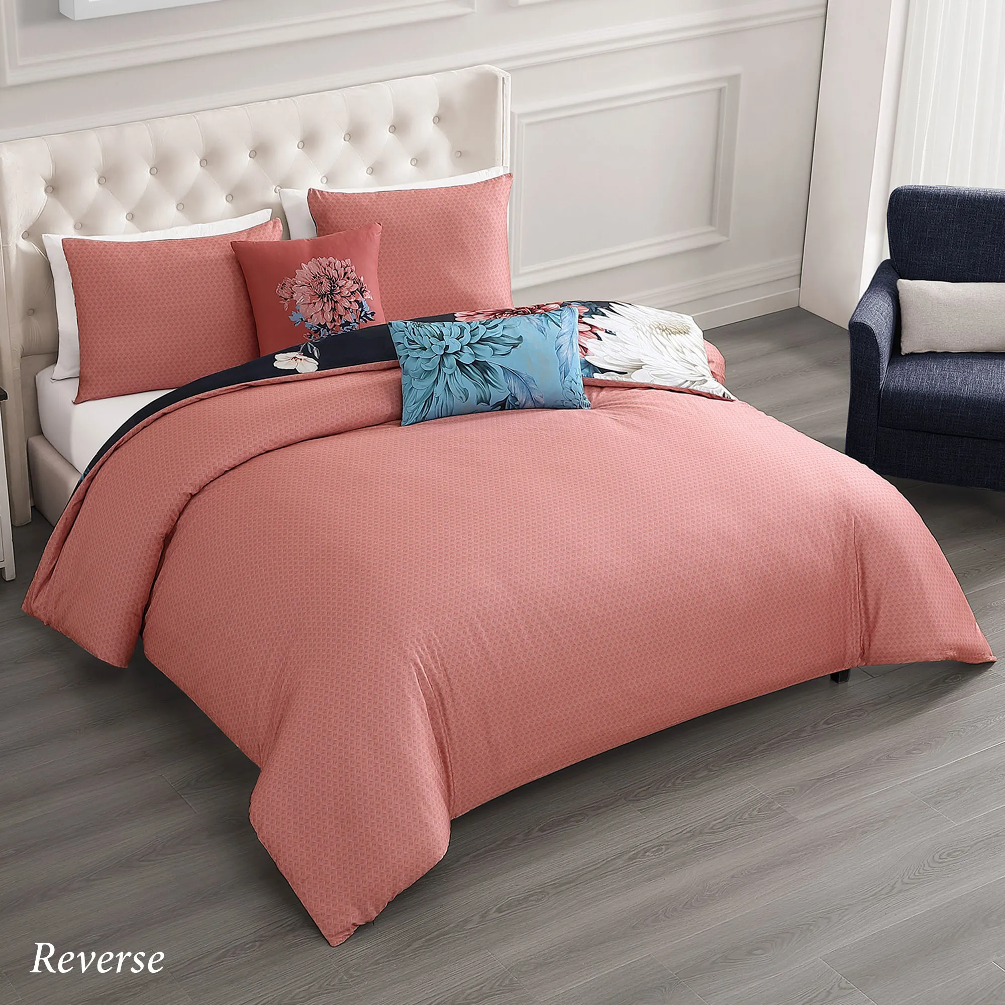 Surround yourself with the intense beauty of the Navy Mums. The 5-piece Bed Set includes an oversized comforter, 2 shams, and 2 accent pillows. This striking cotton sateen bedding features an oversized mum flower print in shades of blue, white, rose, salmon pink, and desert coral on a deep navy ground. The tailored comforter reverses to a desert coral wave print on a salmon pink background. Click on the Details tab to read about the other items. Fill is polyester. Machine washable; spot clean the pillows. Imported.